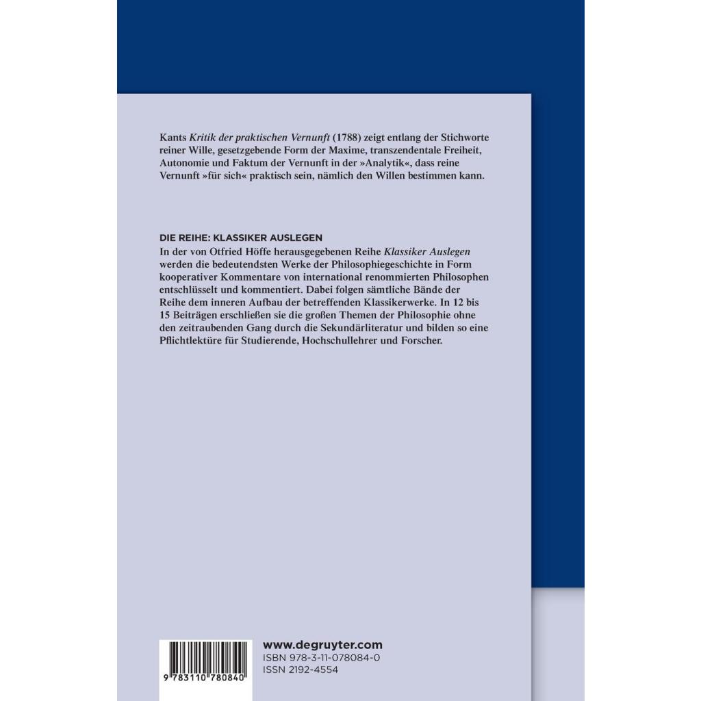 Kants Kritik der praktischen Vernunft (1788) steht zu Unrecht oft im Schatten der Kritik der reinen Vernunft und der Grundlegung zur Metaphysik der Sitten . Tatsächlich sind die Grundelemente der Kantischen Moralphilosophie im Gegensatz zu vielen Thesen der ersten Kritik bis heute weitgehend anerkannt, und erst der Nachweis der zweiten Kritik, dass Freiheit wirklich ist, macht "den Schlussstein von dem ganzen Gebäude eines Systems der reinen, selbst der spekulativen Vernunft aus". Entlang der Stichworte reiner Wille, gesetzgebende Form der Maxime, transzendentale Freiheit, Autonomie und Faktum der Vernunft zeigt Kant in der "Analytik", dass reine Vernunft "für sich" praktisch sein, nämlich den Willen bestimmen kann. Die "Dialektik" sichert den Ideen von der Existenz Gottes und der Unsterblichkeit der Seele objektive Realität und untersucht das Verhältnis von theoretischer und praktischer Vernunft. Die "Methodenlehre" schließlich skizziert eine Theorie moralischer Erziehung, die für den heutigen Ethikunterricht noch aktuell ist. Die zwölf Beiträge dieses kooperativen Kommentars, der anlässlich des 300. Jubiläums Immanuel Kants in einer 3., überarbeiteten Auflage erscheint, rekonstruieren die Argumente eines Schlüsseltextes der Moralphilosophie und prüfen die sachliche Überzeugungskraft. Mit Beiträgen von: Karl Ameriks, Reinhard Brandt, Eckart Förster, Otfried Höffe Allen W. Wood Christoph Horn, G. Felicitas Munzel, Onora O'Neill Annemarie Pieper, Friedo Ricken, Nico Scarano.