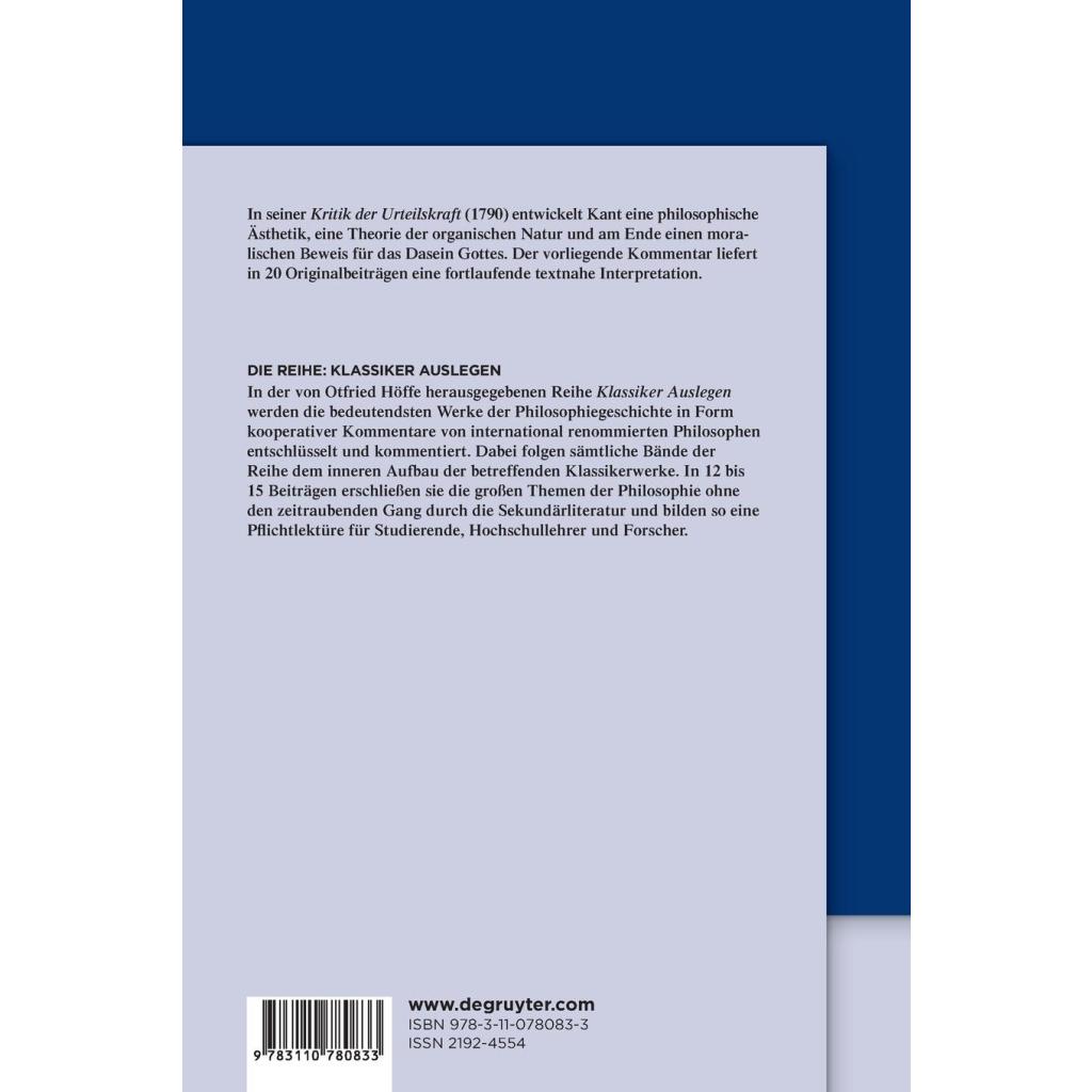 Kant entwickelt in der Kritik der Urteilskraft eine philosophische Ästhetik, eine Theorie der organischen Natur. Die beiden scheinbar heterogenen Gegenstandsbereiche sind durch das Prinzip der reflektierenden Urteilskraft, die Idee der Zweckmäßigkeit, verbunden, die der Mensch sowohl bei der Reflexion über die schönen Gegenstände der Natur und der Kunst als auch bei seiner Erforschung der organischen Natur zugrunde legt. Da sich alle Zwecke zuletzt auf den Endzweck des Menschen als moralisches Wesen beziehen, übersteigt die dritte "Kritik" schließlich die Bereiche von Kunst und Natur und berührt Fragen der Moralphilosophie und der Moraltheologie. Zusätzlich entdeckt Kant im subjektiven Vermögen der Urteilskraft jenes Bindeglied unter den menschlichen Gemütskräften, das einen architektonischen Übergang zwischen den Naturbegriffen des Verstandes in der ersten und dem Freiheitsbegriff der Vernunft in der zweiten "Kritik" ermöglicht und die theoretische und die praktische Philosophie in einem einzigen philosophischen System vereinigt. Der vorliegende kooperative Kommentar bietet eine textnahe, fortlaufende Interpretation der "Kritik der Urteilskraft". Für die 3. Auflage anlässlich des 300. Jubiläums Immanuel Kants wurden alle Beiträge überarbeitet und auf den neuesten Forschungsstand gebracht. Mit Beiträgen von: K. Ameriks, J. Bojanowski, R. Brandt, G. Cunico, M. Foessel, E. Förster, C. Fricke, H. Ginsborg, P. Giordanetti, I. Goy, O. Höffe, A. Kablitz, G. Kohler, S. Mathisen, B. Recki, J. Rivera de Rosales, S. Roth und E. Watkins.