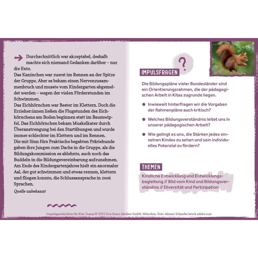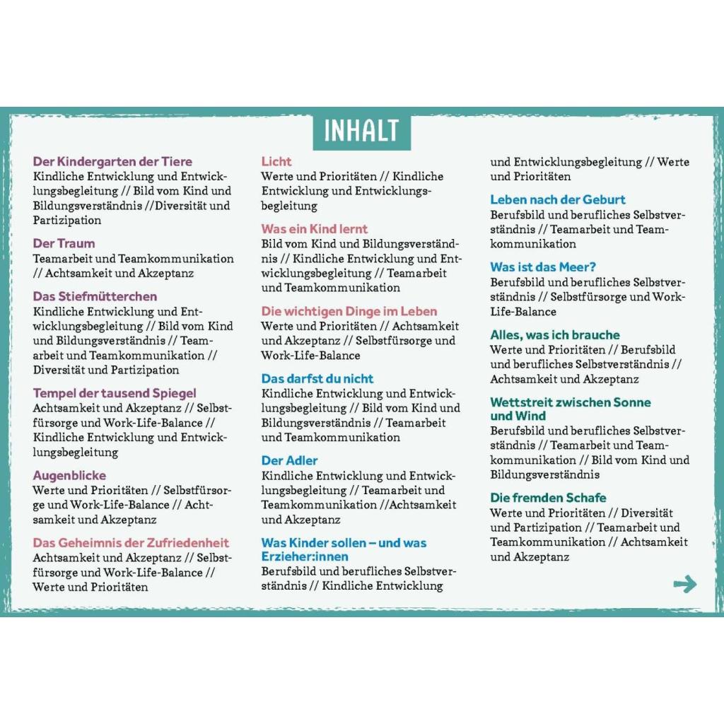 | Keyword: | berufsbild; bild von kindern; bildkarten; bildungsverständnis; impulsfragen; pädagogische grundhaltung; qualitätsstandards; reflexion pädagogik; reflexionsfragen; rolle der erzieherin; stärken und schwächen erzieher; teambesprechung; teamkonflikte; weisheitsgeschichten; weiterbildung erzieher |
