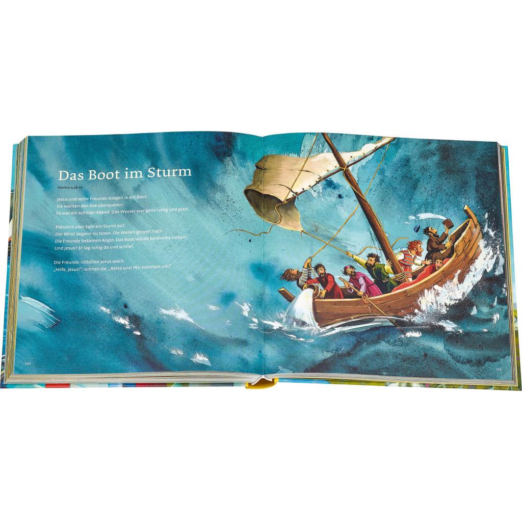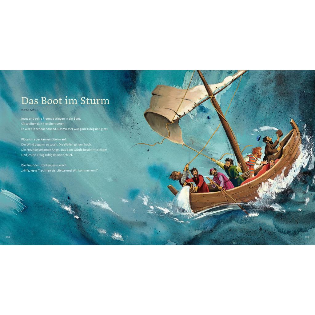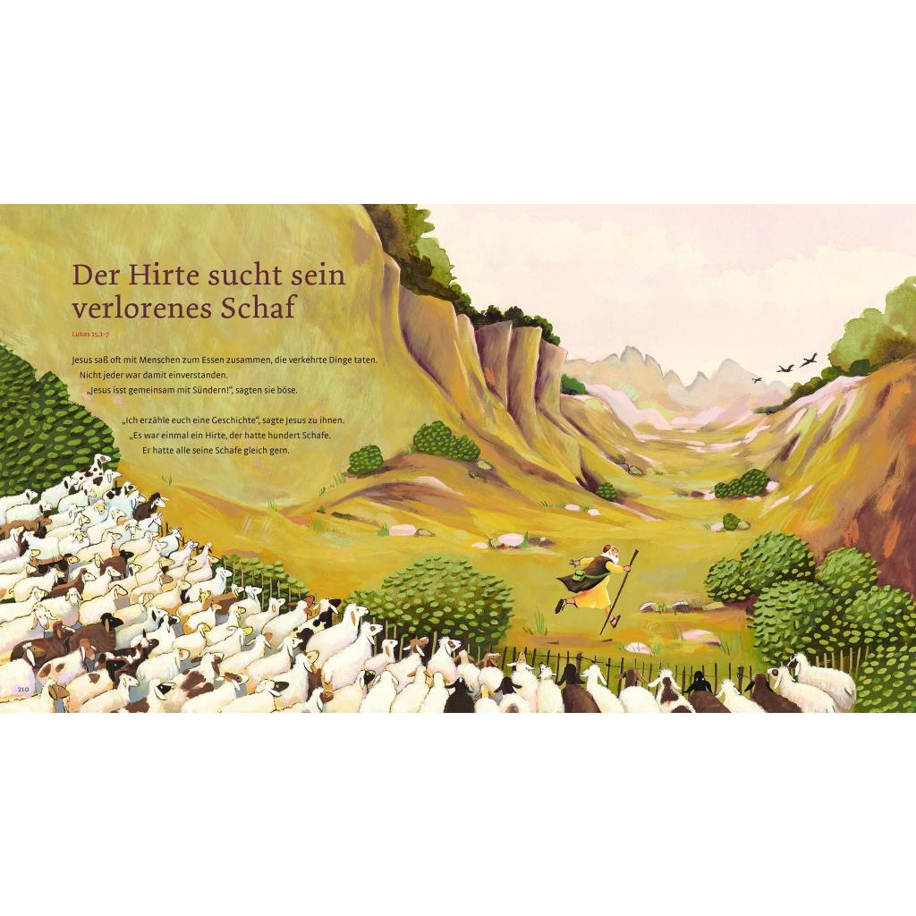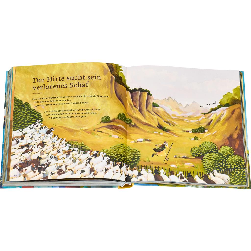 Verständlich und voller Leben: die Bibel als Bilderbuch Wer die Bibel wie ein Kind betrachtet, erkennt sofort, dass sie uns in prächtigen Farben spannende Geschichten vom Leben und vom Glauben erzählt - die Bibel ist ein großes Bilderbuch! Die Autorin Tanja Jeschke und die Künstlerin Marijke ten Cate haben deshalb eine Kinderbibel gestaltet, die durch das Zusammenspiel von Text und Bild nah an den biblischen Geschichten bleibt und dennoch leicht verständlich ist. So ermöglichen sie Kindern ab 4 Jahren eine unmittelbare Begegnung mit den großen Ereignissen des Alten und Neuen Testaments. Gleichzeitig steckt diese illustrierte Bibel für Kinder voller Leben und alltäglicher Situationen, so dass sie sich direkt darin wieder finden! - Ein Bibelbilderbuch zum Vorlesen oder Miteinander-Anschauen - ausgezeichnet mit dem Christlichen Buchpreis 2015 als beste Kinderbibel! - Neue Erzählungen, überarbeitete Geschichten: Die Neuauflage des beliebten christlichen Kinderbuchs ist noch besser auf die Bedürfnisse von Familie, Kindergarten und Gemeinde abgestimmt - Brillante Illustrationen: Marijke ten Cate hat auch für diese Ausgabe wieder farbenfrohe doppelseitige Bilder gemalt, die die Beziehungen und Gefühle besonders sichtbar machen - So können schon kleine Kinder die ganze Vielfalt der Bibel entdecken! Bibelgeschichten für Kinder: Zum Vorlesen in der Familie, im Kindergarten oder in der Gemeindearbeit Von der Erschaffung der Erde bis zur Offenbarung des Johannes: Altes und Neues Testament werden für Kinder verständlich erklärt, die Auswahl der Geschichten wurde verantwortungsvoll getroffen. Biblische Geschichten, die vielleicht schon aus der Kita oder dem Kindergottesdienst bekannt sind, werden ebenso aufgegriffen wie weniger bekannte Erzählungen. Neu aufgenommen wurden aus dem Neuen Testament das Gleichnis vom verlorenen Schaf und die Erzählung von der Sturmstillung. Aus dem Alten Testament ist die Erzählung von Nehemia nicht mehr enthalten. Die großformatigen Bilder, die sich wie ein Panorama entfalten, sind mit viel Liebe zum Detail gestaltet. So können die Kleinen auch beim wiederholten Betrachten immer wieder Neues entdecken. Mit klaren, verständlichen Texten und intensiv leuchtenden Bildern voller Emotionen eröffnet sich Kindern mit dieser Bibel ein altersgemäßer Zugang zum Wort Gottes! Enthaltene Geschichten: ¿ Gott macht die Erde ¿ Der Baum im Garten ¿ Noah baut die Arche ¿ Der höchste Turm ¿ Gott verspricht einen Sohn ¿ Jakob und Esau ¿ Josef in Ägypten ¿ Gott erhört sein Volk ¿ Lass mein Volk gehen ¿ Rahab hilft ¿ Rut und Noomi auf dem Weg ¿ Hanna bekommt einen Sohn ¿ David und Goliat ¿ Ester, die schöne Königin ¿ Daniel in der Löwengrube ¿ Jona läuft vor Gott davon ¿ Jesus wird geboren ¿ Jesus im Tempel ¿ Jesus wird getauft ¿ Jesus auf dem Hochzeitsfest ¿ Jesus spricht mit den Menschen ¿ Zachäus, der Zöllner ¿ Das Boot im Sturm ¿ Jesus erweckt ein Mädchen vom Tod ¿ Alle werden satt ¿ Ihr sollt einander lieb haben! ¿ Der Hirte sucht sein verlorenes Schaf ¿ Der verlorene Sohn ¿ Das große Fest in Jerusalem ¿ Jesus lebt ¿ Thomas kann es nicht glauben ¿ Pfingsten ¿ Steh auf und geh! ¿ Die ersten Christen ¿ Paulus macht sich auf die Reise ¿ Alles wird neu! ¿ Nachwort für die Erwachsenen