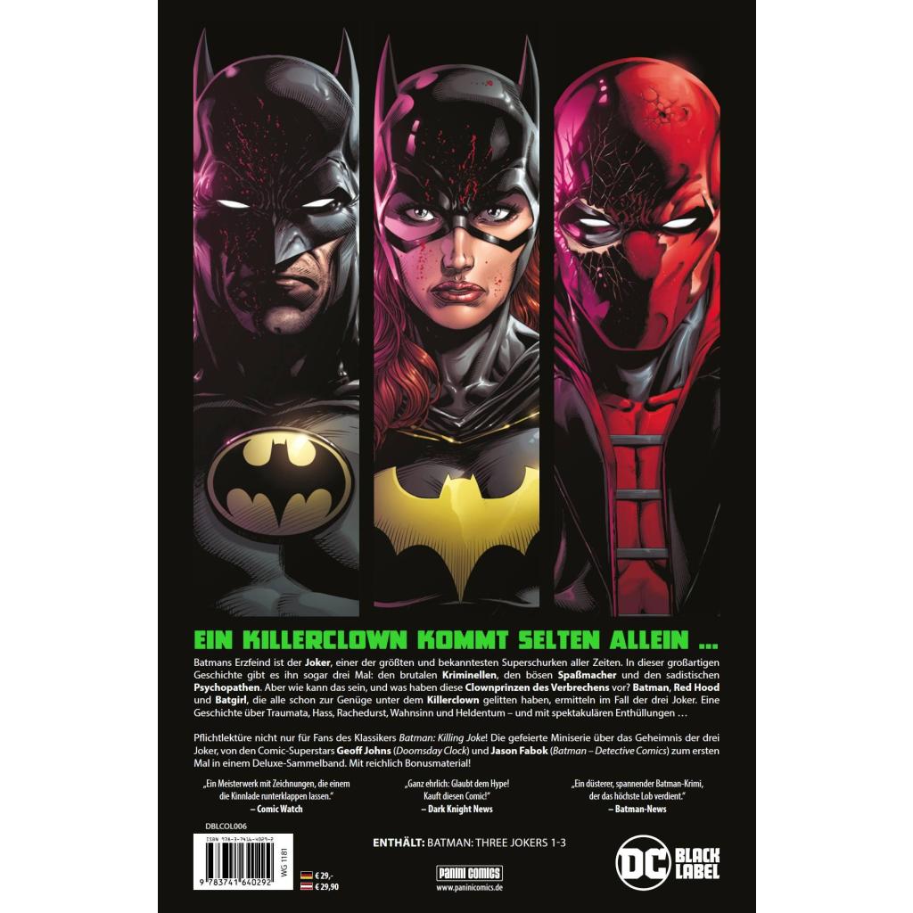 EIN KILLERCLOWN KOMMT SELTEN ALLEIN ... Batmans Erzfeind ist der Joker, einer der größten und bekanntesten Superschurken aller Zeiten. In dieser großartigen Geschichte gibt es ihn sogar drei Mal: den brutalen Kriminellen, den bösen Spaßmacher und den sadistischen Psychopathen. Aber wie kann das sein, und was haben diese Clownprinzen des Verbrechens vor? Batman, Red Hood und Batgirl, die alle schon zur Genüge unter dem Killerclown gelitten haben, ermitteln im Fall der drei Joker. Eine Geschichte über Traumata, Hass, Rachedurst, Wahnsinn und Heldentum - und mit spektakulären Enthüllungen ... Pflichtlektüre nicht nur für Fans des Klassikers Batman: Killing Joke! Die gefeierte Miniserie über das Geheimnis der drei Joker, von den Comic-Superstars Geoff Johns (Doomsday Clock) und Jason Fabok (Batman - Detective Comics) zum ersten Mal in einem Deluxe-Sammelband. Mit reichlich Bonusmaterial! ENTHÄLT: BATMAN: THREE JOKERS 1-3