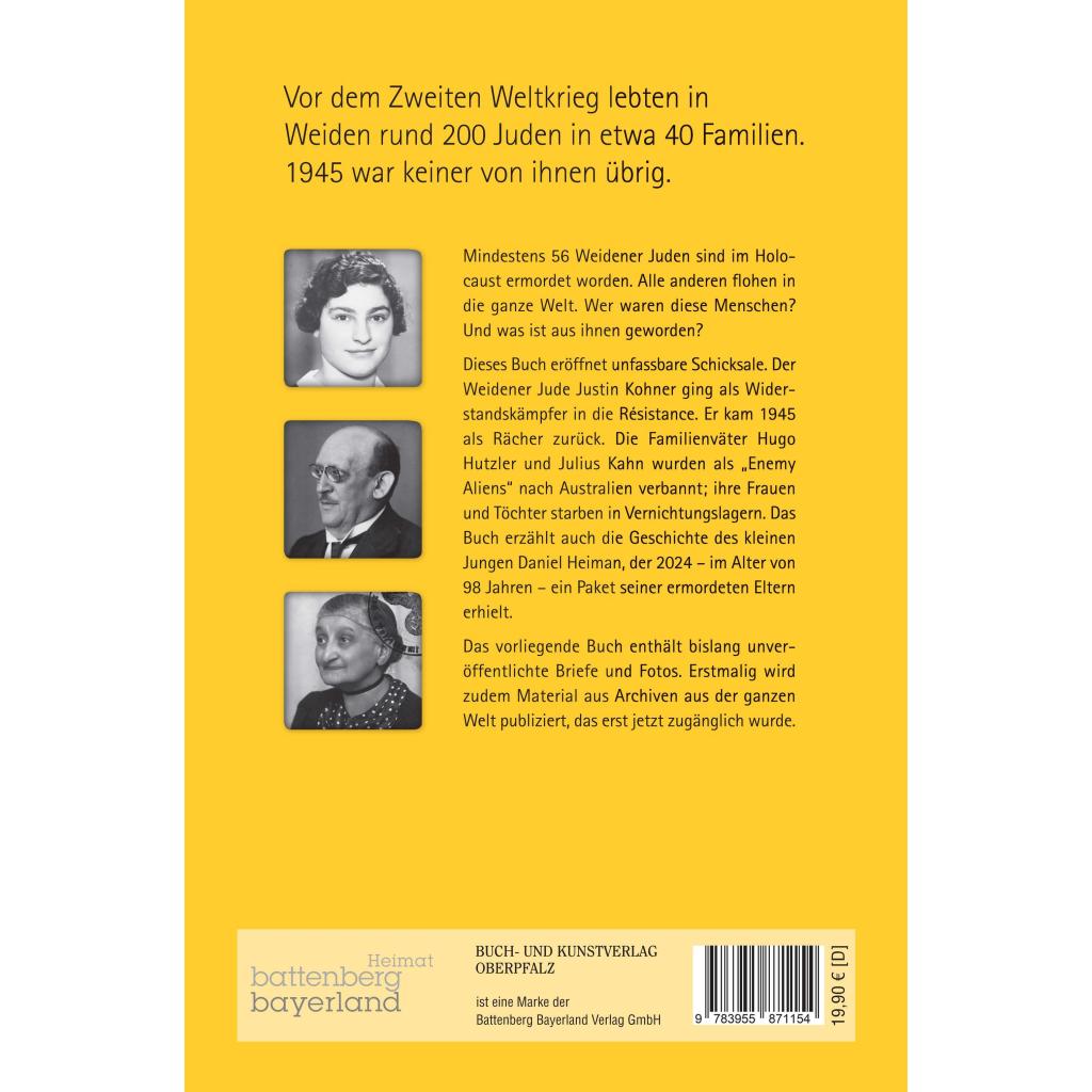 Vor dem Zweiten Weltkrieg lebten in Weiden rund 200 Juden in etwa 40 Familien. 1945 war keiner von ihnen übrig. Mindestens 56 Weidener Juden sind im Holocaust ermordet worden. Alle anderen flohen in die ganze Welt. Wer waren diese Menschen? Und was ist aus ihnen geworden? Dieses Buch eröffnet unfassbare Schicksale. Der Weidener Jude Justin Kohner ging als Widerstandskämpfer in die Résistance. Er kam 1945 als Rächer zurück. Die Familienväter Hugo Hutzler und Julius Kahn wurden als "Enemy Aliens" nach Australien verbannt; ihre Frauen und Töchter starben in Vernichtungslagern. Das Buch erzählt auch die Geschichte des kleinen Jungen Daniel Heiman, der 2024 - mit 98 Jahren - ein Paket seiner ermordeten Eltern erhielt. Das vorliegende Buch enthält bislang unveröffentlichte Briefe und Fotos. Erstmalig wird zudem Material aus Archiven aus der ganzen Welt publiziert, das erst jetzt zugänglich wurde.
