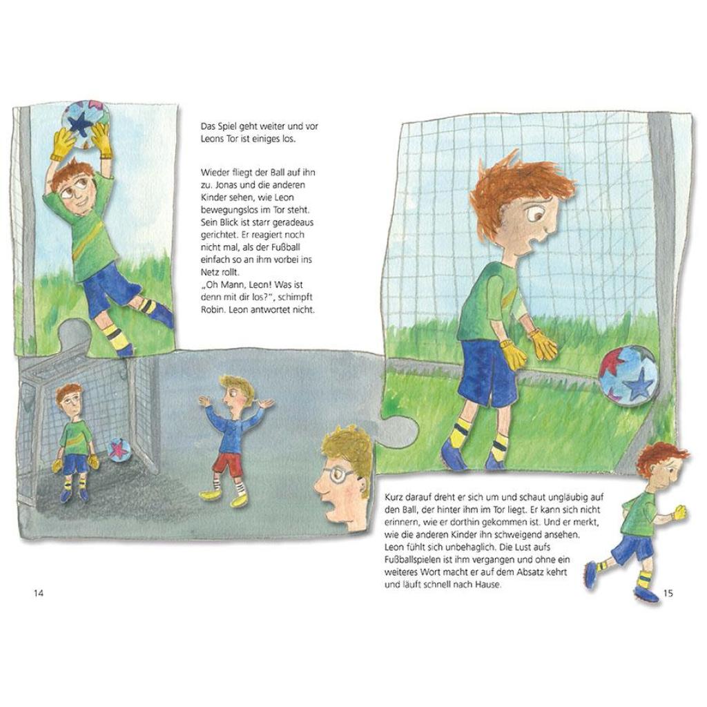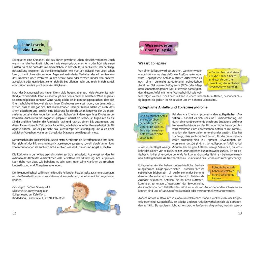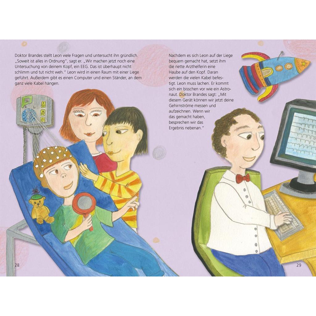 Als Leon gerade ein Referat über Hunde hält, steht er plötzlich bewegungslos und mit starrem Blick da. Seine Lehrerin und Mitschüler wundern sich, doch nach ein paar Sekunden spricht Leon einfach weiter. Er selbst hat von seinem Aussetzer nichts mitbekommen und merkt nur, dass ihn alle so komisch anschauen. Weil auch seinen Eltern aufgefallen ist, dass Leon sehr häufig vor sich hinträumt, gehen sie mit ihm zum Arzt. Und der kann Leon endlich sagen, was los ist: Er hat Epilepsie. Bei der Absence-Epilepsie, von der Leon betroffen ist, handelt es sich um die häufigste Epilepsieform bei Kindern und Jugendlichen. Im Fachteil, der an die Bildergeschichte anschließt, erläutern Norbert van Kampen und Eva Breuer vom Epilepsie-Zentrum Berlin-Brandenburg Wissenswertes für Eltern und ErzieherInnen: Welche Epilepsieformen gibt es und wie werden sie diagnostiziert? Wie wird Epilepsie behandelt? Und wie verhalte ich mich bei einem Anfall?