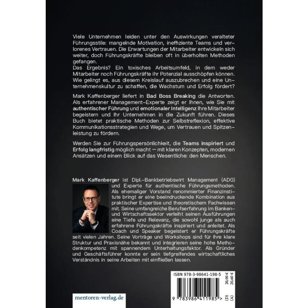 Viele Unternehmen leiden unter den Auswirkungen veralteter Führungsstile : mangelnde Motivation , ineffiziente Teams und verlorenes Vertrauen . Die Erwartungen der Mitarbeiter entwickeln sich weiter, doch Führungskräfte bleiben oft in überholten Methoden gefangen. Das Ergebnis ? Ein toxisches Arbeitsumfeld , in dem weder Mitarbeiter noch Führungskräfte ihr Potenzial ausschöpfen können. Wie gelingt es, aus diesem Kreislauf auszubrechen und eine Unternehmenskultur zu schaffen, die Wachstum und Erfolg fördert? Mark Kaffenberger liefert in ' Bad Boss Breaking ' die Antworten. Als erfahrener Management-Experte zeigt er Ihnen, wie Sie mit authentischer Führung und emotionaler Intelligenz Ihre Mitarbeiter begeistern und Ihr Unternehmen in die Zukunft führen. Dieses Buch bietet praktische Methoden zur Selbstreflexion ,effektive Kommunikationsstrategien und Wege, um Vertrauen und Spitzenleistung zu fördern. Werden Sie zur Führungspersönlichkeit , die Teams inspiriert und Erfolg langfristig möglich macht - mit klaren Konzepten , modernen Ansätzen und einem Blick auf das Wesentliche : den Menschen .