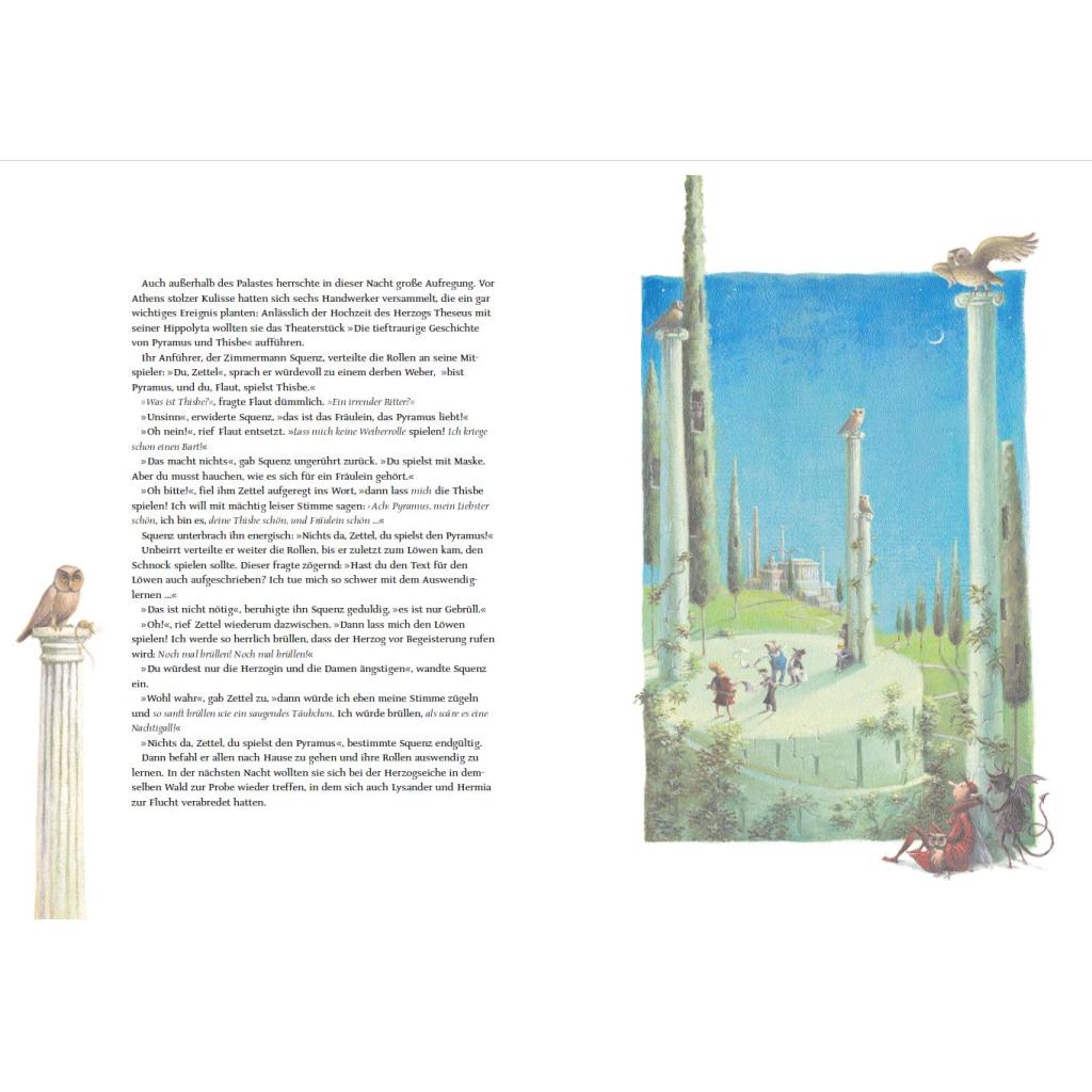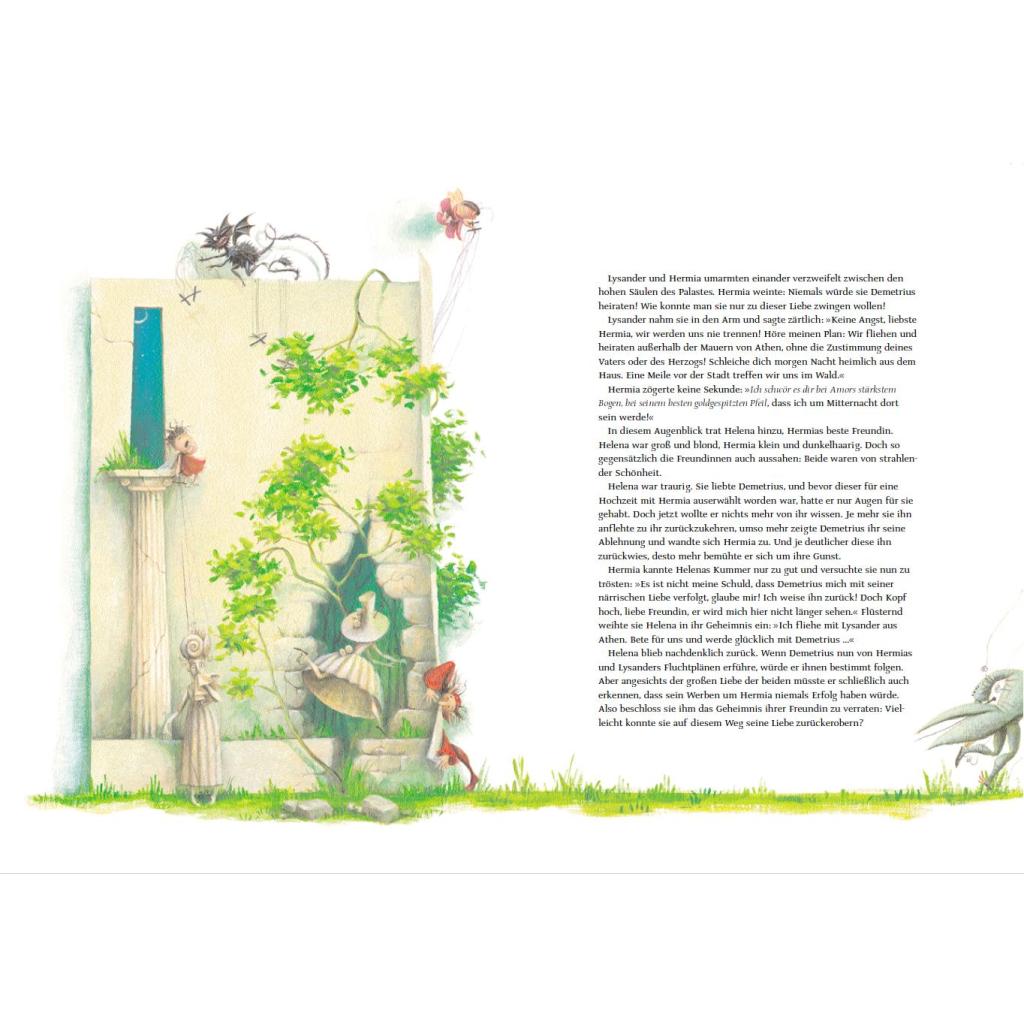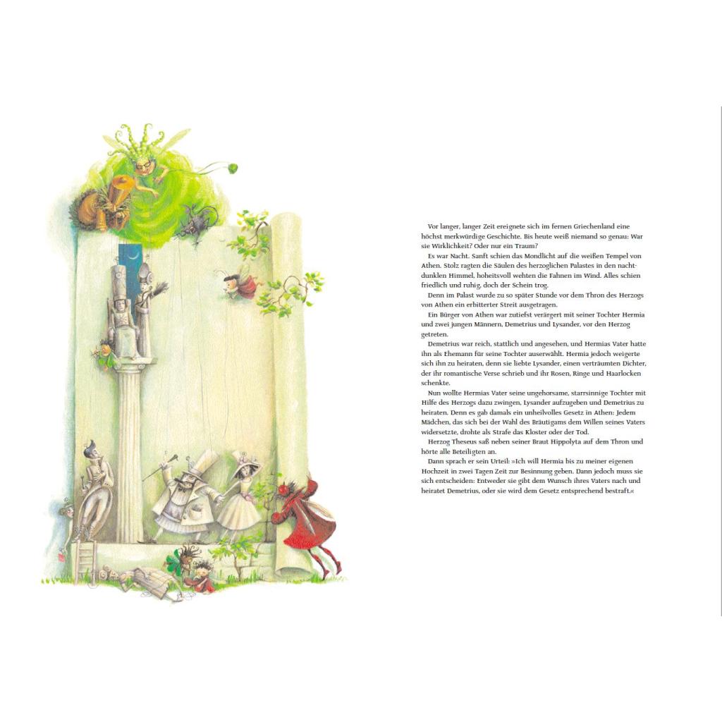 Vier unglücklich Verliebte irren in einer Mittsommernacht durch einen Wald nahe bei Athen. Sie ahnen nicht, dass sie sich im Zauberreich des Elfenkönigs Oberon und seiner stolzen Königin Titania befinden, in dem es von Feen und Naturgeistern nur so wimmelt. Unter ihnen der freche Kobold Puck mit seiner purpurfarbenen Zauberblume. Shakespeares beliebte Komödie, mit viel Gespür fürs Original nacherzählt von Barbara Kindermann, liest sich in der Reihe Weltliteratur für Kinder wie ein fantastisches Märchen. Almud Kunert hat dazu traumschöne Bilder in leuchtenden Farben geschaffen. Ein wunderbarer Lesespaß für die ganze Familie mit vielen fantasievollen Details zum Staunen, Träumen und Immer-wieder-Anschauen.