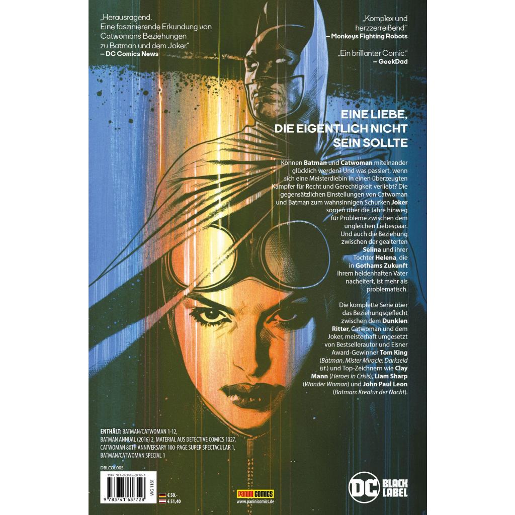 EINE LIEBE, DIE EIGENTLICH NICHT SEIN SOLLTE Können Batman und Catwoman miteinander glücklich werden? Und was passiert, wenn sich eine Meisterdiebin in einen überzeugten Kämpfer für Recht und Gerechtigkeit verliebt? Die gegensätzlichen Einstellungen von Catwoman und Batman zum wahnsinnigen Schurken Joker und dem rachsüchtigen Phantom sorgen über die Jahre hinweg für Probleme zwischen dem ungleichen Liebespaar. Und auch die Beziehung zwischen der gealterten Selina und ihrer Tochter Helena, die in Gothams Zukunft ihrem heldenhaften Vater nacheifert, ist mehr als problematisch. Die komplette Serie über das Beziehungsgeflecht zwischen dem Dunklen Ritter, Catwoman und dem Joker, meisterhaft umgesetzt von Bestsellerautor und Eisner Award-Gewinner Tom King (Batman, Mister Miracle: Darkseid ist.) und Top-Zeichnern wie Clay Mann (Heroes in Crisis), Liam Sharp (Wonder Woman) und John Paul Leon (Batman: Kreatur der Nacht). ENTHÄLT: BATMAN/CATWOMAN 1-12, BATMAN ANNUAL (2016) 2, MATERIAL AUS DETECTIVE COMICS 1027, CATWOMAN 80TH ANNIVERSARY 100-PAGE SUPER SPECTACULAR 1, BATMAN/CATWOMAN SPECIAL 1