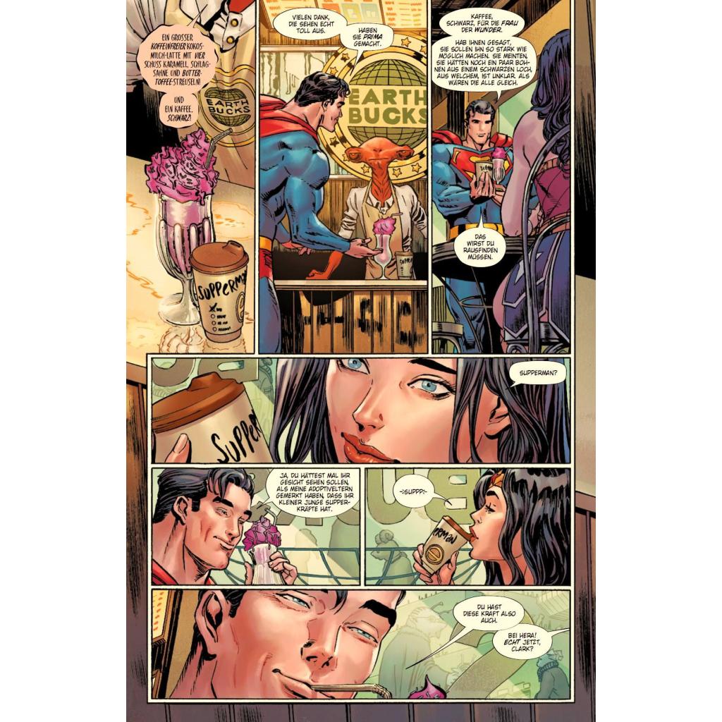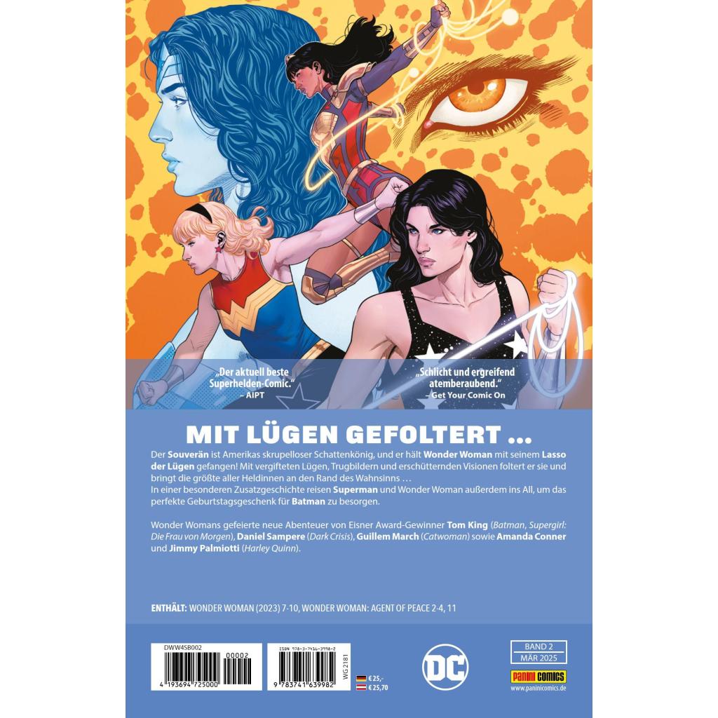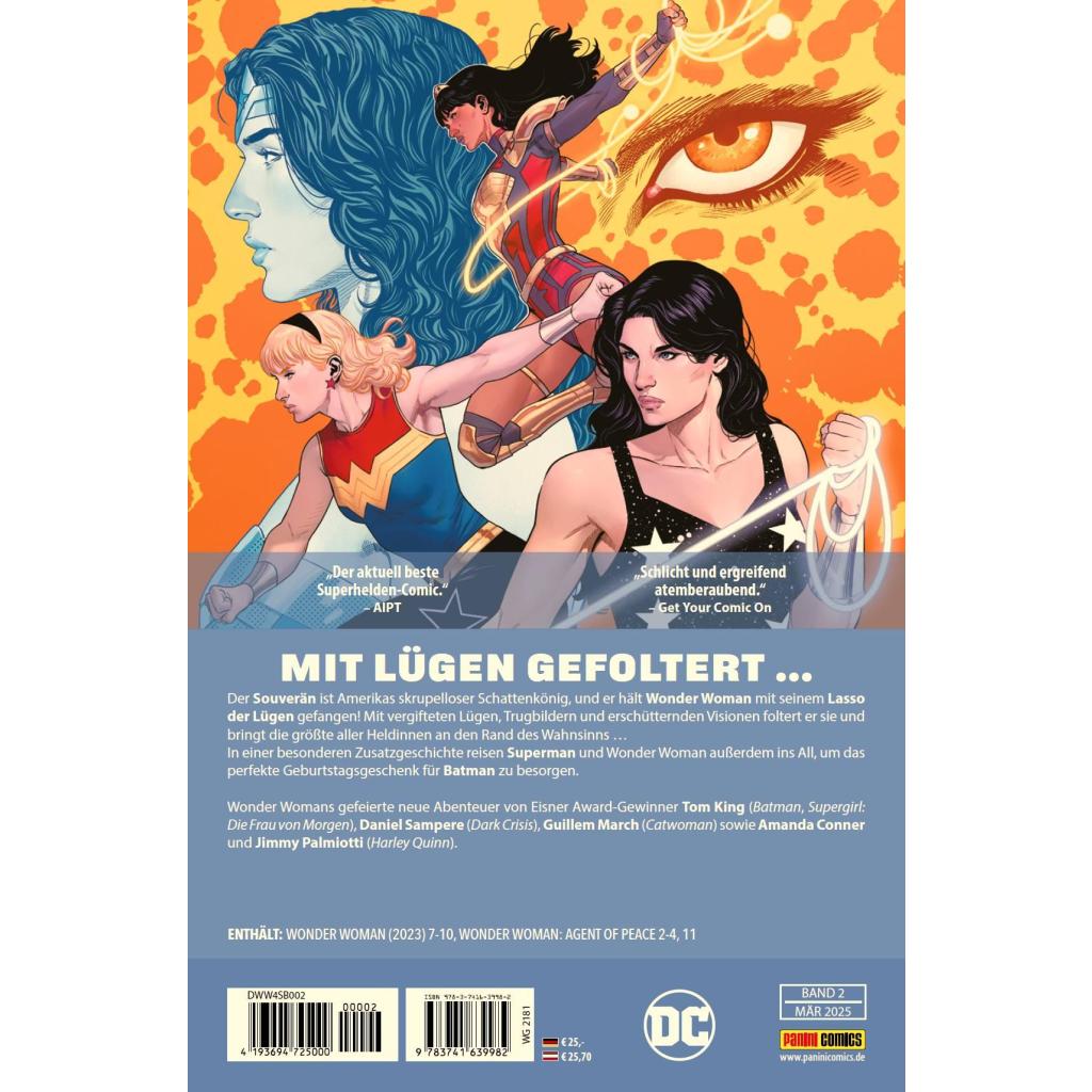 MIT LÜGEN GEFOLTERT ... Der Souverän ist Amerikas skrupelloser Schattenkönig, und er hält Wonder Woman mit seinem Lasso der Lügen gefangen! Mit vergifteten Lügen, Trugbildern und erschütternden Visionen foltert er sie und bringt die größte aller Heldinnen an den Rand des Wahnsinns ... In einer besonderen Zusatzgeschichte reisen Superman und Wonder Woman außerdem ins All, um das perfekte Geburtstagsgeschenk für Batman zu besorgen. Wonder Womans gefeierte neue Abenteuer, von Eisner Award-Gewinner Tom King (Batman, Supergirl: Die Frau von Morgen), Daniel Sampere (Dark Crisis), Guillem March (Catwoman) sowie Amanda Conner und Jimmy Palmiotti (Harley Quinn). ENTHÄLT: WONDER WOMAN (2023) 7-10, WONDER WOMAN: AGENT OF PEACE 2-4, 11
