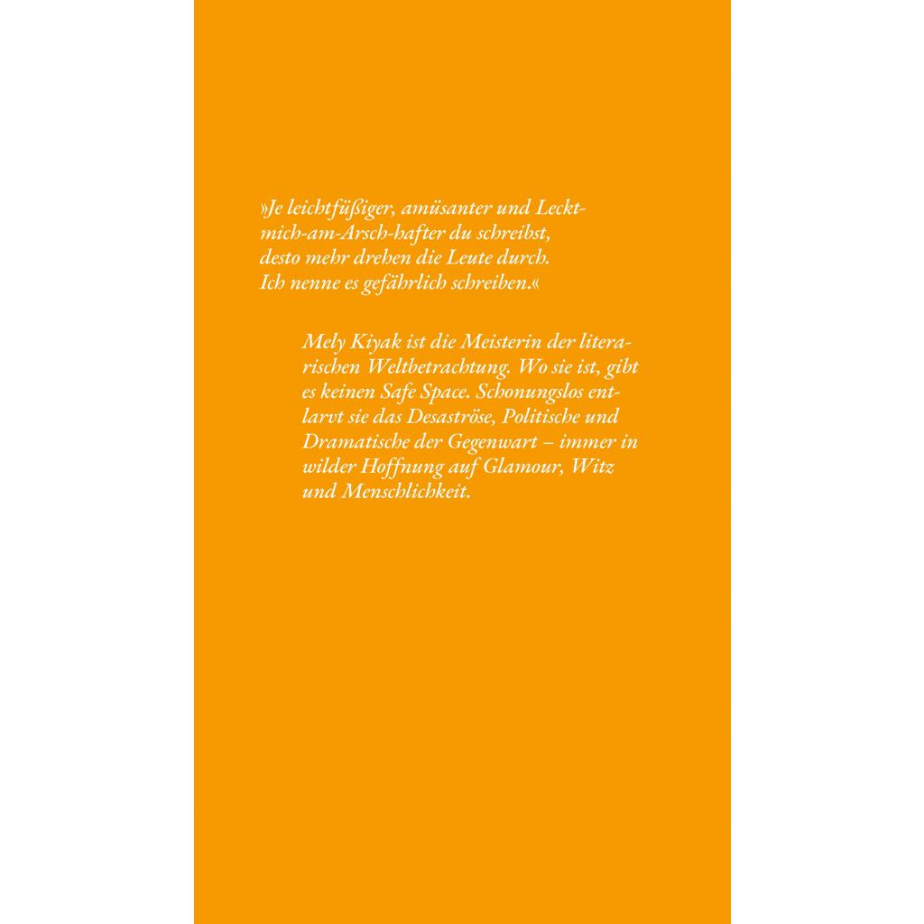 "Je leichtfüßiger, amüsanter und Leckt-mich-am-Arsch-hafter du schreibst, desto mehr drehen die Leute durch. Ich nenne es gefährlich schreiben." Mely Kiyak ist die Meisterin der literarischen Weltbetrachtung. Schonungslos und aufrichtig entlarvt sie das Desaströse, Politische und Dramatische in der Gegenwart. Wo sie ist, gibt es keinen Safe Space. Die "Frau mit der beängstigenden Intelligenz und ozeanischen Zärtlichkeit" (Milo Rau) hat eines der umfangreichsten Kolumnenwerke der deutschen Literatur geschaffen. Mit grausamem Scharfsinn und prächtigen Pointen munitioniert die "Seidenstickerin unter den deutschen Kolumnistinnen" (Jury des Kurt-Tucholsky Preis) ihren künstlerischen Widerstand. Immer in wilder Hoffnung auf Glamour, Witz und Menschlichkeit. Erhellend, erheiternd, erschütternd.