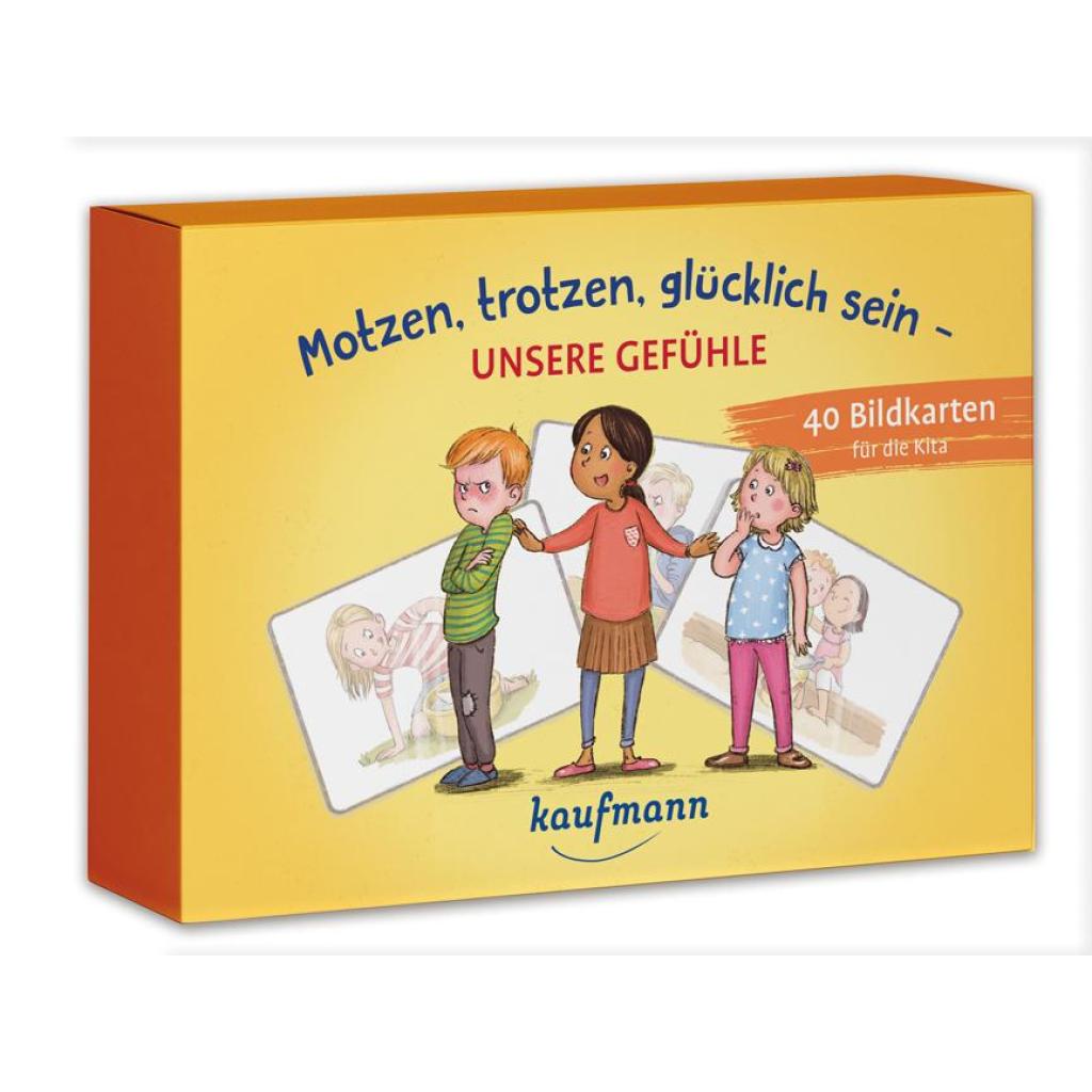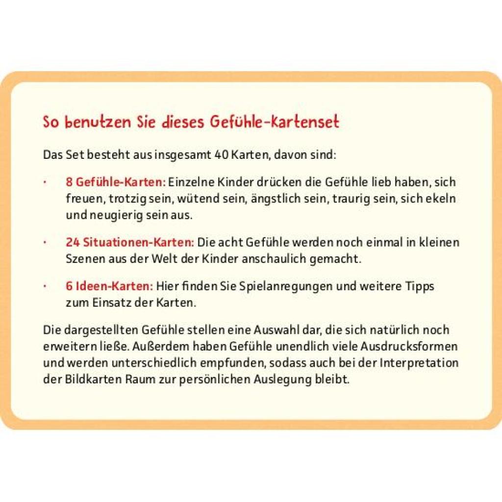 Gefühlskarten für Kinder: Egal ob traurig, fröhlich, ängstlich oder wütend ... - Bildkarten zum Thema Gefühle und Emotionen Für einen guten Umgang mit den eigenen Gefühlen ist es gerade für Kinder im Kita-Alter wichtig, diese zunächst wahrnehmen und einordnen zu können. Dabei soll dieses Kartenset auf spielerische Art helfen. Mit diesem Bildkartenset lernen Kinder spielerisch ihre eigene Gefühlswelt kennen. Neben acht Gefühle-Karten enthält es 24 illustrierte Szenen aus dem Alltag der Kinder. Acht Textkarten bieten darüber hinaus zahlreiche Praxisideen für den Einsatz der Bildkarten in der Kita, der Krippe oder im therapeutischen Kontext. In diesem Bildkarten-Set finden Erzieher*Innen und Tageseltern viele verschieden Gefühle und Emotionen in Bildform dargestellt. Beim Kartenspiel oder auch beim Betrachten der Karten im Sitzkreis können sie Gespräche über die Gefühle anregen. Aber auch im Einzelkontakt mit einem Kind oder im therapeutischen Kontext ist das Kartenset einsetzbar. Eine Box voller Gefühle-Bild-Karten zum lernen für Kindern: ¿ Spiel und Spaß für Kindergarten- und Kitakinder - Mit insgesamt 40 Karten ¿ 8 Gefühle-Karten: Einzelne Kinder drücken die Gefühle lieb haben, sich freuen, trotzig sein, wütend sein, ängstlich sein, traurig sein, sich ekeln und neugierig sein aus. ¿ 24 Situationen-Karten: Die acht Gefühle werden noch einmal in kleinen Szenen aus der Welt der Kinder anschaulich gemacht. ¿ 6 Ideen-Karten: Hier finden Sie Spielanregungen und weitere Tipps zum Einsatz der Karten. ¿ Die Karten sind in praktischem Format in einer Box und damit schnell einsatzbereit und leicht zu integrieren.