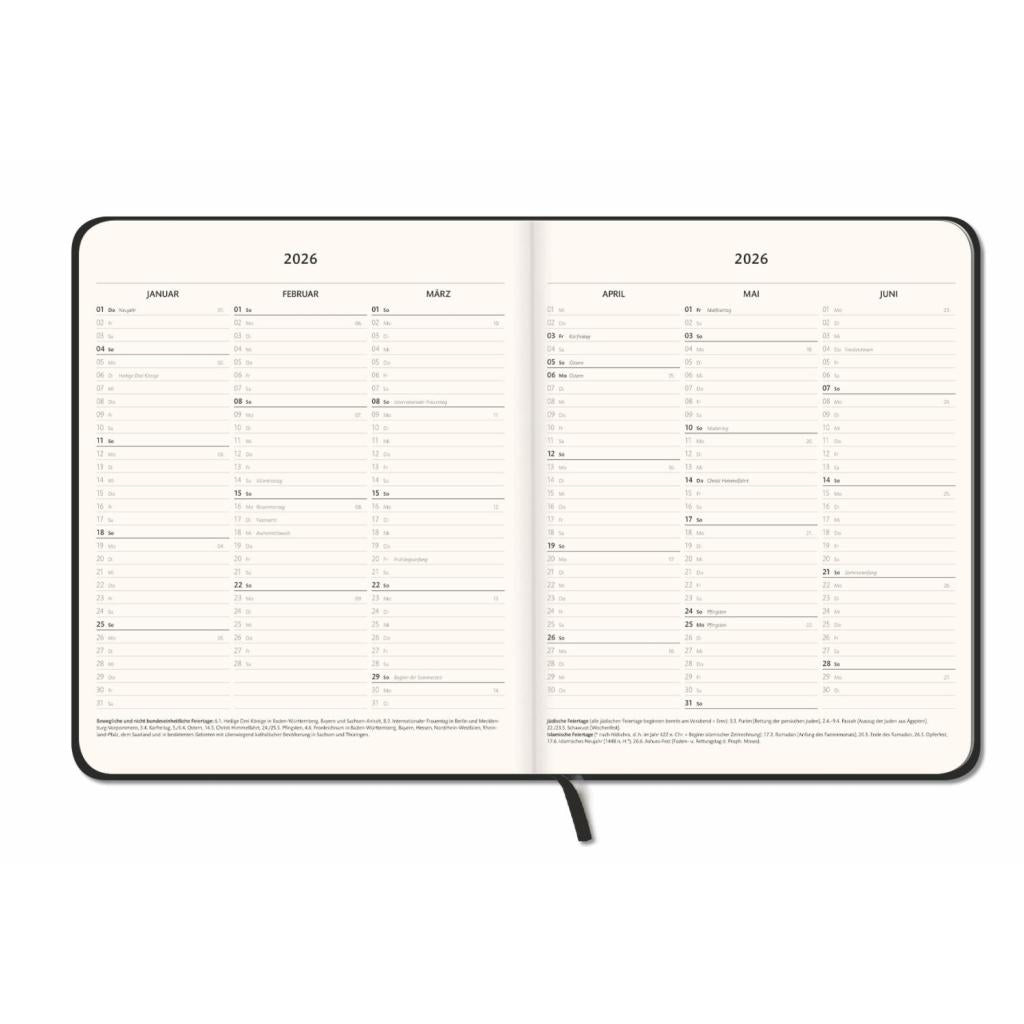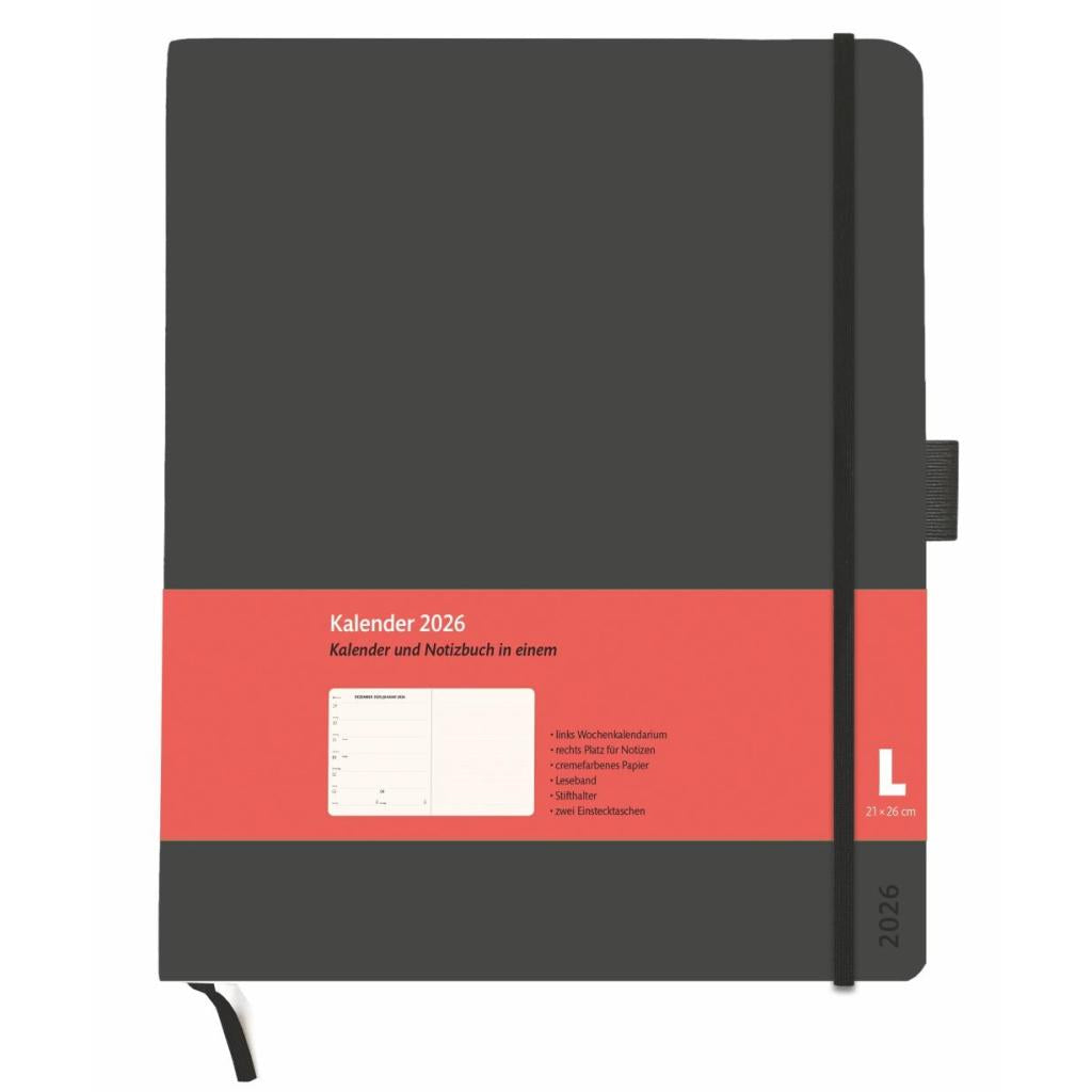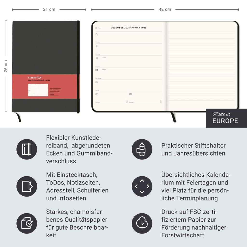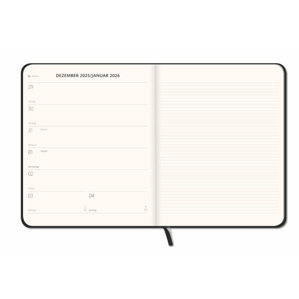 Schwarzer Terminkalender 2026. Buch-Kalender mit Lesebändchen und Gummiband. Großer Taschenkalender zum Planen von Terminen.