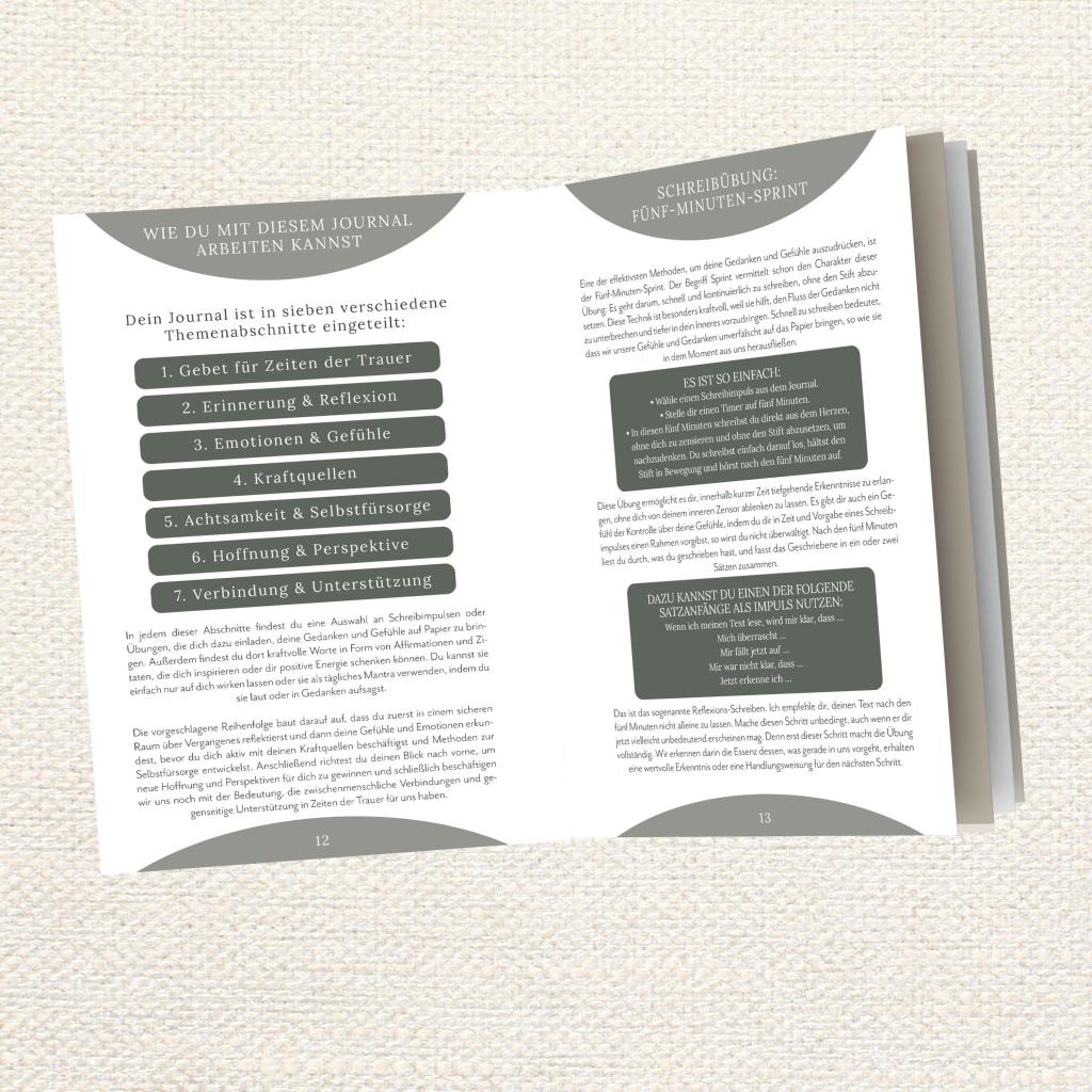 Trauerjournal: Ein Ort für deine Erinnerungen, deinen Schmerz und deine Heilung Der Verlust eines geliebten Menschen verändert alles. Dieses Journal will dir in dieser schwierigen Zeit zur Seite stehen. Es bietet dir Raum, deine Gedanken, Gefühle und Erinnerungen zuzulassen, auszudrücken und festzuhalten. Hier kannst du in deinem eigenen Tempo durch den Trauerprozess gehen, ohne etwas zurückhalten zu müssen. Mit behutsamen Schreibimpulsen lädt es dich ein, deinen Schmerz anzunehmen und in den dunklen Momenten neue Kraft zu finden. So begleitet es dich auf deinem Weg und hilft dir, dich zu erinnern, zu fühlen und Schritt für Schritt Heilung zu finden. Du bist nicht allein auf diesem Weg!