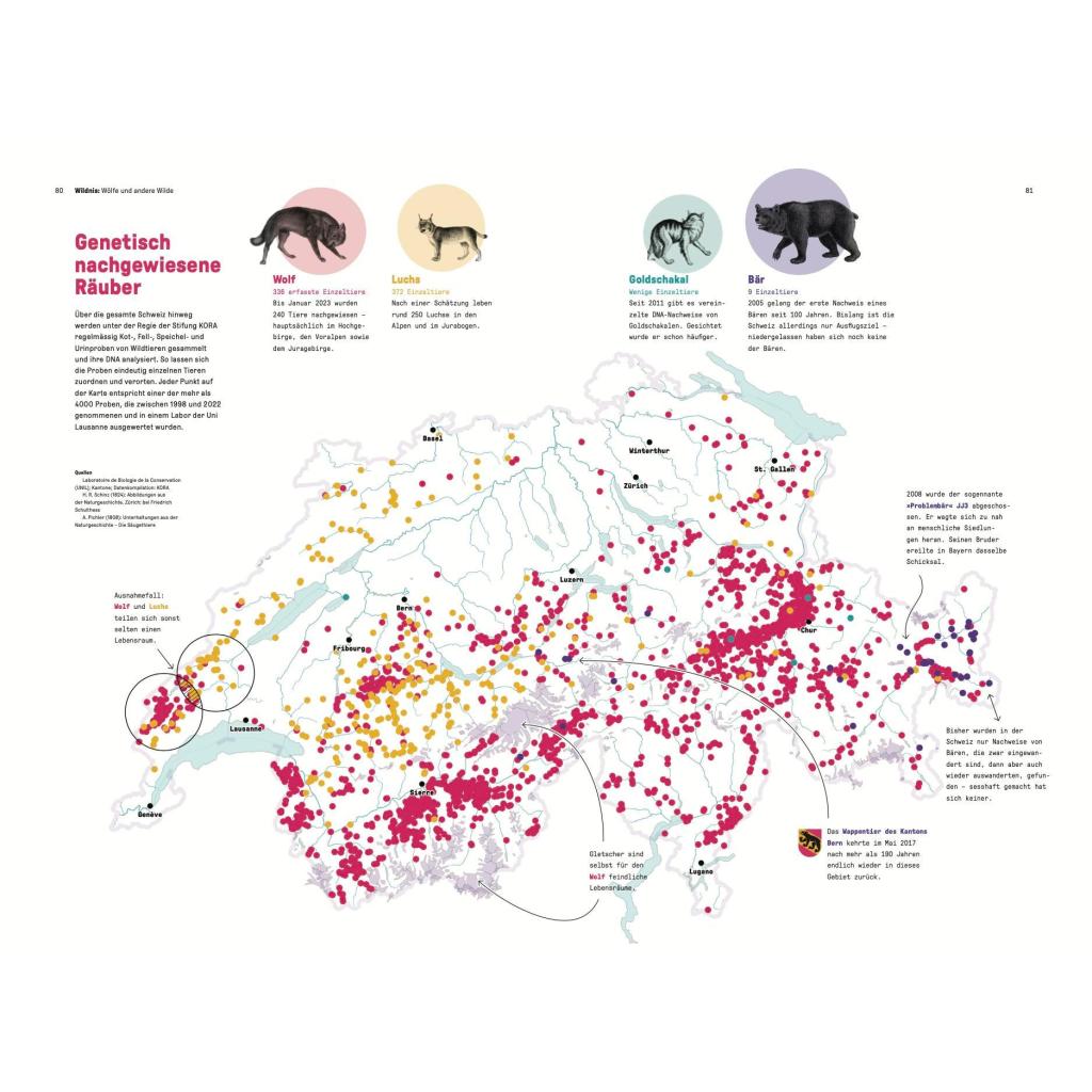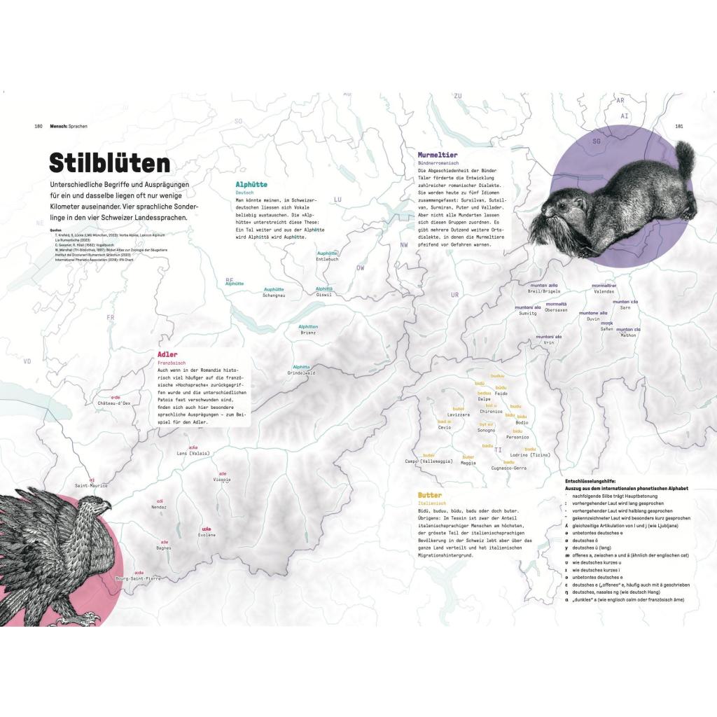 Ein Tag im Leben eines Bartgeiers oder auf den Spuren des seltenen Goldschakals in der Schweiz; der Aletschgletscher in der Zukunft oder die häufigsten Vor- und Nachnamen auf über 1000 Metern - diese und viele weitere Fragen bringt Fabian Lang grafisch auf den Punkt. Der in Lausanne lebende Autor und Datenwissenschaftler erstellt basierend auf dem lange gut gehüteten, doch mittlerweile geborgenen Datenschatz der Schweiz eingängige und überraschende Infografiken zu verschiedenen Themen rund um die Schweizer Bergwelt. Dieser informationsreiche Band macht dem Publikum die alpine Welt auf eine etwas andere Art zugänglich. Aktuelle und drängende Themen rund um den Alpenraum wie das Zusammenleben von Mensch und Wolf, Klimawandel und Gletscherschwund, die (Un-)Gleichheit der Geschlechter oder Energiegewinnung werden basierend auf Datenbanken auf davor noch nie dagewesene Weise ausgeleuchtet. Dadurch kann Fabian Lang neue Blickwinkel auf diese Themen bieten und der einen oder anderen vorgeformten Meinung entgegentreten. Der Band vereint Wissen und Design und spielt seinen Leserinnen und Lesern auch mal mit einem Augenzwinkern einen Streich. Oder wusstet ihr, dass, wenn ihr ganz genau hinseht, ihr auf der Landeskarte ein scheues Murmeltier entdecken könnt?