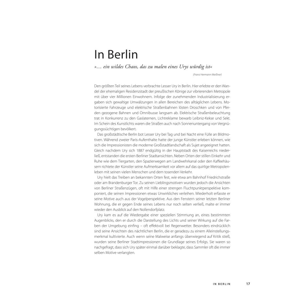 Lesser Ury (1861-1931) gehört zu den bedeutendsten Künstlern des Impressionismus in Deutschland. Nach Stationen in Düsseldorf, Brüssel, Paris und München lebte er ab 1887 in Berlin. Die Metropole mit ihren prächtigen Boulevards, quirligen Kaffeehäusern und im nächtlichen Laternenschein glänzenden Straßen gehörte bald zu den bevorzugten Themen seiner Kunst. Er malte aber auch Landschaften, Porträts und Stillleben. Sabine Lata hat die bedeutendsten Werke aus Urys vielfältigem Schaffen ausgewählt, erklärt prägnant und verständlich das jeweils Besondere und ordnet sie in den Kontext der Zeit ein. So lässt sich ein unkonventioneller Maler der europäischen Moderne (neu) entdecken.