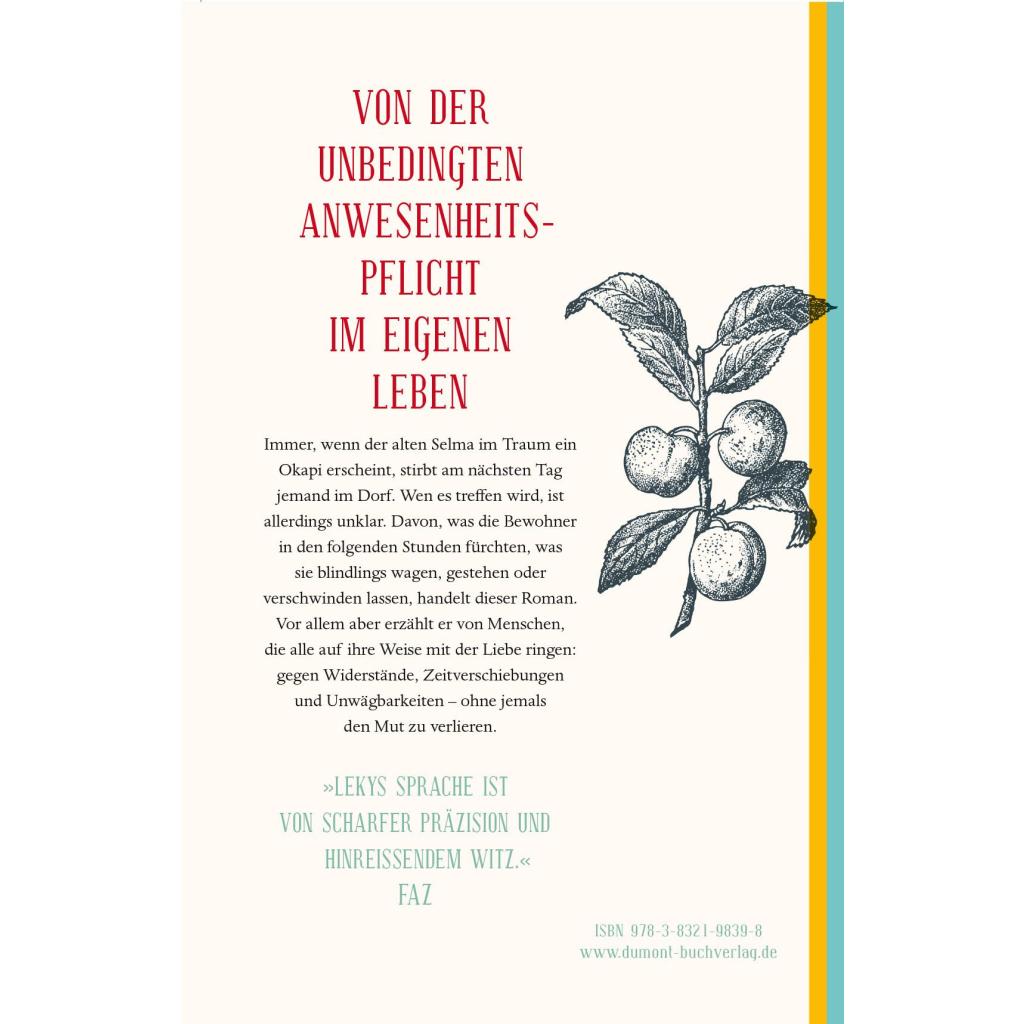 Selma, eine alte Westerwälderin, kann den Tod voraussehen. Immer, wenn ihr im Traum ein Okapi erscheint, stirbt am nächsten Tag jemand im Dorf. Unklar ist allerdings, wen es treffen wird. Davon, was die Bewohner in den folgenden Stunden fürchten, was sie blindlings wagen, gestehen oder verschwinden lassen, erzählt Mariana Leky in ihrem Roman. >Was man von hier aus sehen kann