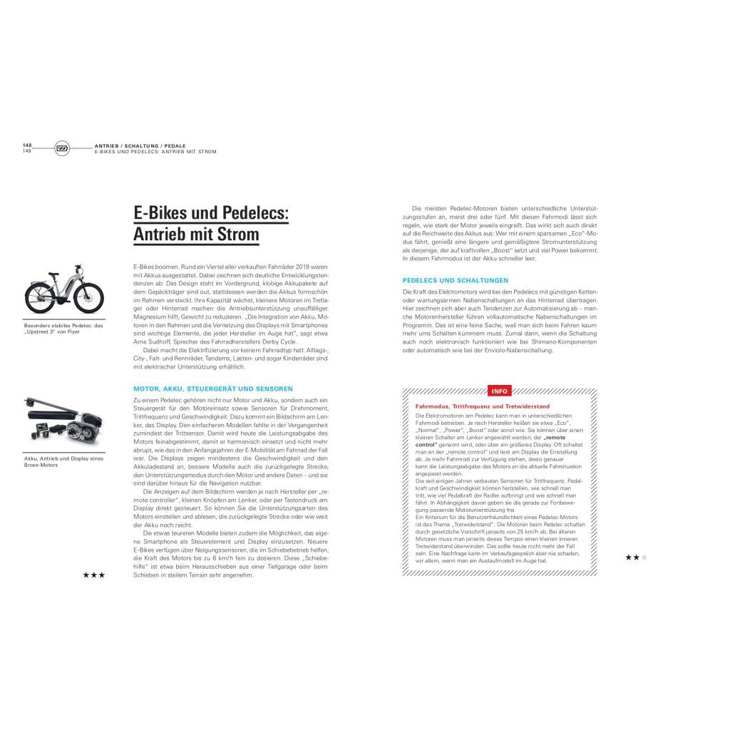 Was gibt es Neues in Sachen Fahrrad, Fahrradzubehör und Zweiradtechnik? Was ist sinnvoll und bringt echte Vorteile? "Fahrrad und E-Bike. Das große Technikhandbuch" ist ein detaillierter Ratgeber zu City-Fahrrad, Trekkingbike, Mountainbike, Rennrad oder E-Bike. Neben den aktuellsten E-Bike- und Fahrrad-Tests der Stiftung Warentest erfahren Einsteiger und Profis mit unterhaltsamen Anekdoten zu historischen Entwicklungsschritten in der Fahrradtechnik alles um die Zweirad-Tradition. Fahrradbegeisterung garantiert! Egal ob Fahrradhelm, Sattel, Lenker, Bremshebel oder Lastenanhänger: Von Bremsscheiben bis Umwerfer werden alle Komponenten in jeder angebotenen Variante eingehend erklärt. Ebenso werden Wartungsaufwand, Reparaturen, Nutzen und neueste Trends für jedes Bauteil gezeigt. Auch E-Bikes und Pedelecs sowie spezielle E-Bike-Themen wie E-Bike-Motoren, Pedelec-Akkus oder Fahrradcomputer finden ihre umfassende Darstellung. Darüber hinaus sind Neuheiten erläutert, darunter Smart-Bikes, integrierte Akkus oder Multifunktionshelme. Dieser Ratgeber enthält wirklich alles zu Ausstattung, Technik und Zubehör.