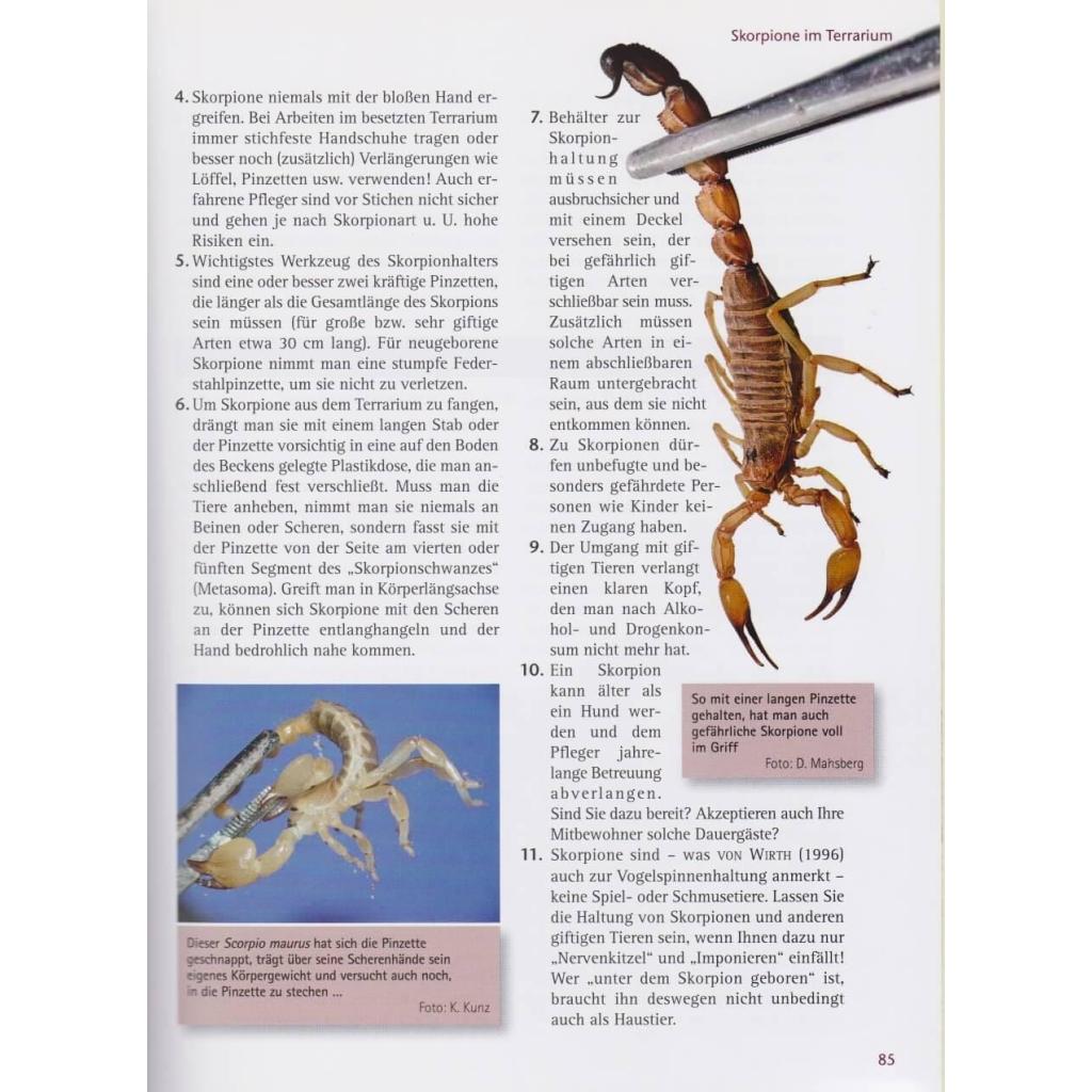 Skorpione faszinieren durch ihr urtümliches, bizarres Erscheinungsbild ebenso wie durch überaus spannende Verhaltensweisen. Diese komplett überarbeitete, neu gestaltete und um zehn Artporträts erweiterte Auflage des Klassikers schlechthin zum Thema Skorpione schildert ausführlich die Biologie der Tiere und bietet alle Informationen, die Terrarianer zu ihrer sicheren, artgerechten sowie erfolgreichen Pflege und Nachzucht benötigen. Darüber hinaus liefert die Vielzahl der Artsteckbriefe konkrete Haltungshinweise zu den vorgestellten Skorpionen. Aus dem Inhalt: - Überlebenskünstler Skorpion - wie sich die Tiere ihrer Umwelt anpassen - Körperbau und Sinneswelt: Faszinierende Einblicke in eine fremde Dimension - Die Lebensweise: So verhalten sich die Tiere - Besonderheiten: Brutpflege der Mutter, soziales Zusammenleben - Skorpione als Gifttiere: Funktion und Wirkung des Gifts, Erste Hilfe und Therapie - Artgerechte Haltung: Die verschiedenen Terrarientypen, ihre Einrichtung und Klimatisierung - Erfolgreich nachzüchten: So kommen Sie zu Jungtieren und können die Mutter beim Brutpflegeverhalten beobachten - Problemlösungen bei Haltungsfehlern und Krankheiten - Großer Spezialteil: Detaillierte Infos zu Biologie, Haltung und Zucht der beliebtesten Arten