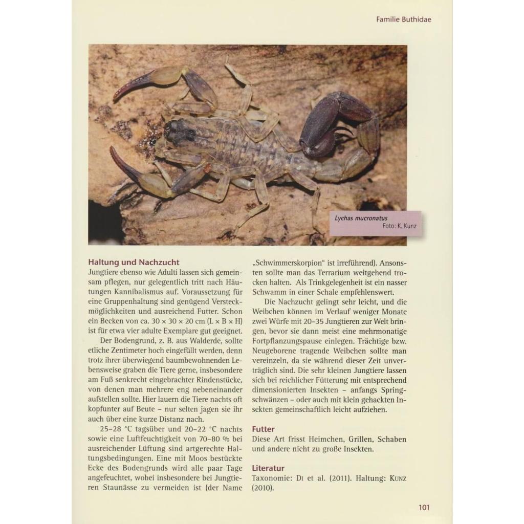 | Keyword: | Androctonus; Babycurus; Bothriuridae; Buthacus; Buthidae; Buthus; Chactidae; Diplocentridae; Euscorpiidae; Hottentotta; Ischnuridae; Isometrus; Iuridae; Leiurus; Lychas; Parabuthus; Scorpionidae; Skorpionhaltung; Skorpionpflege; Skorpionzucht; Terraristik; Tityus; Vaejovidae; Wirbellosenhaltung |