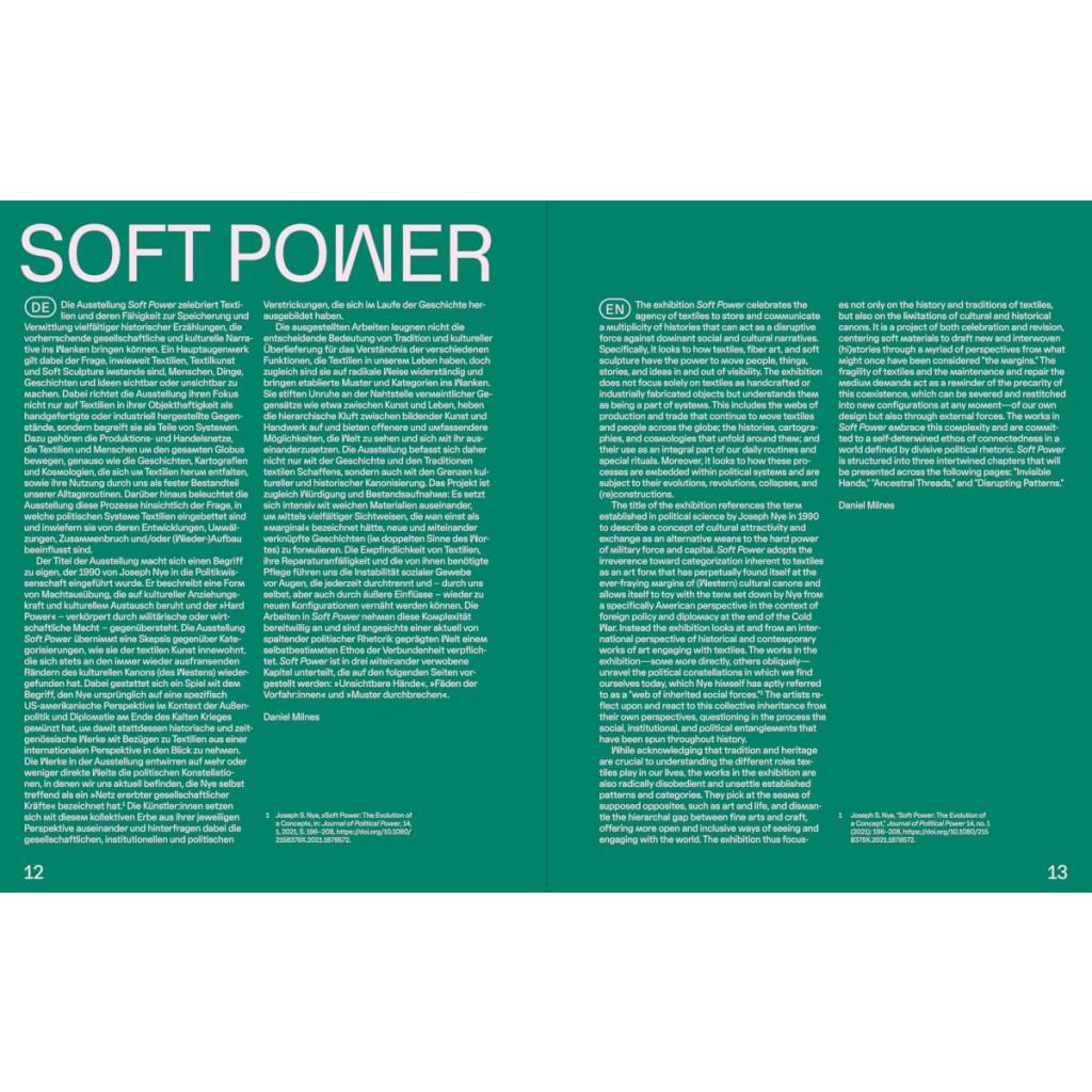 Soft Power zelebriert Textilien und ihre Fähigkeit, eine Vielzahl von Geschichten in sich zu tragen, die gegen dominierende soziale und kulturelle Narrative wirken. Die politischen 'Verstrickungen' von Textilkunst zeigen, wie sie imstande ist, Menschen, Dinge, Geschichten und Ideen sichtbar oder unsichtbar zu machen. Soft Power richtet den Fokus nicht nur auf Textilien als handgefertigte oder industriell hergestellte Objekte, sondern begreift sie als Teil von Systemen. Dazu gehören die Produktions- und Handelsnetze, die Textilien und Menschen über den gesamten Globus verknüpfen, genauso wie die Geschichten, Kartografien, Kosmologien und Rituale, die sich um sie herum entfalten. Mit Arbeiten von Magdalena Abakanowicz, Caroline Achaintre, El Anatsui, Leonor Antunes, Rufina Bazlova, Edith Dekyndt, Gee's Bend Quiltmakers, William Kentridge, Joanna Louca, Rosemary Mayer, Mägorzata Mirga-Tas, Sandra Mujinga, Otobong Nkanga, Willem de Rooij, Gabriele Stötzer, Sung Tieu, Rosemarie Trockel, Johanna Unzueta, Hamid Zénati u. a.