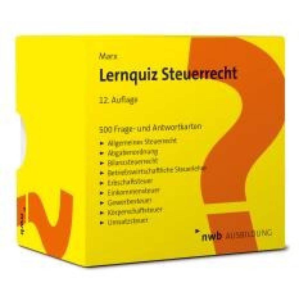 | Keyword: | Steuerberaterprüfung; Steuerfachwirtprüfung; Steuerlehre; Steuerquiz; Umsatzsteuer; Bilanzsteuerrecht; Erbschaftsteuer; Ertragsteuern; Karteikarten; Lernkartei; Gewerbesteuer; Körperschaftsteuer; Abgabenordnung; Betriebswirtschaftliche Steuerlehre; Steuerberater; Einkommensteuer |