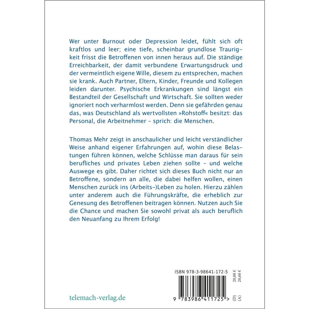 Wer unter Burnout oder Depression leidet, fühlt sich oft kraftlos und leer; eine tiefe, scheinbar grundlose Traurigkeit frisst die Betroffenen von innen heraus auf. Die ständige Erreichbarkeit, der damit verbundene Erwartungsdruck und der vermeintlich eigene Wille, diesem zu entsprechen, machen sie krank. Auch Partner, Eltern, Kinder, Freunde und Kollegen leiden darunter. Psychische Erkrankungen sind längst ein Bestandteil der Gesellschaft und Wirtschaft. Sie sollten weder ignoriert noch verharmlost werden. Denn sie gefährden genau das, was Deutschland als wertvollsten 'Rohstoff' besitzt: das Personal, die Arbeitnehmer - sprich: die Menschen . Thomas Mehr zeigt in anschaulicher und leicht verständlicher Weise anhand eigener Erfahrungen auf, wohin diese Belastungen führen können, welche Schlüsse man daraus für sein berufliches und privates Leben ziehen sollte - und welche Auswege es gibt. Daher richtet sich dieses Buch nicht nur an Betroffene , sondern an alle, die dabei helfen wollen, einen Menschen zurück ins (Arbeits-)Leben zu holen. Hierzu zählen unter anderem auch die Führungskräfte, die erheblich zur Genesung des Betroffenen beitragen können. Nutzen auch Sie die Chance und machen Sie sowohl privat als auch beruflich den Neuanfang zu Ihrem Erfolg!