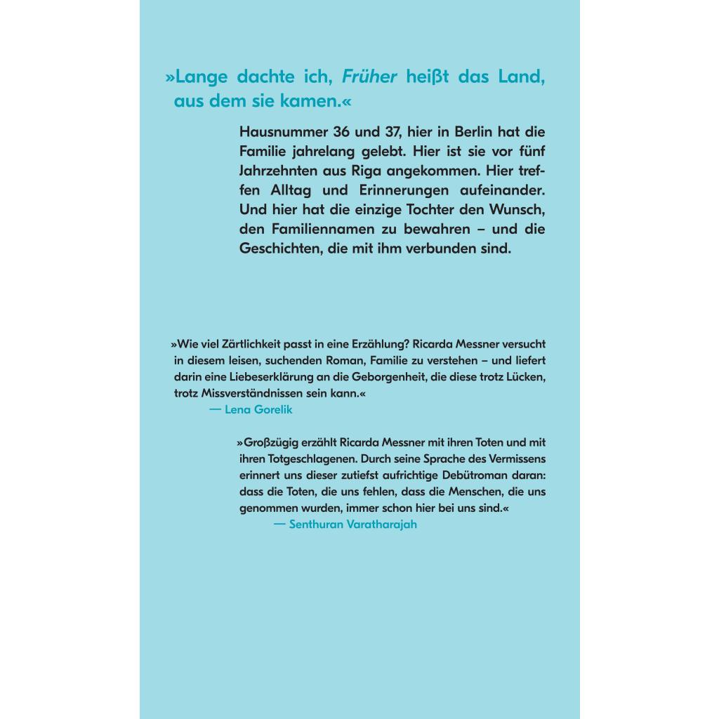 | Keyword: | Ausreise; Berlin; Das achte Leben; Debüt; Debütroman; Enkelin; Enkeltochter; Erinnerungen; Familienbiografie; Familiengeschichte; Familienleben; Familienname; Flaneur Magazin; Gemeinschaft; Generationenroman; Großeltern; Großmutter; Großvater; Iris Wolff; Katja Petrowskaja; Lena Gorelik; Lettland; Maria Stepanova; Migration; Nachbarhaus; Nachbarn; Nachbarschaft; Namensrecht; Nationalsozialismus; Nino Haratischwili; Riga; Rigaer Ghetto; Sasha Marianna Salzmann; Tod; Trauer; Vergangenheit; Verlust; Wer wir sind; Wohnung; jüdische Familie; jüdischer Name; vier Generationen |