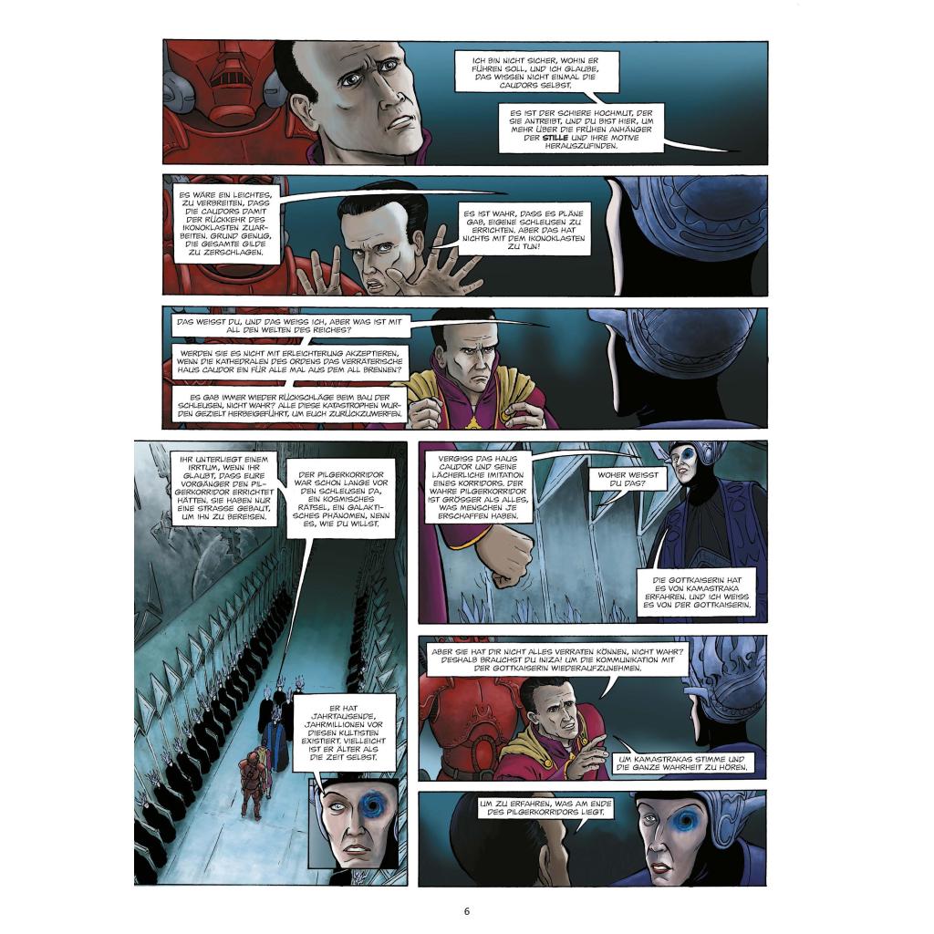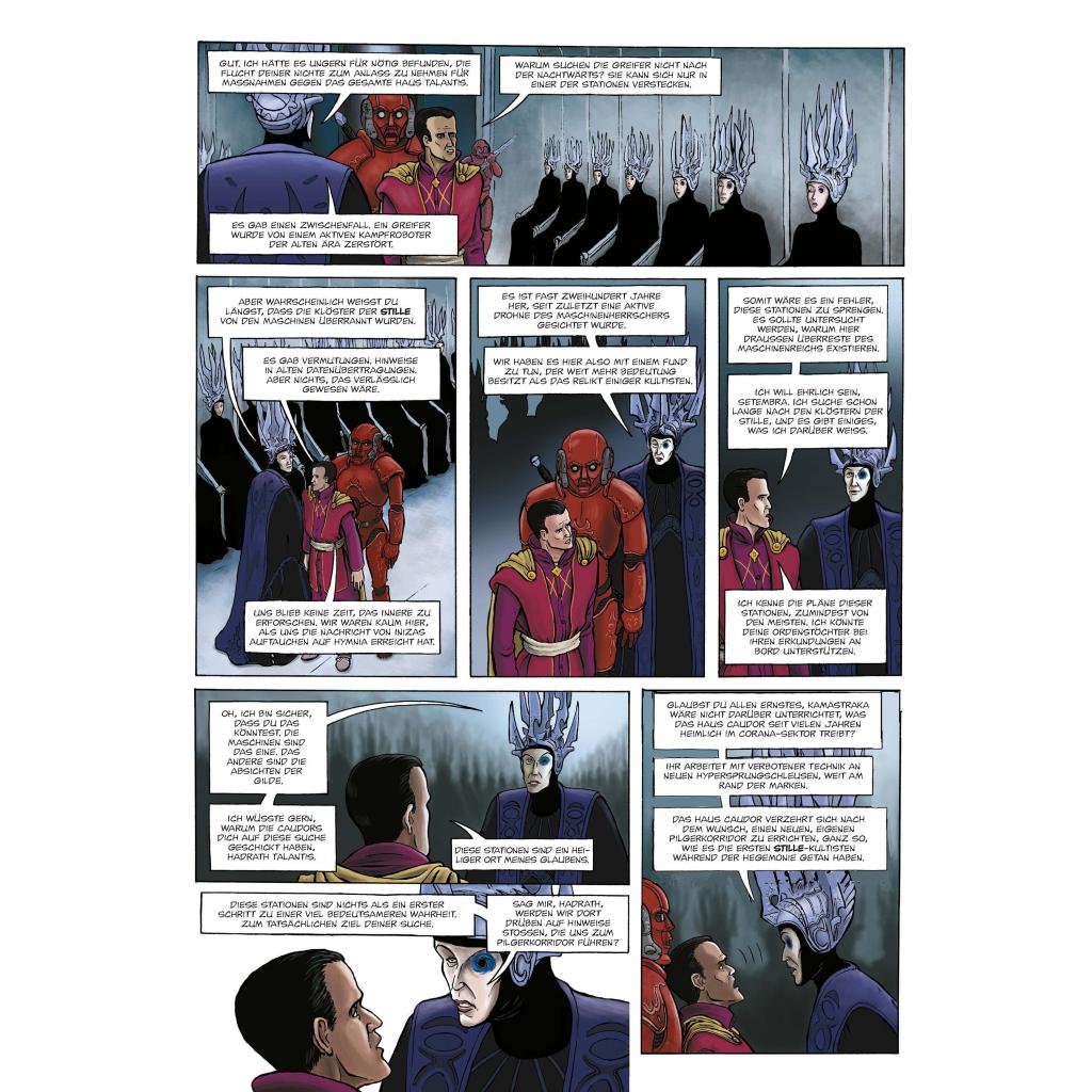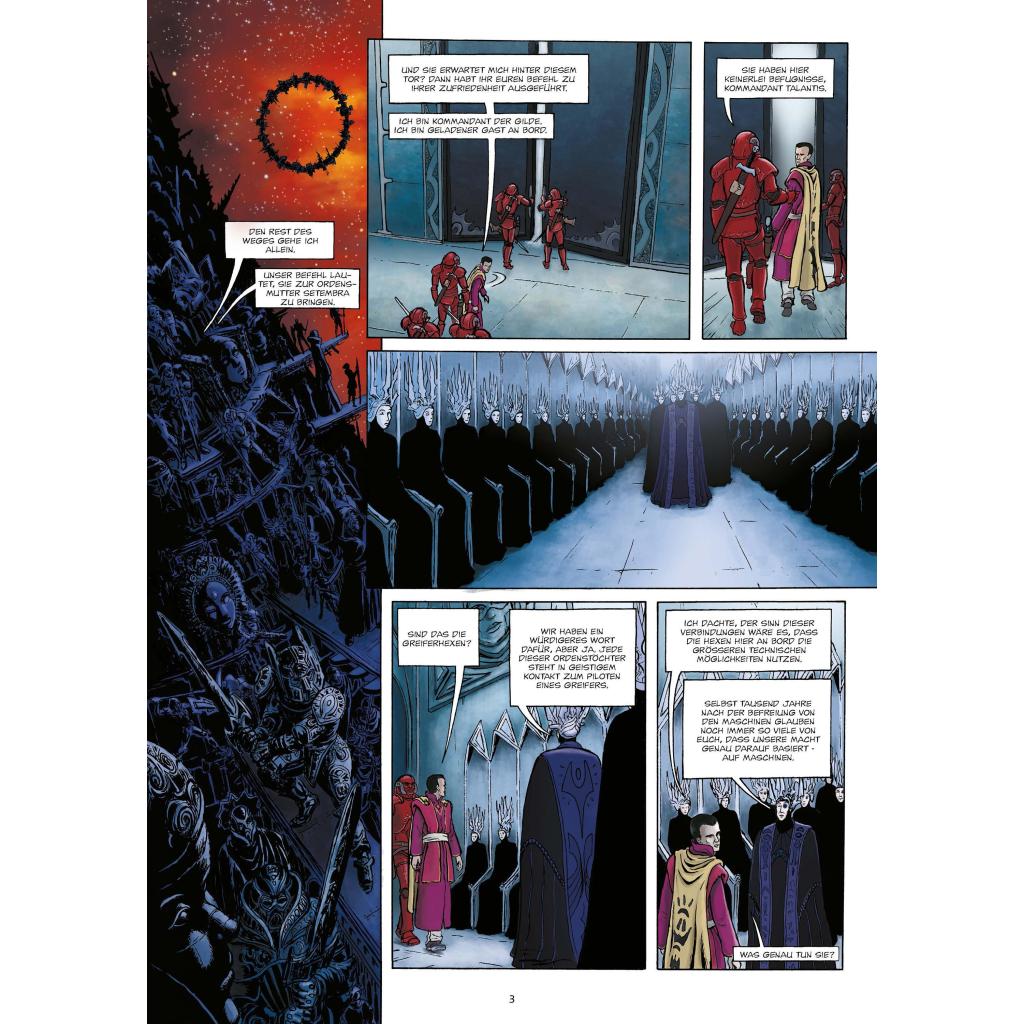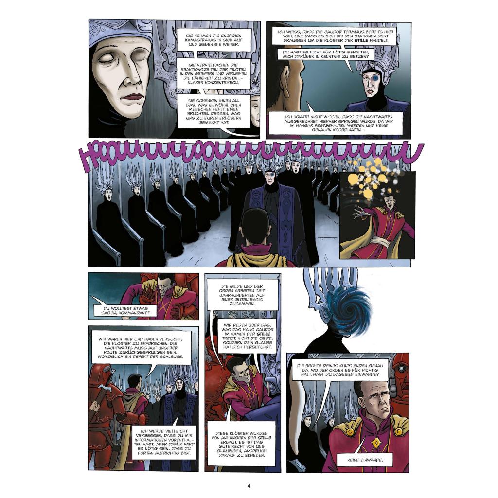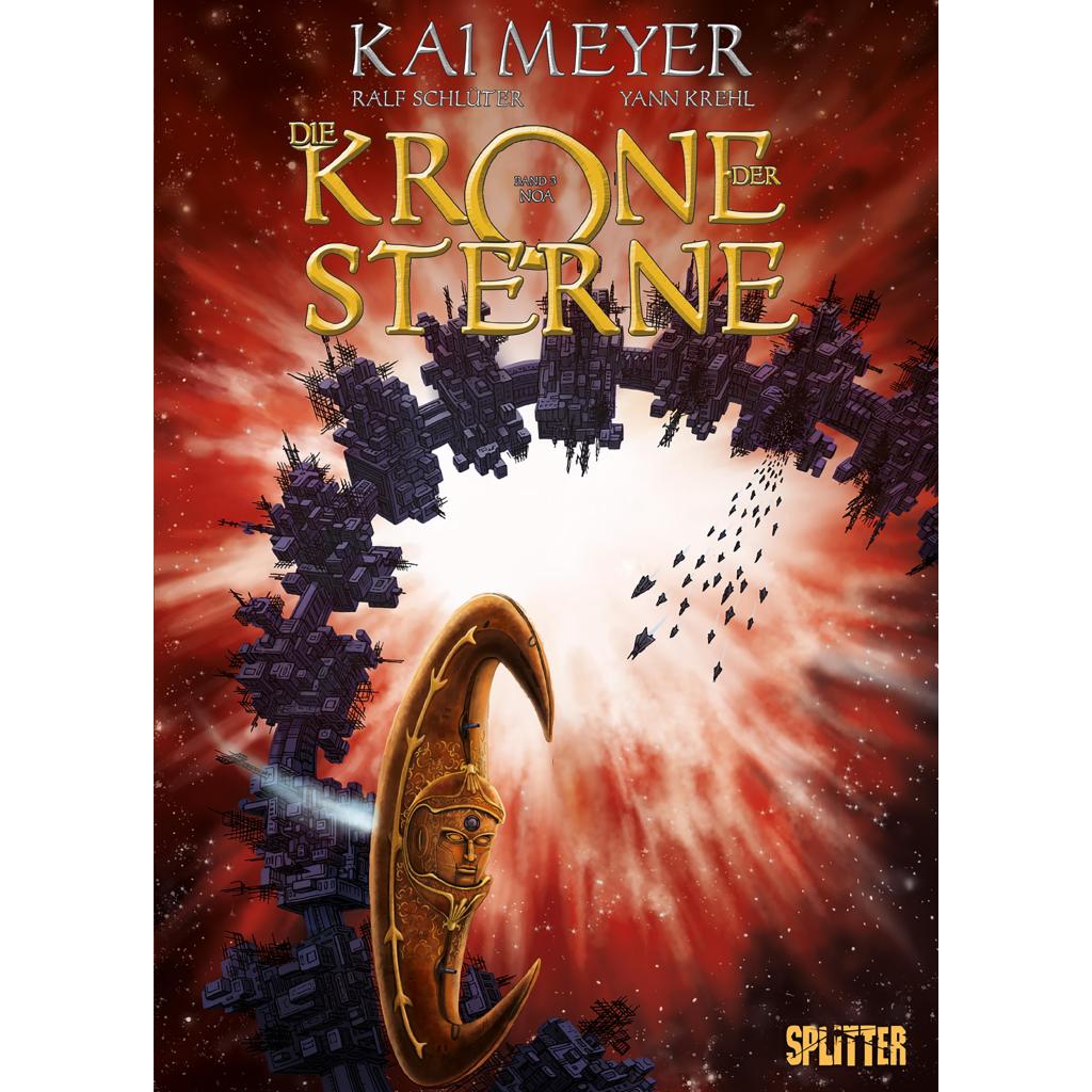 Auf der Flucht vor dem Hexenorden versteckt sich die Nachtwärts in den Klöstern der STILLE. Der einzige Weg in die Freiheit führt durch die Hypersprungschleuse, die in den uralten, menschenverlassenen Raumstationen verborgen ist. Doch um diese zu aktivieren ist die Besatzung auf die Hilfe der Muse und ihrer Freunde angewiesen - den wiedererwachten Kampfrobotern des Maschinenherrschers, die zu Hunderten in den Klöstern der STILLE lauern. Der in Ungnade gefallene STILLE-Priester Hadraht Talantis sitzt derweil mit seinem Schiff im Hangar der Weltraumkathedrale fest. Aber um seine eigenen Ziele zu erreichen, schreckt Inizas Onkel auch nicht davor zurück, sich endgültig mit dem Hexen zu überwerfen. 'Die Krone der Sterne' ist die dritte Comic-Adaption eines Romans von Kai Meyer bei Splitter! Das rasante Abenteuer der bunten Heldentruppe besticht durch seinen Mix aus Phantastik und Space Opera und wird vom bewährten Team aus Yann Krehl und Ralf Schlüter adaptiert.