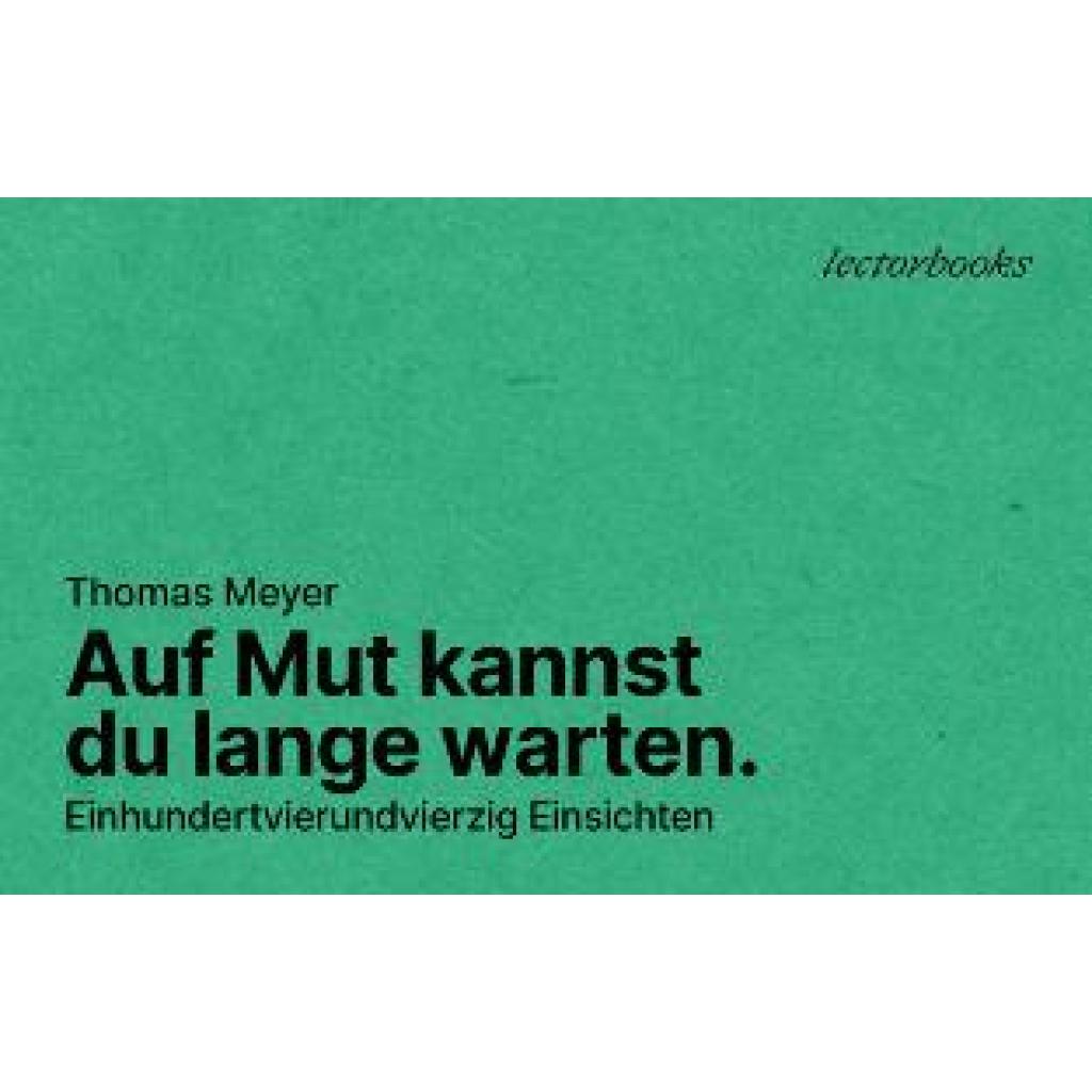 Während mehrerer Jahre hat Thomas Meyer kurz- und langfristige Beobachtungen erneut zu Einsichten kondensiert. 'Auf Mut kannst du lange warten.' basiert auf diesen ganz persönlichen Gedanken und bietet komprimierte Weisheit im Sinne des Diktums 'Die Arbeit an der Sprache ist die Arbeit am Gedanken'. Von Gottes Nichtexistenz über die Uncoolness des Vaterseins bis zu vermeintlich jüdischem Humor, dem Sinn der Zwecklosigkeit und schlussendlich dem Ende der Hoffnung reichen die pointiert und oft doppelbödig formulierten Einsichten. 'Auf Mut kannst du lange warten.' ist ein kluges, anregendes Geschenk für jede Gelegenheit.