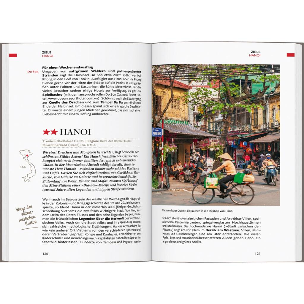 Eine wilde Fahrt auf dem Mofa, kulinarische Highlights und mehr als 3.000 km wunderschöne Strände - gewinnen Sie einen Einblick in die vielfältige Kultur Vietnams. In unserem Reiseführer Vietnam begleiten wir Sie bei Ihrer Urlaubsplanung: Reisen Sie in die Metropole Ho-Chi-Minh, steuern Sie die kleine Hafenstadt Hoi an und erleben Sie die schönsten Sehenswürdigkeiten in der Hauptstadt Hanoi. In vier inspirierenden Tourenvorschlägen zeigen wir Ihnen bei einer Rundreise die atemberaubende Natur Vietnams. Entdecken Sie den Cat-Tien-Nationalpark, besuchen Sie das Mekong Delta und einen der berühmten schwimmenden Märkte und planen Sie einen Ausflug in die Ha-Long-Bucht, um rund 2.000 bizarr zerklüftete Felsen zu bestaunen. Unsere Expertentipps verraten, wo Sie Besonderes erleben, das wohl beste Essen Asiens kosten und eine Wanderung durch die einzigartige Landschaft Sa Pa's machen können - damit Ihr Vietnam-Urlaub einfach unvergesslich wird. Unser Reiseführer Vietnam ist der perfekte Begleiter für zuhause und unterwegs! Und all das in 6 Kapiteln inklusive: - Wissenswertes über Vietnam und die facettenreichen Ausflugsziele des Landes - Gliederung der wichtigsten Sehenswürdigkeiten von A bis Z, kompetente Sterne-Bewertung der Top-Ziele, übersichtliche Infografiken und spannende 3D-Darstellungen - Spannende Tourenvorschläge - Vietnam in vier verschiedenen Touren entspannt entdecken - Erleben & Genießen in Vietnam - Empfehlungen unserer Autoren zu Hotels, Restaurants, Shopping und Entspannung - Fundierte Expertentipps zum Staunen, Durchatmen und Spaß haben sowie für ganz besondere Erlebnisse, die einfach nicht für Geld zu bekommen sind - Magische Momente für einen einzigartigen Urlaub in Vietnam - Kommen Sie zur rechten Zeit an den richtigen Ort und erleben Sie Unvergessliches - Spannende Hintergrundinfos zur Geschichte von Vietnam, zu Landschaft und Klima, Wirtschaft und Kultur, zu seinen Menschen und deren Alltag - Servicekapitel mit praktischen Informationen zur Urlaubsplanung, für die Vorbereitung der Reise und Wissenswertes vor Ort Dieser Reiseführer ist perfekt für Sie geeignet, wenn Sie ... ... sich einen Reiseführer mit einem hohen Maß an Urlaubsinspiration wünschen ... sich vor Ihrer Reise umfassend über Land und Leute informieren möchten ... Wert auf Kultur und Natur legen ... auf der Suche nach außergewöhnlichen Momenten sind ... Vietnam durch die kenntnisreichen Tipps unserer Experten entdecken möchten ... sich einen durchdachten Reiseführer für unterwegs und zuhause wünschen