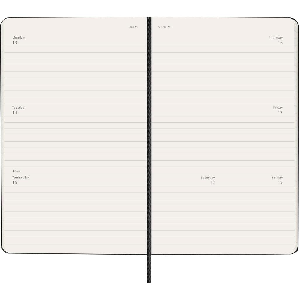 Der 12-Monats-Wochen-Notizkalender in deutscher Sprache und klassischem Schwarz bietet Wochenplanung kombiniert mit Notizfunktion. Dieses praktische Layout datiertvon Januar bis Dezember 2026 ermöglicht eine Wochenübersicht auf einen Blick und bietet zusätzlich den freien Gestaltungsraum eines Notizbuchs. MOLESKINE Buchkalender 2026, Wochen, L/A5, Softcover,schwarz Wochenkalender, Maße: 130 x 210mm, 1 Woche = 1 Seite, rechts linierte Seite, weicher Einband, abgerundete Ecken, elfen- beinweißes Papier, 70 g/qm, säurefrei, mit Gummiband zum Verschließen, Lesezeichen, Sprache: deutsch, 72 Blatt