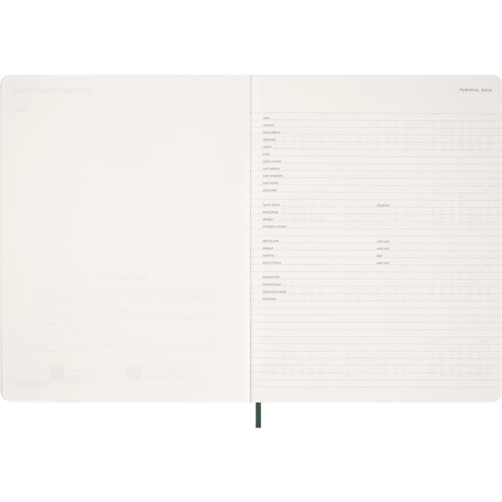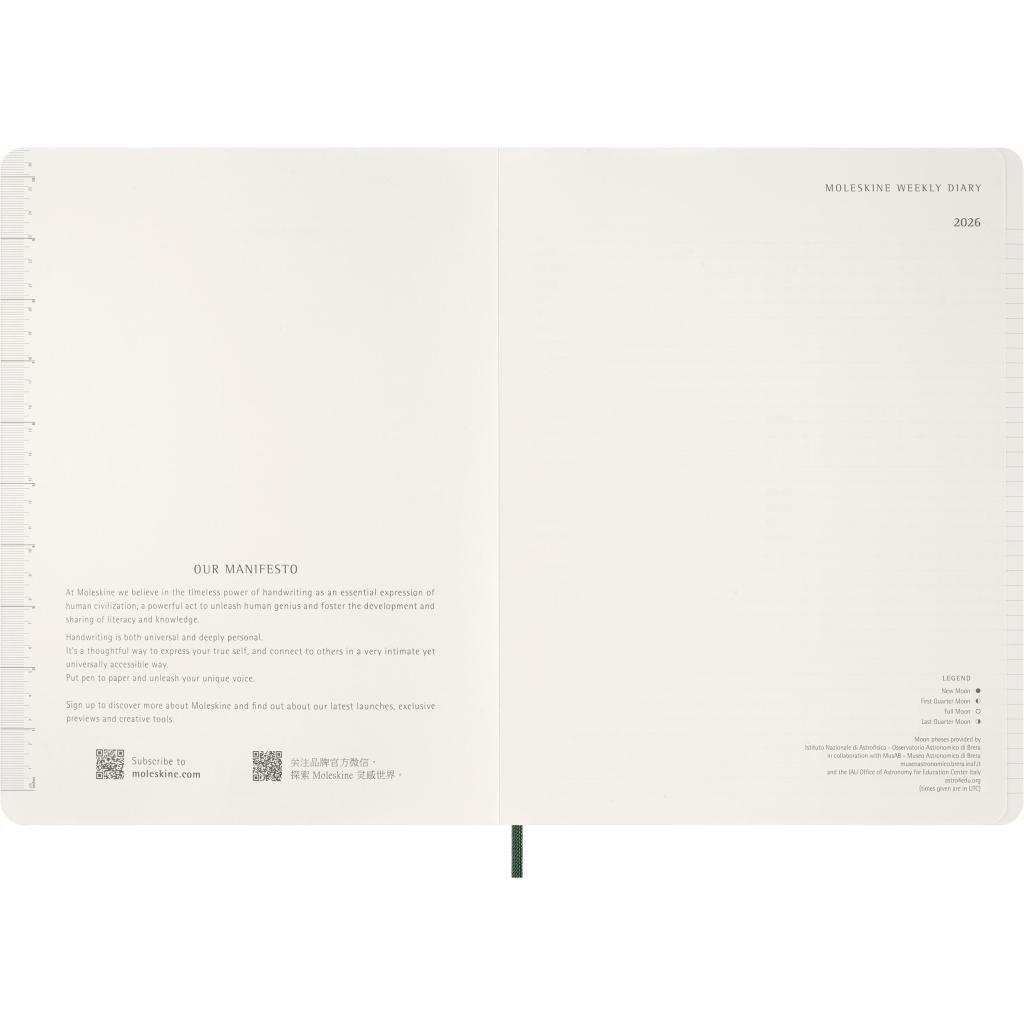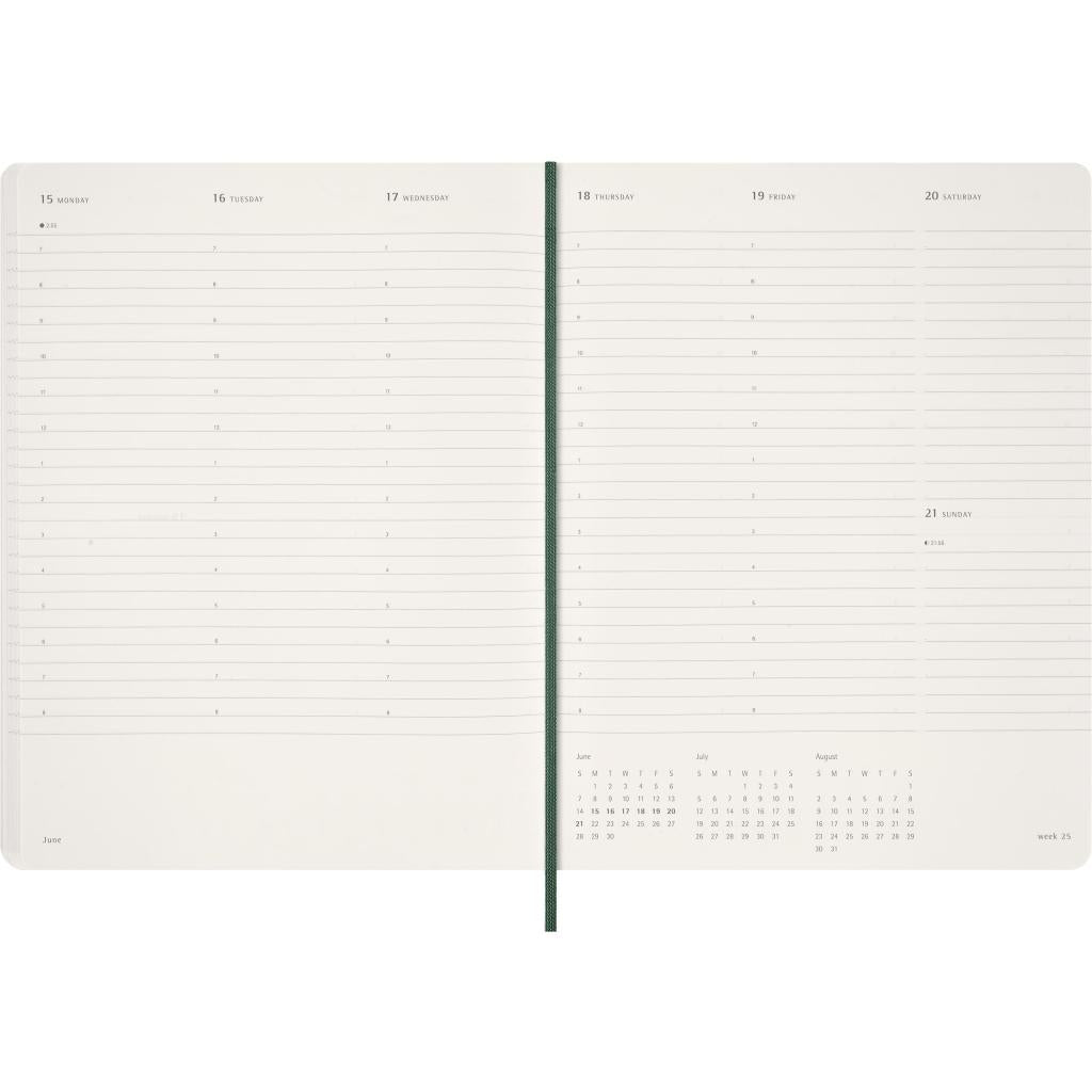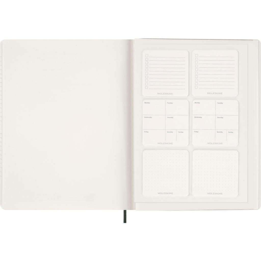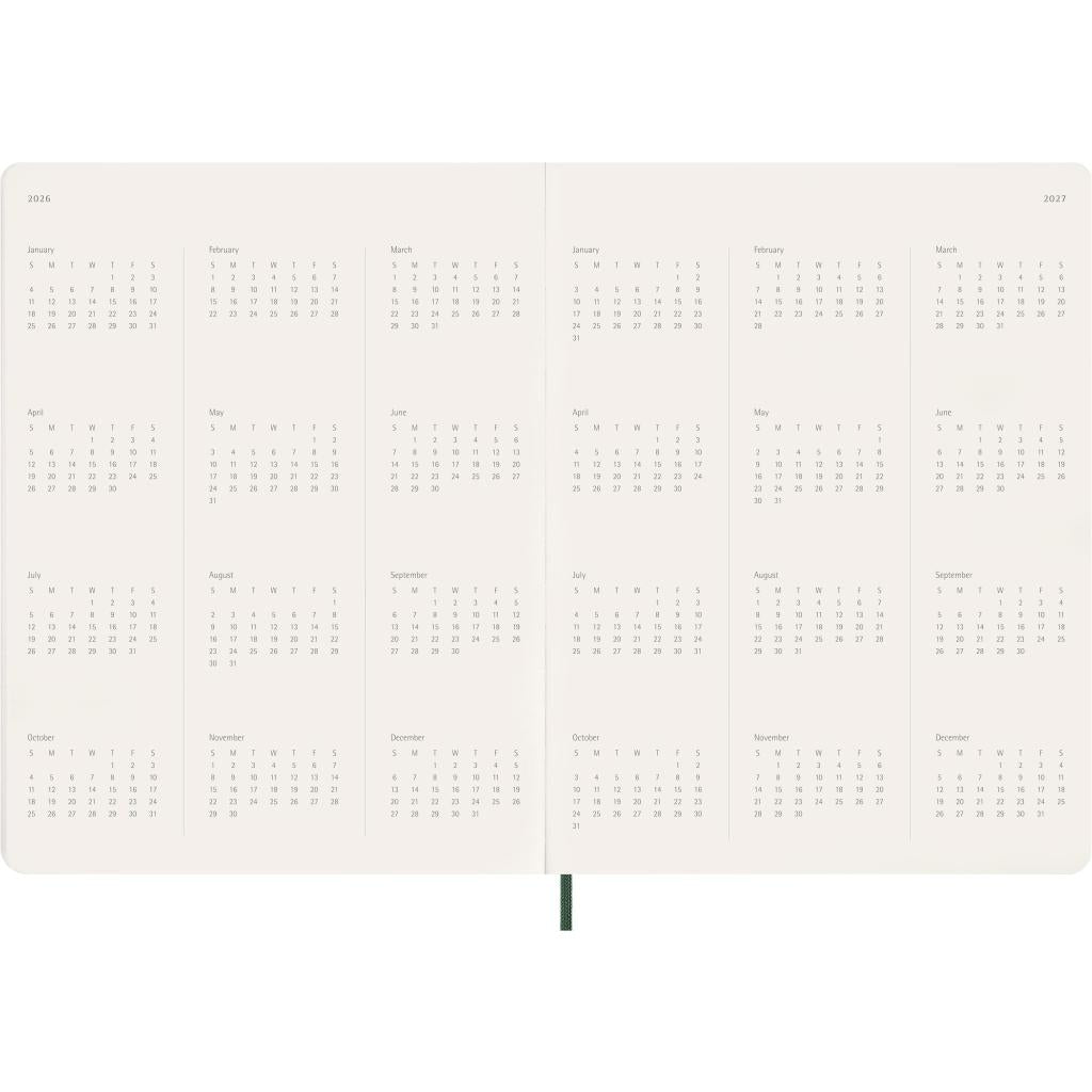 Ihr ultimativer Wochenbegleiter: Der XXL Essential Planner macht Organisation und Planung mühelos. Dieser schlanke und elegante Planer im unverwechselbaren Moleskine-Design hat einen flexiblen und dennoch robusten Einband. Im Inneren ist jede Woche auf zwei Seiten dargestellt. Die Wochentage werden vertikal angezeigt, mit stündlichen Feldern für Ihre Termine von 7 bis 20 Uhr, außer Samstag und Sonntag, die ohne Zeitangabe sind. Jede Woche enthält außerdem einen kleinen 3-Monats-Kalender, um Ihrer Planung eine gewisse Perspektive zu geben. Dieser Terminkalender ist so konzipiert, dass er den Bedürfnissen aller gerecht wird, von Pädagogen und Studenten bis hin zu Berufstätigen und Familien. Er deckt 15 Monate von Oktober 2025 bis Ende Januar 2026 ab und bietet so zusätzliche Flexibilität. Wir haben viele Aufkleber und eine Auswahl an Haftnotizen in die hintere Tasche eingesteckt, um Termine hervorzuheben und Ihre Pläne zu personalisieren. Ein diskretes Lesezeichenband markiert Ihren Platz, während der elastische Verschluss für Privatsphäre sorgt und alle losen Notizen sicher im Inneren verstaut. Wie alle unsere Planer beginnt auch der Essential Planner mit einer Seite für persönliche Daten und einer Übersicht über das laufende und das kommende Jahr, um den Überblick zu behalten. Am Ende des Plans gibt es außerdem freie Seiten für zufällige Notizen und Gedanken.