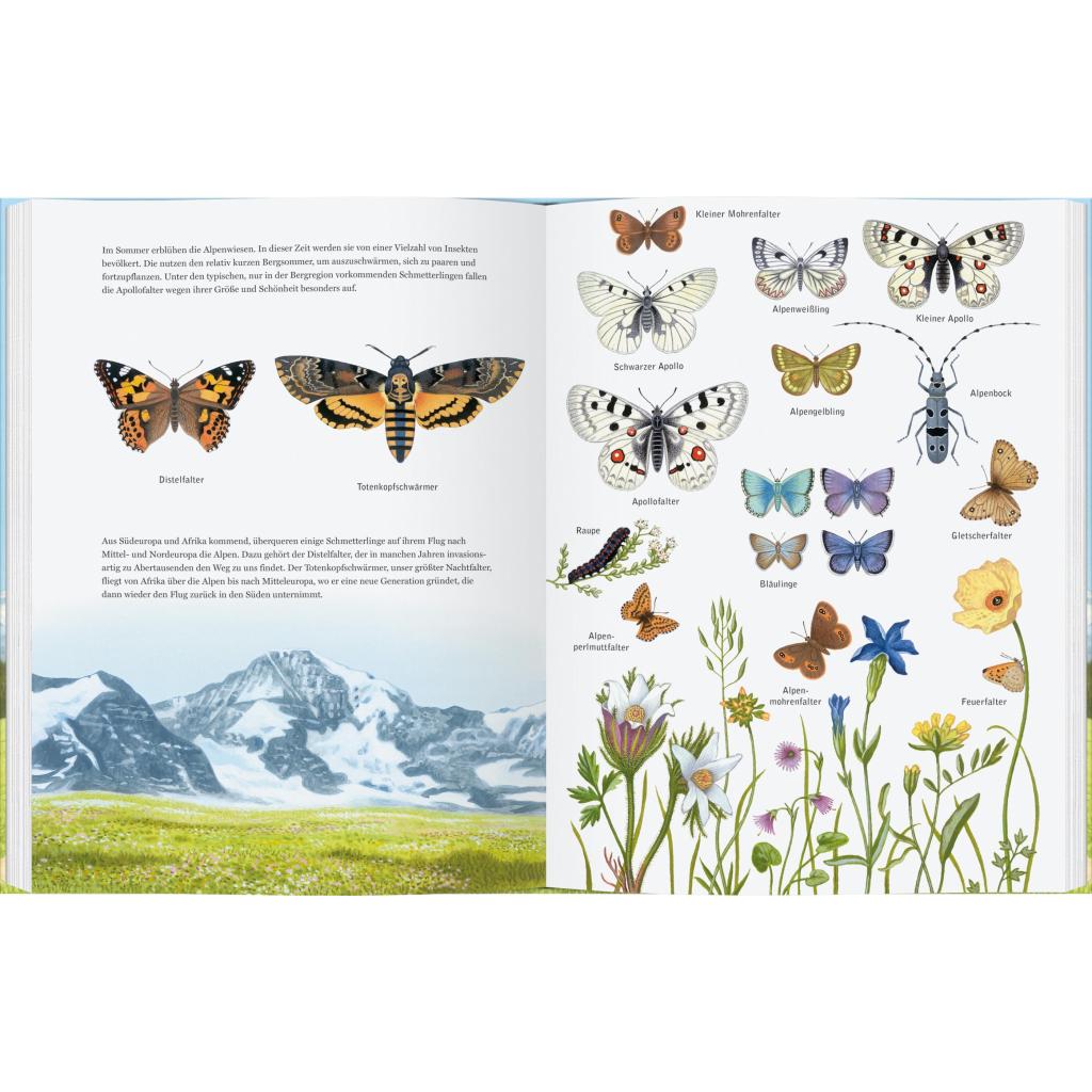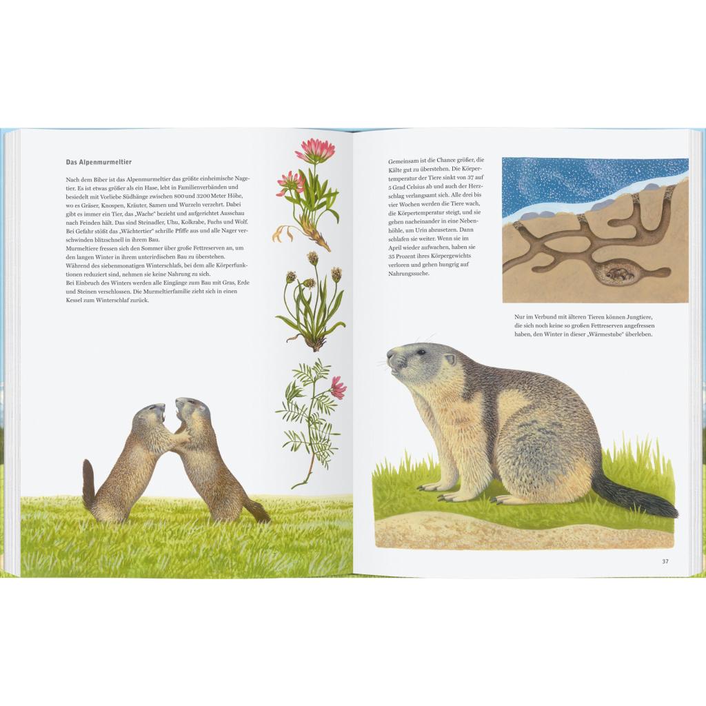 In diesem informativen und mit größter Detailgenauigkeit bebilderten Kindersachbuch präsentiert der preisgekrönte Illustrator Thomas Müller die Tiere der Bergwelt, vom Bergwald bis hinauf in die Gletscherzone. Die Berge bieten auf unterschiedlichen Höhen ganz verschiedene Lebensräume. Den Tieren, die hier zu Hause sind, widmet sich dieses großformatige, prachtvoll illustrierte Buch und zeigt das Leben in den Bergen in seinem ganzen Reichtum. Manche, wie Alpenschneehuhn und Bergmolch, tragen ihre Heimat schon im Namen. Auch Braunbär, Luchs und Steinadler sind in den Bergen anzutreffen. Sie alle und selbst so verborgen lebende Tiere wie Gletscherfloh und Schneemaus können wir mit diesem Buch entdecken!