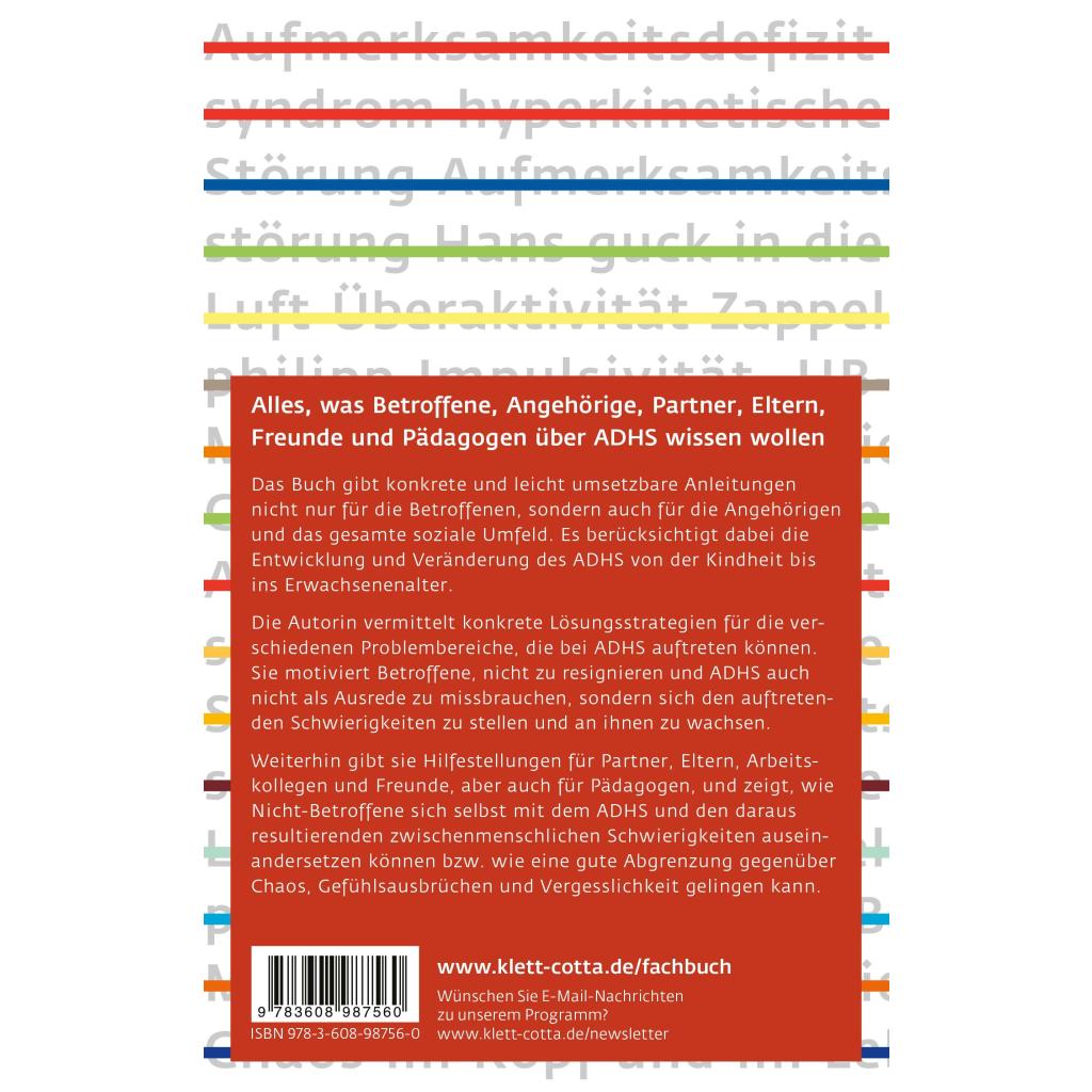 Alles, was Betroffene, Angehörige, Partner, Eltern,Freunde und Pädagogen über ADHS wissen wollen Das Buch gibt konkrete und leicht umsetzbare Anleitungen nicht nur für die Betroffenen, sondern auch für die Angehörigen und das gesamte soziale Umfeld. Es berücksichtigt dabei die Entwicklung und Veränderung des ADHS von der Kindheit bis ins Erwachsenenalter. Die Autorin vermittelt konkrete Lösungsstrategien für die verschiedenen Problembereiche, die bei ADHS auftreten können. Sie motiviert Betroffene, nicht zu resignieren und ADHS auch nicht als Ausrede zu missbrauchen, sondern sich den auftretenden Schwierigkeiten zu stellen und an ihnen zu wachsen. Weiterhin gibt sie Hilfestellungen für Partner, Eltern, Arbeitskollegen und Freunde, aber auch für Pädagogen, und zeigt, wie Nicht-Betroffene sich selbst mit dem ADHS und den daraus resultierenden zwischenmenschlichen Schwierigkeiten auseinandersetzen können bzw. wie eine gute Abgrenzung gegenüber Chaos, Gefühlsausbrüchen und Vergesslichkeit gelingen kann.