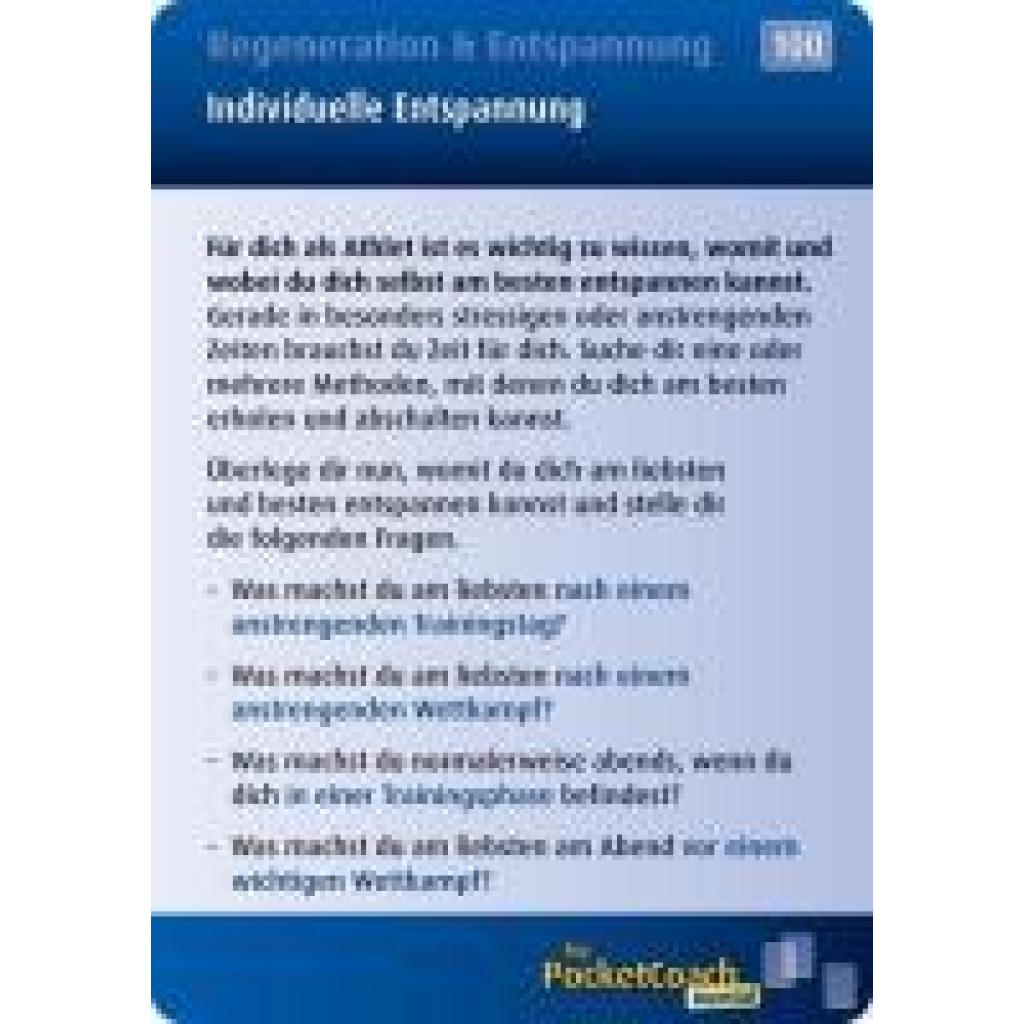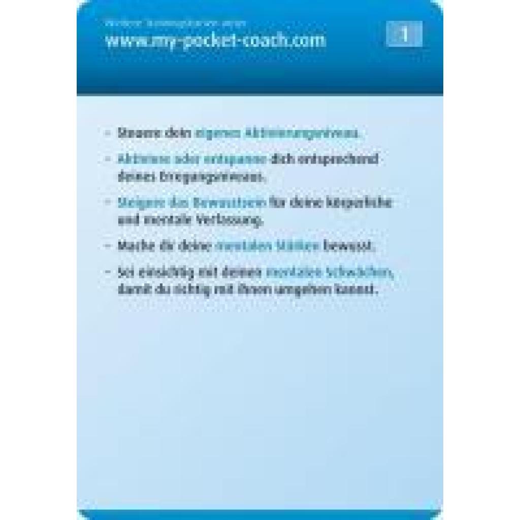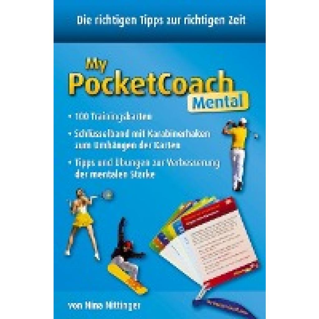 My-Pocket-Coach ist das ultimative Tool für Athleten und Trainer, um die mentale Stärke im Training und bei Wettkämpfen gezielt zu verbessern. Athleten treffen während ihrer Laufbahn auf viele schwierige Situationen und entscheidende Momente, mit denen sie richtig umgehen müssen. Mentale Stärke spielt eine enorm wichtige Rolle, um die sportliche Leistungsfähigkeit voll ausschöpfen bzw. sie aufrecht erhalten zu können. Mit My-Pocket-Coach Mental können Athleten sich schnell wichtige Kenntnisse aus dem mentalen Bereich aneignen. Praktische Übungen helfen, die mentale Stärke gezielt aufzubauen. Im Training oder unterwegs zu Wettkämpfen gibt My-Pocket-Coach immer die richtigen Tipps für entscheidende Momente. Einfach eine individuelle Auswahl an Trainingskarten zusammenstellen, an das Schlüsselband hängen und los geht's! My-Pocket-Coach Mental: 100 Trainingskarten inkl. Schlüsselband mit Karabinerhaken zum Umhängen der Karten.