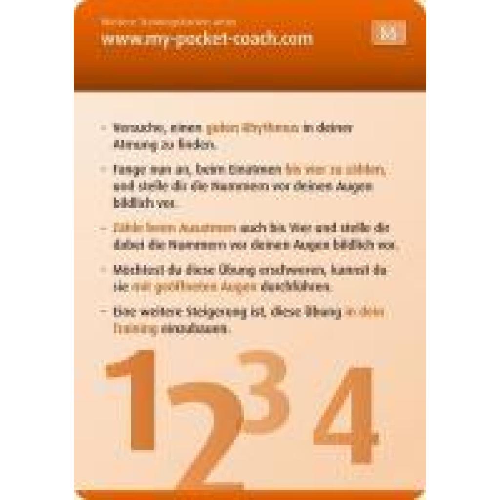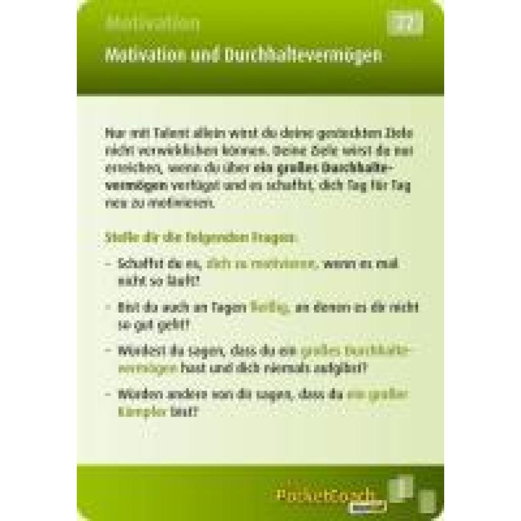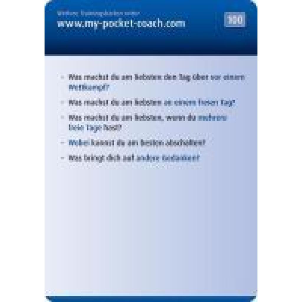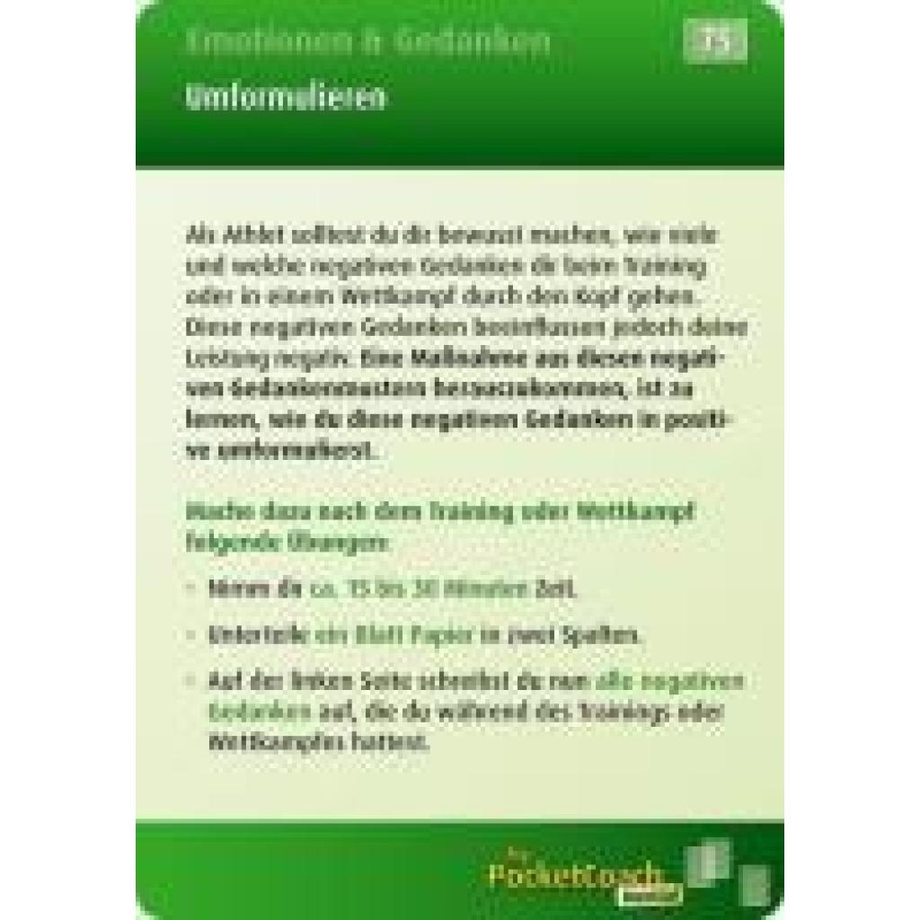 My-Pocket-Coach ist das ultimative Tool für Athleten und Trainer, um die mentale Stärke im Training und bei Wettkämpfen gezielt zu verbessern. Athleten treffen während ihrer Laufbahn auf viele schwierige Situationen und entscheidende Momente, mit denen sie richtig umgehen müssen. Mentale Stärke spielt eine enorm wichtige Rolle, um die sportliche Leistungsfähigkeit voll ausschöpfen bzw. sie aufrecht erhalten zu können. Mit My-Pocket-Coach Mental können Athleten sich schnell wichtige Kenntnisse aus dem mentalen Bereich aneignen. Praktische Übungen helfen, die mentale Stärke gezielt aufzubauen. Im Training oder unterwegs zu Wettkämpfen gibt My-Pocket-Coach immer die richtigen Tipps für entscheidende Momente. Einfach eine individuelle Auswahl an Trainingskarten zusammenstellen, an das Schlüsselband hängen und los geht's! My-Pocket-Coach Mental: 100 Trainingskarten inkl. Schlüsselband mit Karabinerhaken zum Umhängen der Karten.