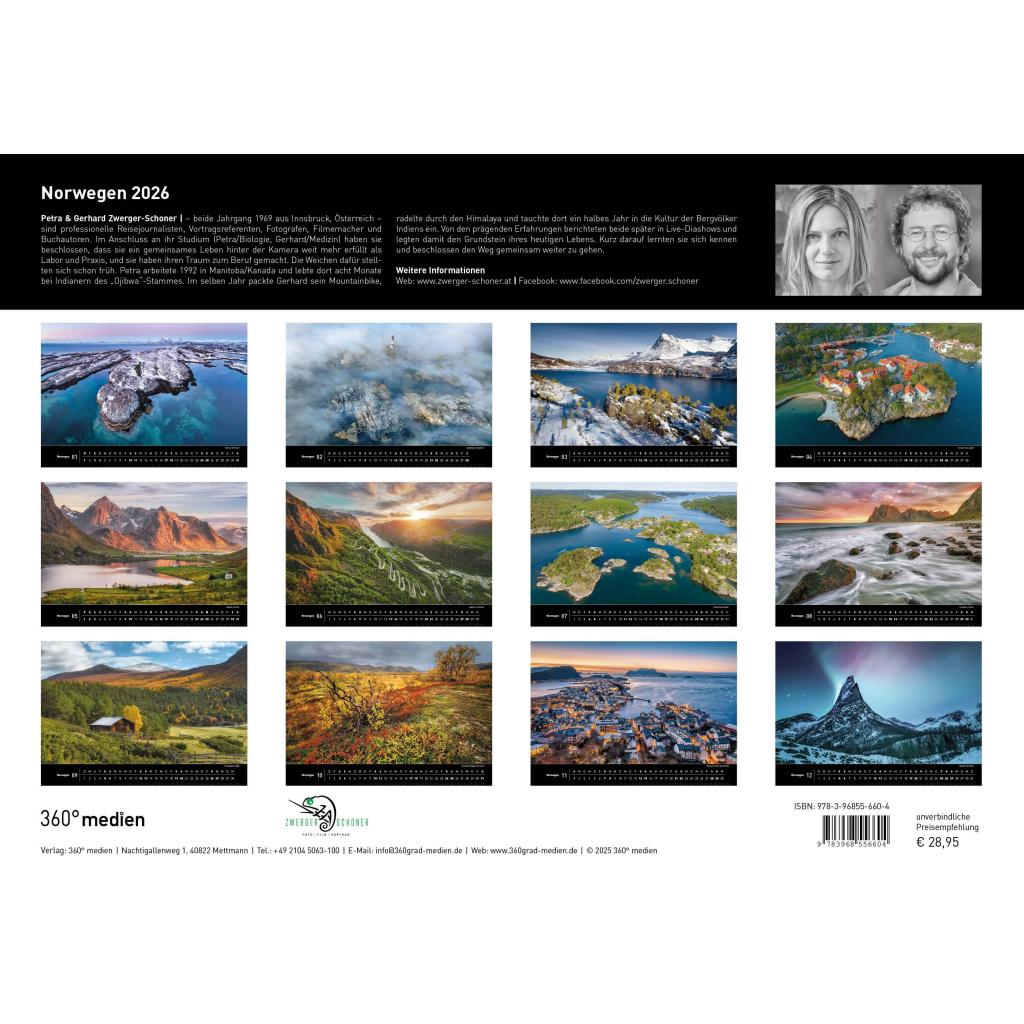 Aus traumhaften Norwegen-Aufnahmen der Fotografen Petra und Gerhard Zwerger-Schoner hat die Redaktion von 360° medien die 13 schönsten Motive ausgewählt und in diesem Kalender zusammen gestellt. Präsentiert werden die Fotos auf hochwertigem Papier im Format 50 cm x 35 cm.