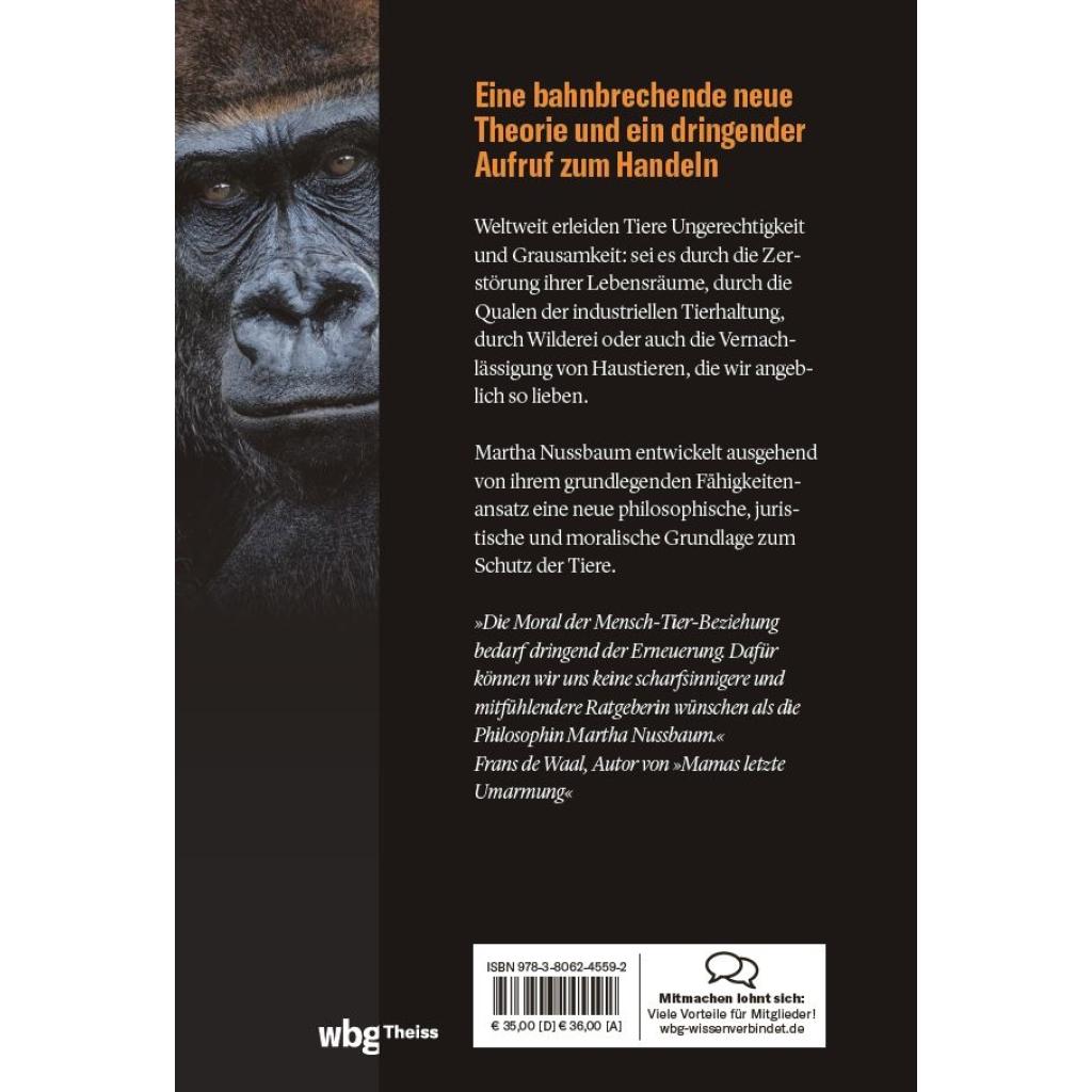 Ein dringender Appell zum Schutz aller Tiere von der berühmten Philosophin Weltweit sind Tiere in Not: sei es durch die Zerstörung ihrer Lebensräume, sei es durch die Qualen der industriellen Tierhaltung, durch Wilderei oder durch die Vernachlässigung von Haustieren, die wir angeblich so lieben. Tiere erleiden jeden Tag Ungerechtigkeit und Grausamkeit durch unsere Hände. Martha Nussbaum entwickelt, ausgehend von ihrem grundlegenden Fähigkeiten-Ansatz, eine neue philosophische, juristische und moralische Grundlage zum Schutz der Tiere. Von Delfinen bis Krähen, von Elefanten bis Tintenfischen schildert sie das Leben von Tieren mit Staunen, Ehrfurcht und Mitgefühl und weist den Weg in eine Welt, in der wir Menschen Freunde der Tiere sind und nicht Ausbeuter oder Nutzer. Ausweitung von Nussbaums Fähigkeiten-Ansatz auf die Tierwelt Ein Handbuch für Veränderungen in Politik und Recht Ein ehrlicher Ratgeber für die ethische Koexistenz mit allen Lebewesen der Erde Kritische Auseinandersetzung mit verschiedenen Strömungen der Tierethik Das aktuelle und persönlichste Buch der berühmten Denkerin, gewidmet ihrer verstorbenen Tochter Ein Fundament für die politischen Rechte der Tiere Mit eindringlicher Klarheit und großer Einfühlsamkeit erklärt Martha Nussbaum, warum wir Verantwortung für die artenreiche Welt, in der wir leben, übernehmen müssen und wie wir das tun können. Sie schärft unseren Blick dafür, was wir unseren nicht-menschlichen Mitgeschöpfen schulden und entwickelt einen Handlungsplan, um großen und kleinen Lebewesen auf wichtige und entscheidende Weise zu helfen. Jedes Tier muss die Chance haben, auf seine eigene Weise zu gedeihen, und wir haben die kollektive Pflicht, uns dem Leid der Tiere zu stellen und es zu beseitigen. Martha Nussbaums bahnbrechende Theorie ist ein dringender Aufruf zum Handeln und ein Ratgeber für Veränderungen in Politik und Recht, sodass wir unserer ethischen Verantwortung gegenüber allen Lebewesen der Erde gerecht werden können.