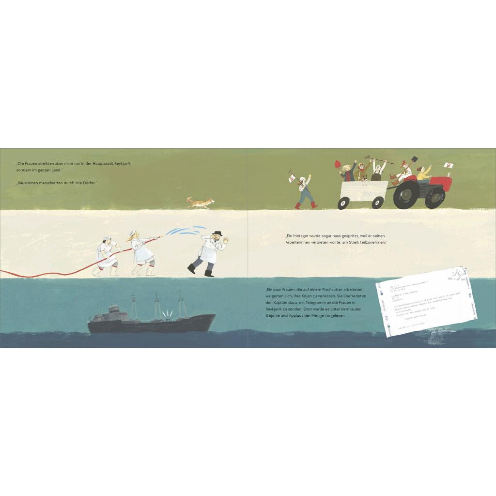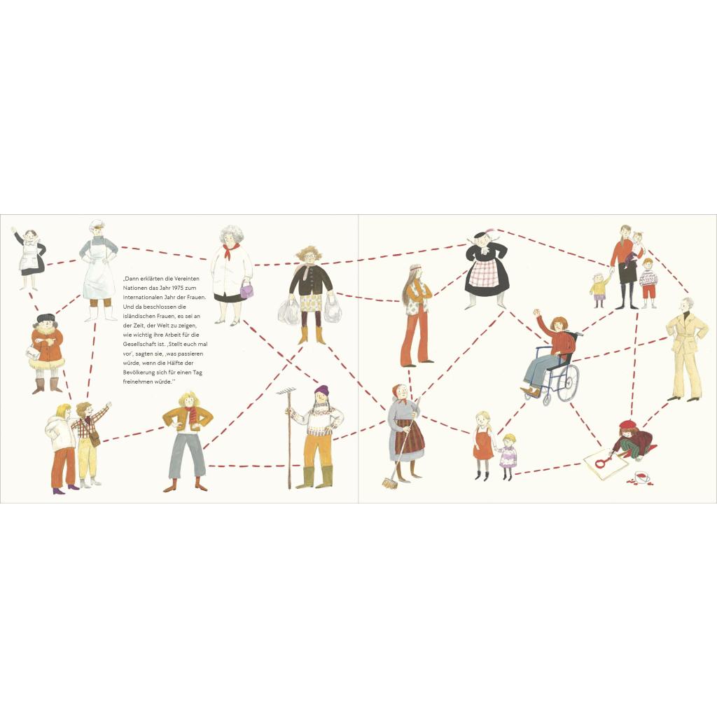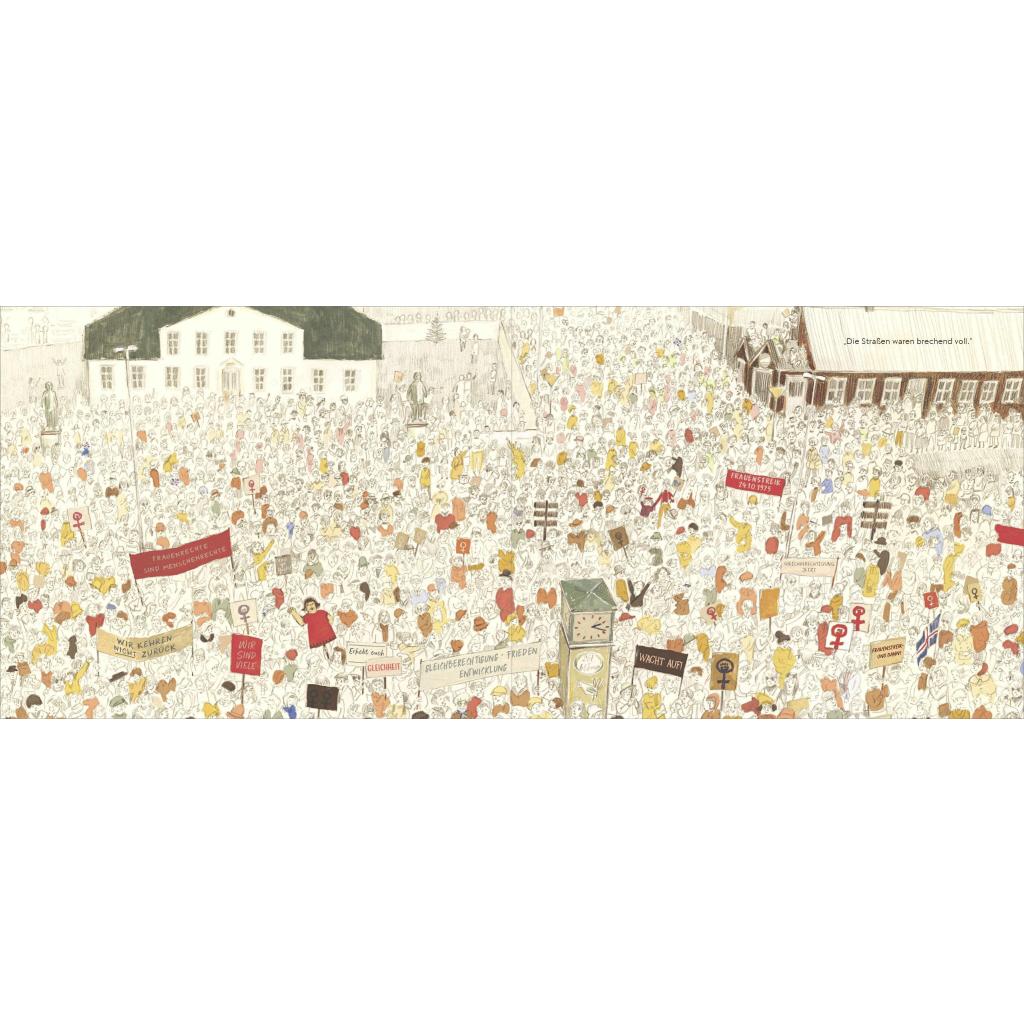 Ein inspirierendes Sachbilderbuch Vera und ihre Mama fahren in die Stadt, um für Frauenrechte zu demonstrieren, genau wie es die isländischen Frauen am sogenannten Langen Freitag im Jahr 1975 gemacht haben. Veras Mama erzählt, dass sich die Frauen an diesem Tag einfach freigenommen haben. Mamas und Omas, Fabrikarbeiterinnen, Lehrerinnen und sogar Seefahrerinnen haben ihre Arbeit niedergelegt und sind gemeinsam durch die Städte und Dörfer Islands marschiert, um für ihre Rechte zu kämpfen. Zusammen mit Vera erfahren kleine Leserinnen und Leser, wie dieser Streik nicht nur Frauen auf der ganzen Welt inspiriert, sondern auch große Veränderungen bewirkt hat. Mit einfachen Texten und kindlichen Illustrationen zeigt dieses eindrucksvolle Bilderbuch, was Frauen gemeinsam erreichen können. Nominiert für den Deutschen Jugendliteraturpreis 2025 in der Kategorie Sachbuch Jurybegründung: Wenn alle Frauen eines Landes einen Tag lang streiken, macht dies sicht- und spürbar, wie unverzichtbar ihre Arbeit ist. So geschehen in Island am 24. Oktober 1975. An diesem "Langen Freitag" ließen 90 Prozent aller Frauen ihre Arbeit ruhen und legten damit das Land lahm. Davon erzählt dieses zeitgeschichtliche Sachbilderbuch in einfachen Sätzen und mit farbenfrohen Illustrationen. Die kleine Anna und ihre Mutter machen sich fertig für eine Frauenrechtsdemonstration, da beginnt die Mutter von ihren Kindheitserinnerungen zum Frauenstreik 1975 zu erzählen. Sie spricht über die gesellschaftsbewegende Bedeutung des historischen Ereignisses und über ihr eigenes kindliches Erleben. Heute wie damals ziehen Frauen gemeinsam durch die Straßen mit der Parole "Ich traue mich! Ich kann es! Ich mache mit!" Beseelt von der gemeinschaftsstiftenden Aktion will auch Anna die Idee des Protests weitertragen. Mit Leichtigkeit widmet sich Linda Ólafsdóttir dem nach wie vor aktuellen Thema Frauenrechte. Sie sensibilisiert Kinder für Gleichberechtigung und soziale Fairness und bestärkt sie in ihrem Gerechtigkeitsempfinden. Kraftvoll und schlicht wird eine global einflussreiche soziale Bewegung erklärt und die Bedeutung demokratischer Teilhabe erlebbar gemacht. Anna Schaub hat die diese Schlichtheit gelungen aus dem Englischen übersetzt. Auf der Shortlist für den Heinrich-Wolgast-Preis der GEW 2025 Die Jury begründet ihre Entscheidung wie folgt: Am 24. Oktober 1975 ließen 90 Prozent aller isländischen Frauen ihre Arbeit in den Betrieben, den Schulen und in den Familien ruhen und versammelten sich zu Kundgebungen überall im Land. Annas Mutter erzählt ihrer kleinen Tochter, wie sie als Kind den Streik erlebte und welche Bedeutung er für Frauenkämpfe damals hatte und heute immer noch hat. So empört sich Anna und will nun auch mitmachen. In großen seitenfüllenden Tableaus, in verständlicher Sprache und anschaulichen farbenfrohen Bildern veranschaulicht Ólafsdóttir die Stimmung der mutigen Frauen damals und den fortdauernden Kampf. Lustvoll illustriert sie in witzigen Einzelszenen das streikbedingte Ungemach für Männer in Betrieben und im Haushalt.