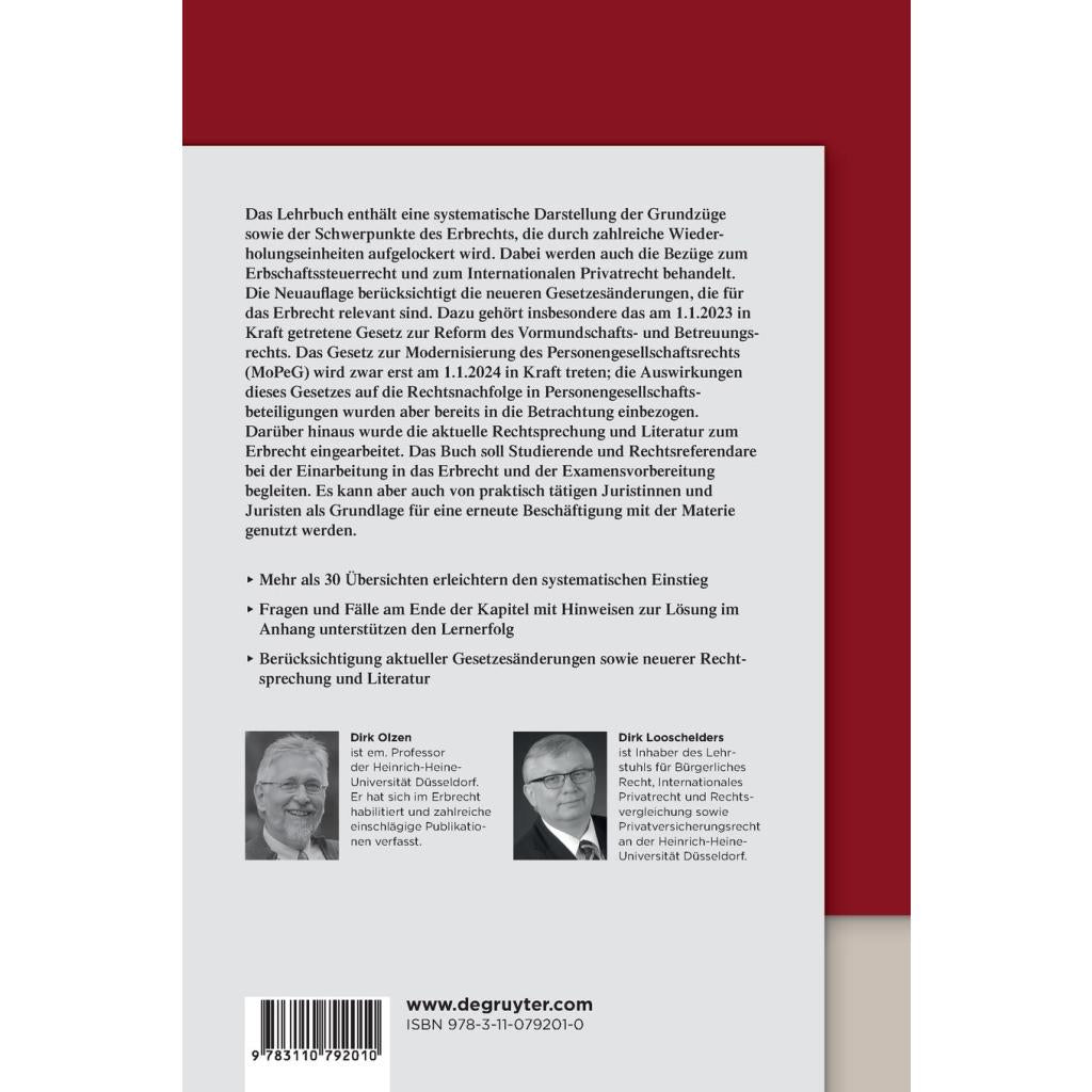 Das Lehrbuch enthält eine systematische Darstellung der Grundzüge sowie der Schwerpunkte des Erbrechts, die durch zahlreiche Wiederholungseinheiten aufgelockert wird. Dabei werden auch die Bezüge zum Erbschaftssteuerrecht und zum Internationalen Privatrecht behandelt. Die Neuauflage berücksichtigt die neueren Gesetzesänderungen, die für das Erbrecht relevant sind. Dazu gehört insbesondere das am 1.1.2023 in Kraft getretene Gesetz zur Reform des Vormundschafts- und Betreuungsrechts. Das Gesetz zur Modernisierung des Personengesellschaftsrechts (MoPeG) wird zwar erst am 1.1.2024 in Kraft treten; die Auswirkungen dieses Gesetzes auf die Rechtsnachfolge in Personengesellschaftsbeteiligungen wurden aber bereits in die Betrachtung einbezogen. Darüber hinaus wurde die aktuelle Rechtsprechung und Literatur zum Erbrecht eingearbeitet. Das Buch soll Studierende und Rechtsreferendare bei der Einarbeitung in das Erbrecht und der Examensvorbereitung begleiten. Es kann aber auch von praktisch tätigen Juristinnen und Juristen als Grundlage für eine erneute Beschäftigung mit der Materie genutzt werden.