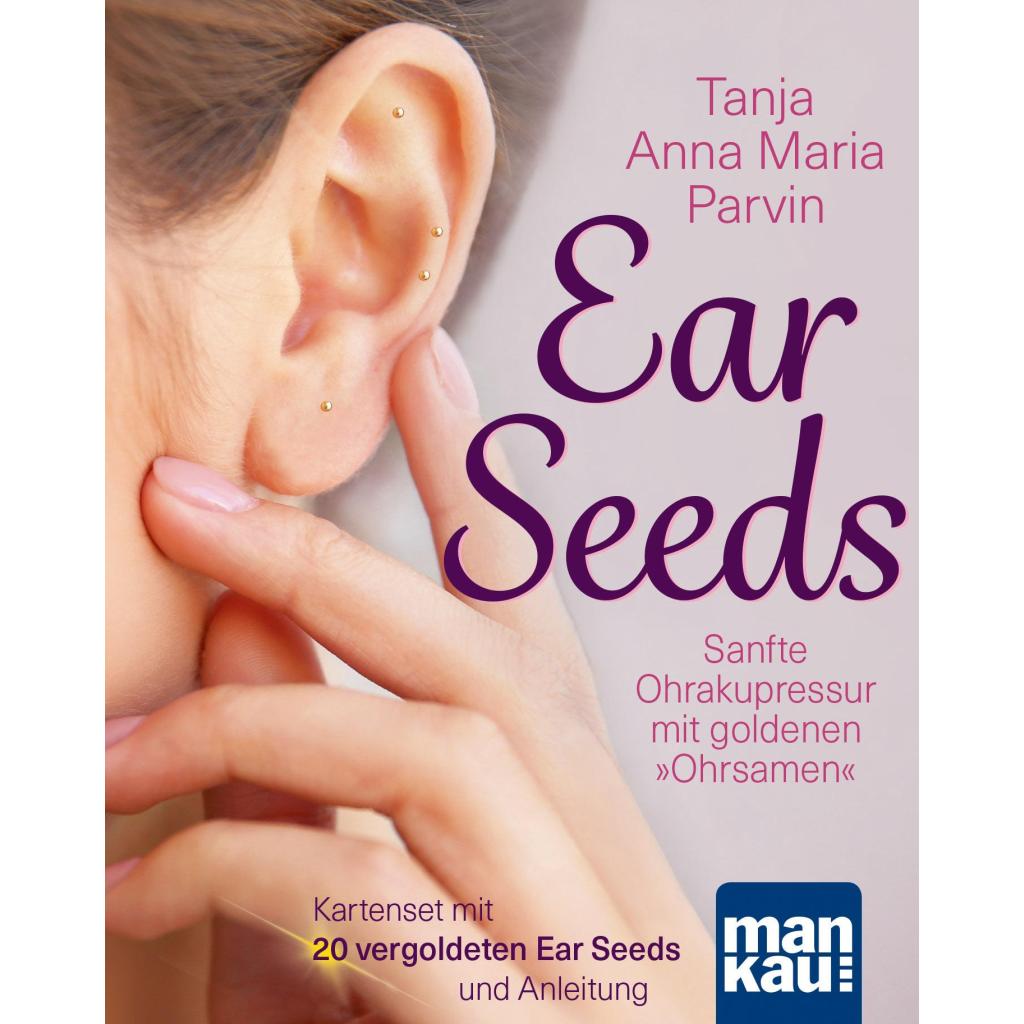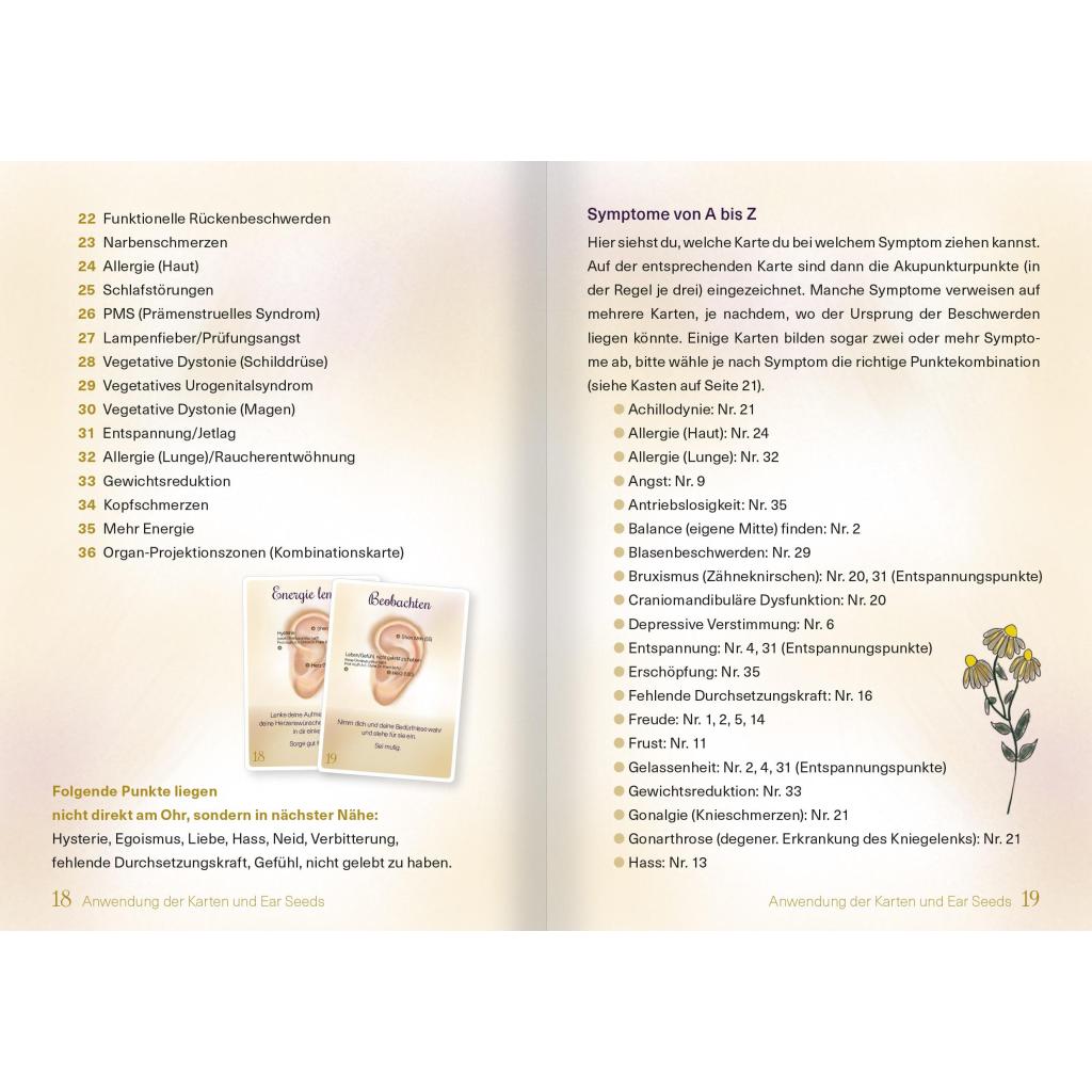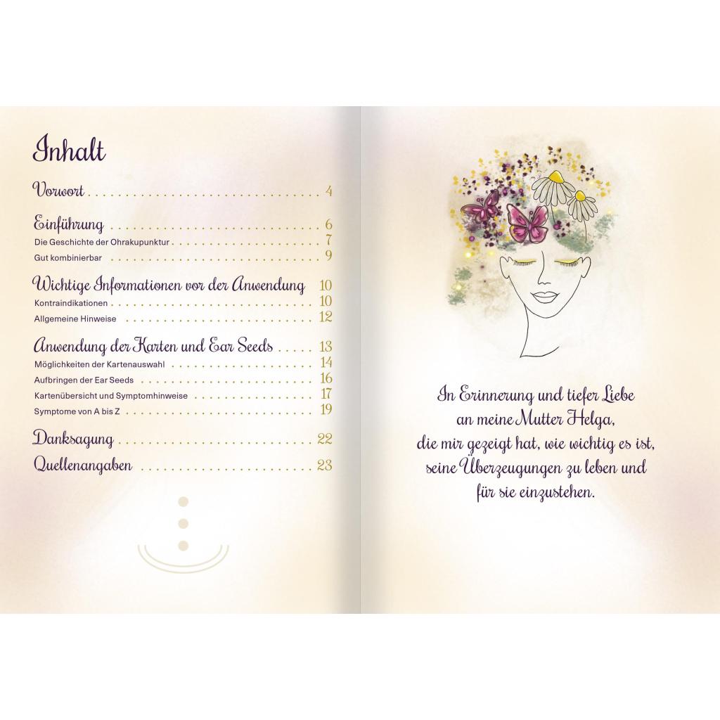 Sanfte Ohrakupressur mit goldenen "Ohrsamen". Set mit 36 Karten, 20 vergoldeten Ear Seeds und Anleitung