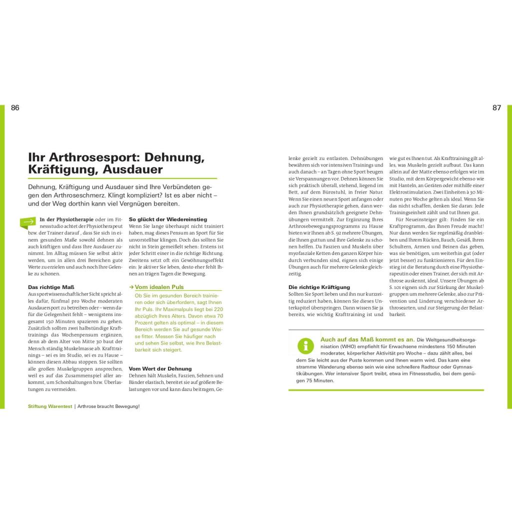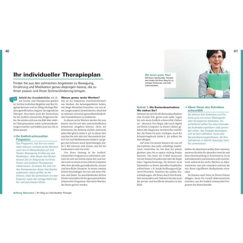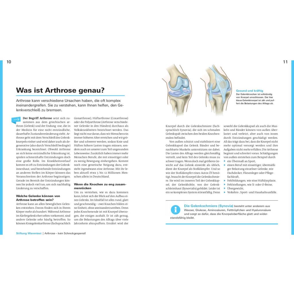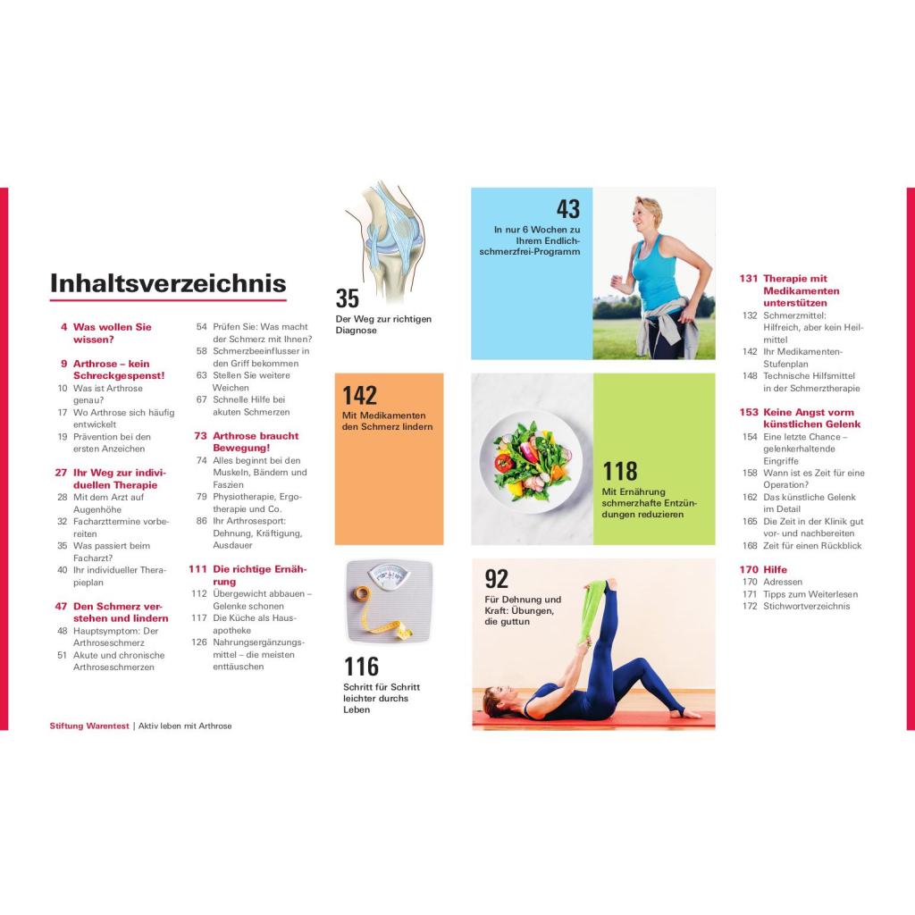 Schmerzen lindern für ein aktives Leben. Sie werden von Knieschmerzen und Problemen im Hüftgelenk geplagt? Ihre Rückenschmerzen rauben Ihnen den Schlaf? Bis zu acht Millionen Deutsche leiden unter den Symptomen einer Arthrose. Was ist Arthrose? Wie finde ich den richtigen Arzt? Welche Schmerztherapie ist am besten für mich geeignet? Diese Fragen und viele mehr werden in diesem Ratgeber beantwortet. Die bekanntesten Formen der Gelenkverschleißerkrankung sind die Coxarthrose, die Gonarthrose und der Hallux rigidus. Arthrose kann verschiedene Ursachen und viele Geschichten haben, die oft komplex ineinandergreifen. Vor allem Gelenke, die Tag für Tag belastet werden, sind für einen Verschleiß anfällig. Die Erkrankung der Gelenke mag zu Einschränkungen führen, jedoch haben Sie der Krankheit allerhand entgegenzusetzten. Sie zu verstehen, kann Ihnen helfen, den Gelenkverschleiss zu bremsen. Stiftung Warentest zeigt, wie Sie in wenigen Wochen Ihren persönlichen Anti-Schmerz-Plan erstellen und Ihr aktives Leben zurückgewinnen. Mit einfachen Übungen zur Dehnung und Kräftigung, Bewegung der Faszien und Sehnen, der richtigen Ernährung, Gewichtsverlust und vielem mehr, zeigen Ihnen unsere Experten was guttut und wirklich hilft. Entdecken Sie die für Sie passenden Sportarten und Übungen für eine wirkungsvolle Therapie. Das Buch nimmt Arthrose den Schrecken und räumt auf mit Ängsten vor Unheilbarkeit, Schmerzen und Operation. Je früher Sie gegensteuern, desto mehr Erfolg ist möglich. Legen Sie am besten gleich los!