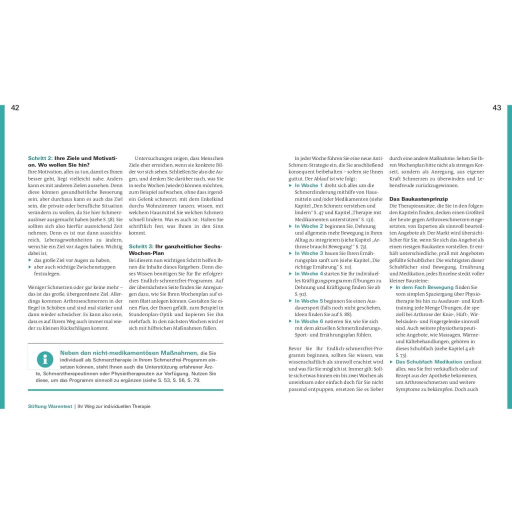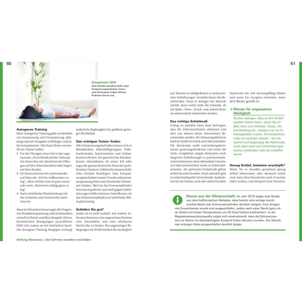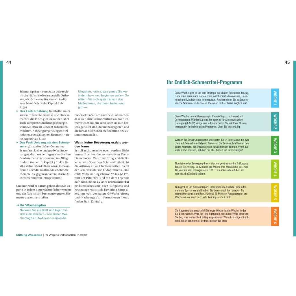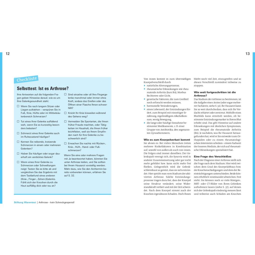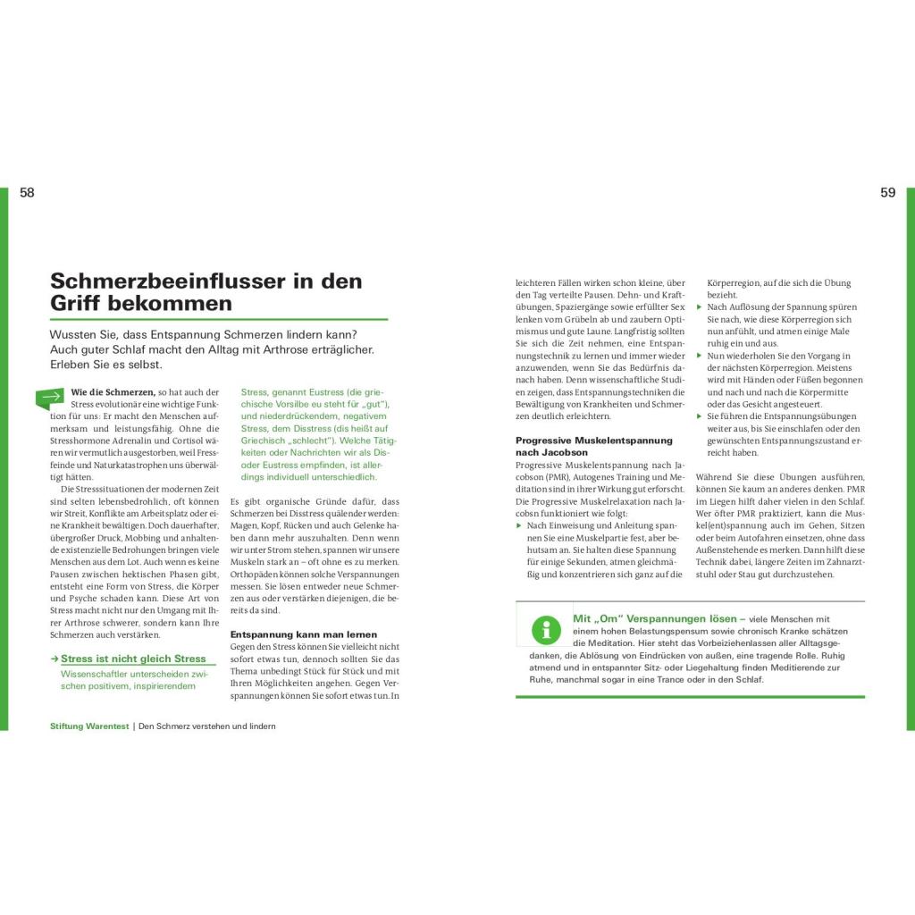 Schmerzen lindern für ein aktives Leben. Sie werden von Knieschmerzen und Problemen im Hüftgelenk geplagt? Ihre Rückenschmerzen rauben Ihnen den Schlaf? Bis zu acht Millionen Deutsche leiden unter den Symptomen einer Arthrose. Was ist Arthrose? Wie finde ich den richtigen Arzt? Welche Schmerztherapie ist am besten für mich geeignet? Diese Fragen und viele mehr werden in diesem Ratgeber beantwortet. Die bekanntesten Formen der Gelenkverschleißerkrankung sind die Coxarthrose, die Gonarthrose und der Hallux rigidus. Arthrose kann verschiedene Ursachen und viele Geschichten haben, die oft komplex ineinandergreifen. Vor allem Gelenke, die Tag für Tag belastet werden, sind für einen Verschleiß anfällig. Die Erkrankung der Gelenke mag zu Einschränkungen führen, jedoch haben Sie der Krankheit allerhand entgegenzusetzten. Sie zu verstehen, kann Ihnen helfen, den Gelenkverschleiss zu bremsen. Stiftung Warentest zeigt, wie Sie in wenigen Wochen Ihren persönlichen Anti-Schmerz-Plan erstellen und Ihr aktives Leben zurückgewinnen. Mit einfachen Übungen zur Dehnung und Kräftigung, Bewegung der Faszien und Sehnen, der richtigen Ernährung, Gewichtsverlust und vielem mehr, zeigen Ihnen unsere Experten was guttut und wirklich hilft. Entdecken Sie die für Sie passenden Sportarten und Übungen für eine wirkungsvolle Therapie. Das Buch nimmt Arthrose den Schrecken und räumt auf mit Ängsten vor Unheilbarkeit, Schmerzen und Operation. Je früher Sie gegensteuern, desto mehr Erfolg ist möglich. Legen Sie am besten gleich los!