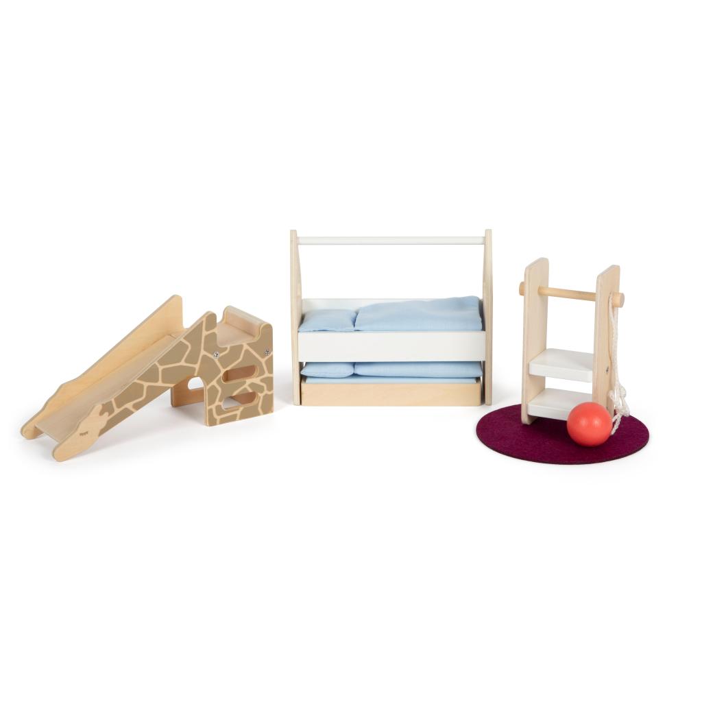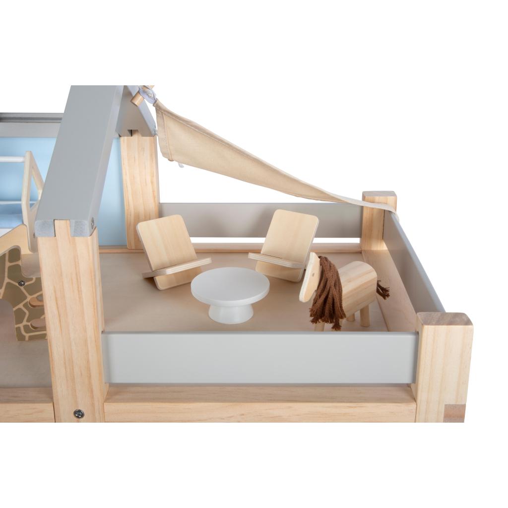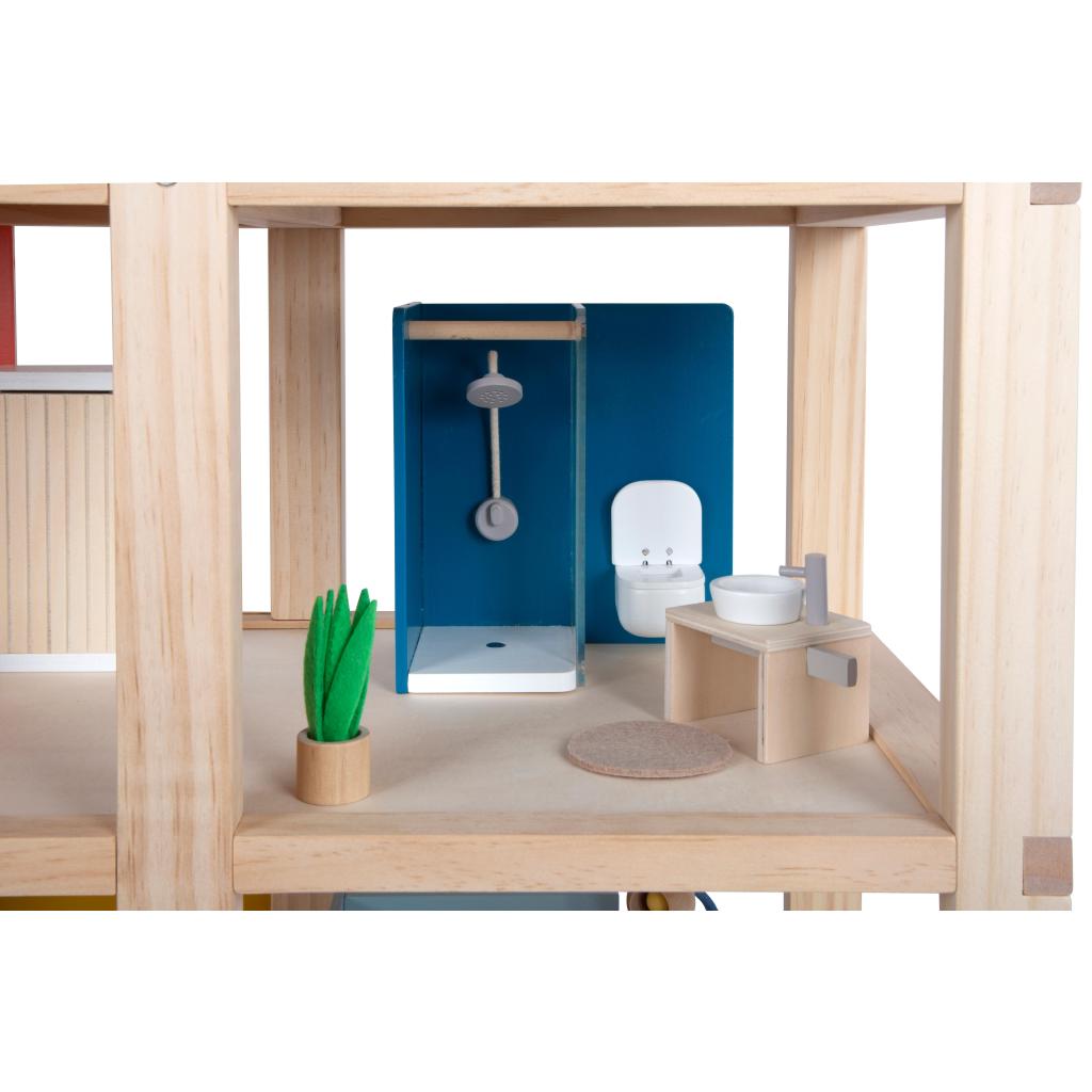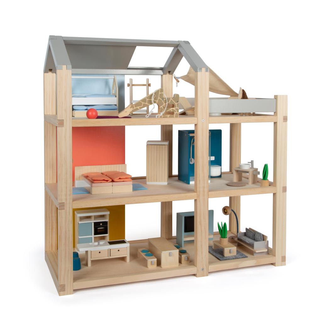 Ein Haus voller Möglichkeiten! Individuelles Design für grenzenlosen Spielspaß und liebevoll ausgestattete Räume sind das, was dieses moderne Puppenhaus auszeichnet: Das Haus erstreckt sich über drei Stockwerke und bietet eine geräumige Dachterrasse. Die verschiebbaren Rückwände ermöglichen es kleinen "Architekten", das Aussehen ihres Puppenhauses immer wieder neu zu gestalten. Mit den doppelseitig verwendbaren Rückwänden kann der Look des Holzpuppenhauses nach eigenem Geschmack verändert werden. Die farbigen Rückwände bringen lebendige Farben ins Spiel, während die unlackierte Seite den natürlichen Holzcharme bewahrt. Auch die Dachfläche des Puppenhauses lässt sich verschieben, sodass Kinder selbst bestimmen können, wo die "Fensterflächen" sein sollen. Dies fördert nicht nur Kreativität im Spiel, sondern auch räumliches Vorstellungsvermögen. Der sichtbare Vollholzanteil verleiht dem Puppenhaus einen modernen skandinavischen Look, der sowohl Kinder als auch Erwachsene begeistert. Das Haus ist mit vielen detailverliebten Puppenhausmöbeln voll ausgestattet, die jeden Raum zum Leben erwecken. Kein zusätzliches Zubehör ist nötig - dieses Puppenhaus ist sofort bereit zum Losspielen! Es gibt ein gemütliches Schlafzimmer, ein farbenfrohes Kinderzimmer mit Giraffenrutsche, ein stilvolles Badezimmer, eine moderne Küche, ein charmantes Esszimmer und ein gemütliches Wohnzimmer. Auf der Dachterrasse laden Möbel, ein Holzpferd und ein passendes Sonnensegel zum Entspannen und Spielen ein. Ideal für Biegepuppen mit einer Größe von 12 cm. Im Puppenhaus beginnt das Spielabenteuer und kein Tag gleicht dem anderen - es ist ein Ort, an dem Träume wahr werden und Kreativität blüht. Das gradlinige Holzhaus bietet unendlich viele Möglichkeiten für fantasievolles Rollenspielen und fördert nebenbei motorische, sprachliche und soziale Kompetenzen. Ausstattung der einzelnen Räume: Schlafzimmer mit zwei Betten (als Doppelbett oder Einzelbetten verwendbar), 2 Kissen, 2 Bettdecken, 1 Kleiderschrank mit Böden und Spiegel, 1 Bogenleuchte und 2 Läufer. Badezimmer mit Dusche und Acrylglasduschwand sowie einstellbarer Brausenhöhe, 1 hängendes WC mit klappbarem Toilettendeckel, 1 Duschvorleger sowie 1 Waschbecken mit Handtuchhalter. Küche mit Hochschrank und freistehender Kücheninsel mit 2 Hockern, Kochplatte, Spülbecken, und 2 entnehmbaren Schubladen, Hochschrank mit Kühl-Gefrierkombination, Küchenregale, bewegliche (Backofen-)Tür, individuell gestaltbare Rückwandpappen für den Hochschrank zum Einschieben. Esszimmer mit Tisch und 2 Bänken inkl. 4 Sitzpolstern. Wohnzimmer mit 1 Sofa inkl. 3 Kissen, großer verstellbarer Bogenlampe, 1 Filzteppich, 1 Wohnzimmertisch, 1 Zimmerpflanze und 1 Flachbildfernseher mit Ablage und 2 wendbaren TV-Programm-Karten (auf der Rückseite bemalbar und zum Einstecken in den Fernseher). Kinderzimmer mit 1 Bett in Hausform inkl. herausziehbarem Gästebett und Bettwäsche, 1 Giraffenrutsche, 1 Ball, 1 Springseil und großem Spielteppich. Balkon mit 2 Loungesesseln, 1 runder Tisch, 1 Holzpferd mit Mähne und Schweif sowie 1 abnehmbares Sonnensegel.