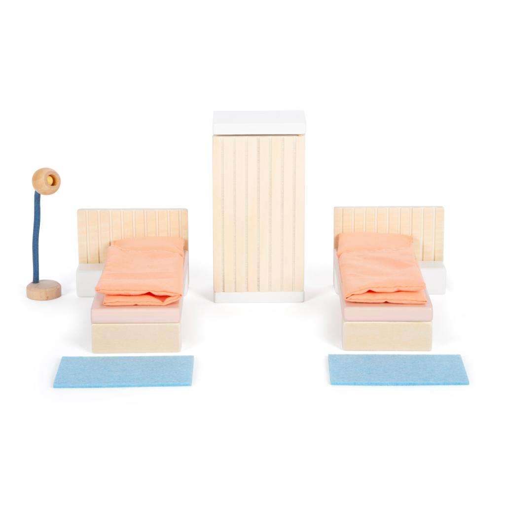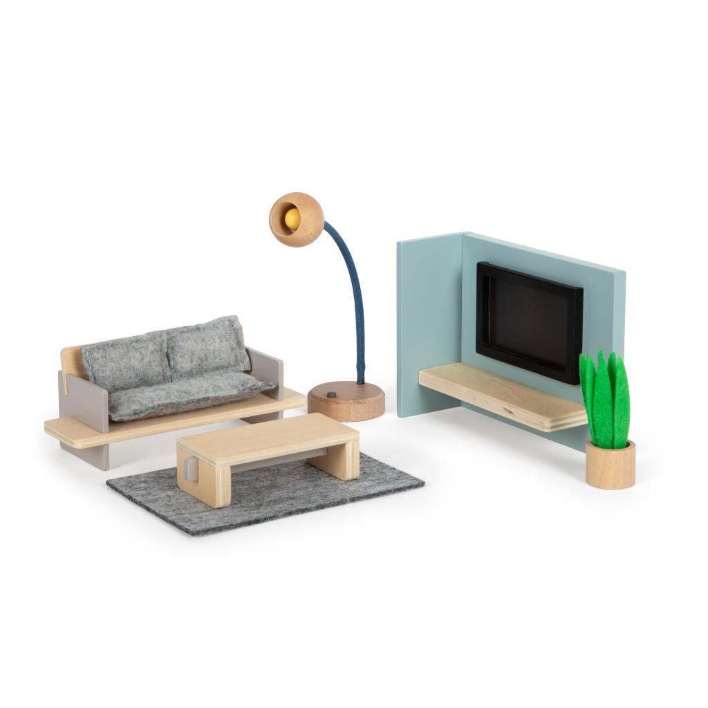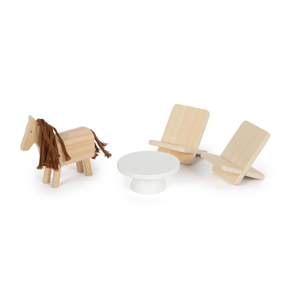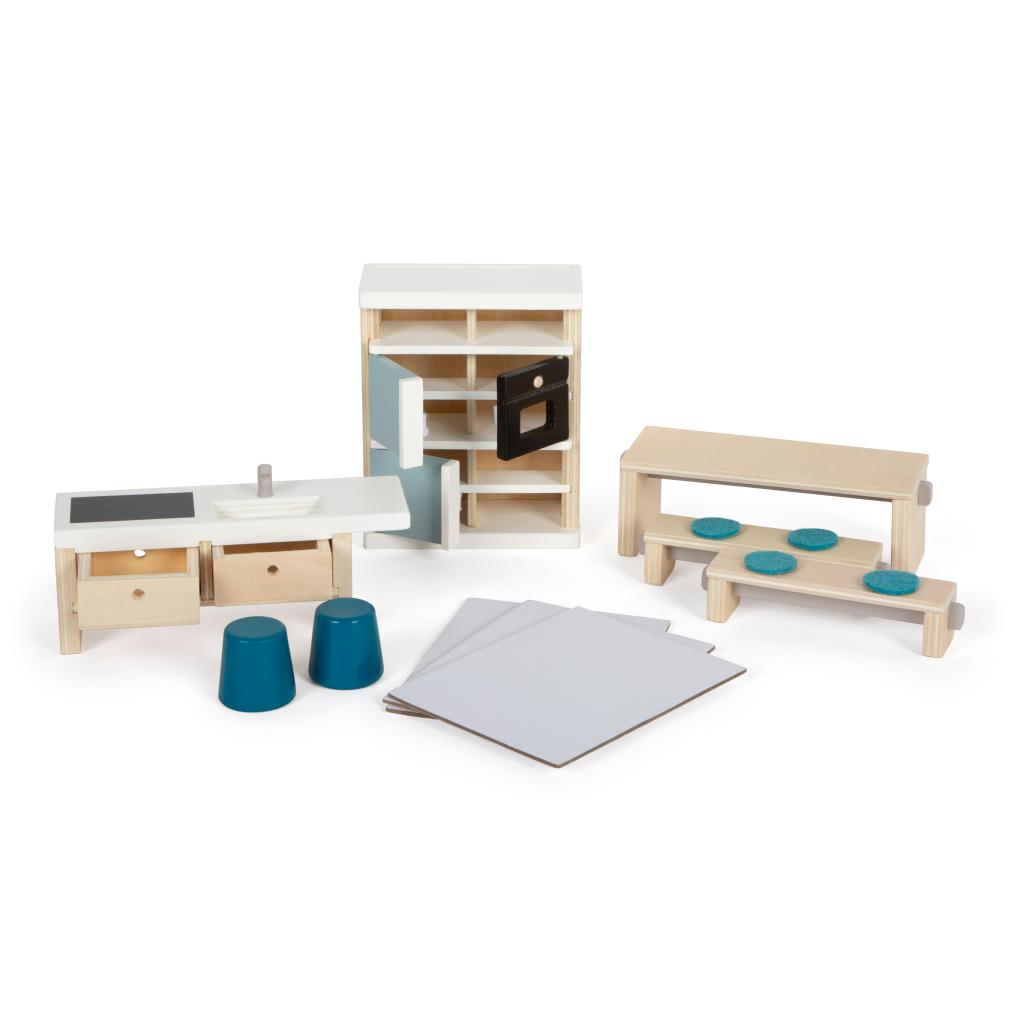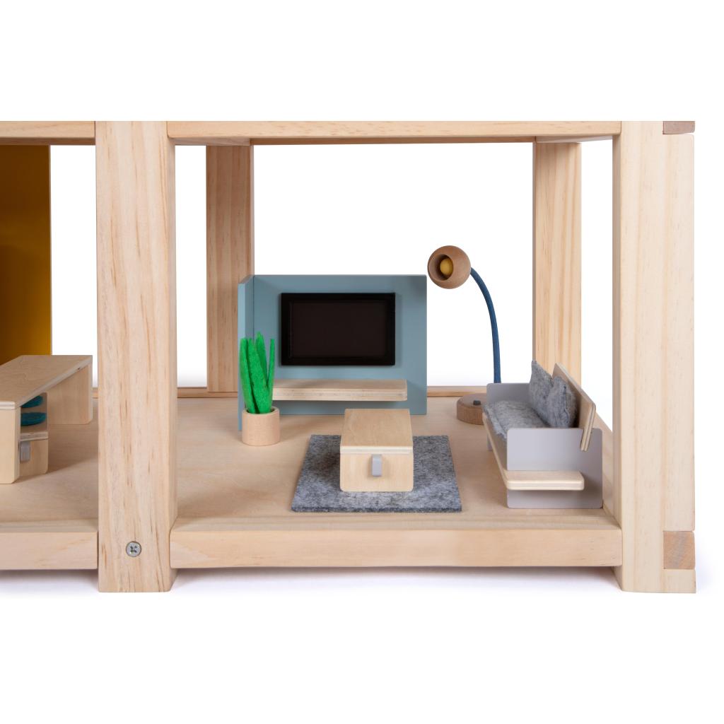 Ein Haus voller Möglichkeiten! Individuelles Design für grenzenlosen Spielspaß und liebevoll ausgestattete Räume sind das, was dieses moderne Puppenhaus auszeichnet: Das Haus erstreckt sich über drei Stockwerke und bietet eine geräumige Dachterrasse. Die verschiebbaren Rückwände ermöglichen es kleinen "Architekten", das Aussehen ihres Puppenhauses immer wieder neu zu gestalten. Mit den doppelseitig verwendbaren Rückwänden kann der Look des Holzpuppenhauses nach eigenem Geschmack verändert werden. Die farbigen Rückwände bringen lebendige Farben ins Spiel, während die unlackierte Seite den natürlichen Holzcharme bewahrt. Auch die Dachfläche des Puppenhauses lässt sich verschieben, sodass Kinder selbst bestimmen können, wo die "Fensterflächen" sein sollen. Dies fördert nicht nur Kreativität im Spiel, sondern auch räumliches Vorstellungsvermögen. Der sichtbare Vollholzanteil verleiht dem Puppenhaus einen modernen skandinavischen Look, der sowohl Kinder als auch Erwachsene begeistert. Das Haus ist mit vielen detailverliebten Puppenhausmöbeln voll ausgestattet, die jeden Raum zum Leben erwecken. Kein zusätzliches Zubehör ist nötig - dieses Puppenhaus ist sofort bereit zum Losspielen! Es gibt ein gemütliches Schlafzimmer, ein farbenfrohes Kinderzimmer mit Giraffenrutsche, ein stilvolles Badezimmer, eine moderne Küche, ein charmantes Esszimmer und ein gemütliches Wohnzimmer. Auf der Dachterrasse laden Möbel, ein Holzpferd und ein passendes Sonnensegel zum Entspannen und Spielen ein. Ideal für Biegepuppen mit einer Größe von 12 cm. Im Puppenhaus beginnt das Spielabenteuer und kein Tag gleicht dem anderen - es ist ein Ort, an dem Träume wahr werden und Kreativität blüht. Das gradlinige Holzhaus bietet unendlich viele Möglichkeiten für fantasievolles Rollenspielen und fördert nebenbei motorische, sprachliche und soziale Kompetenzen. Ausstattung der einzelnen Räume: Schlafzimmer mit zwei Betten (als Doppelbett oder Einzelbetten verwendbar), 2 Kissen, 2 Bettdecken, 1 Kleiderschrank mit Böden und Spiegel, 1 Bogenleuchte und 2 Läufer. Badezimmer mit Dusche und Acrylglasduschwand sowie einstellbarer Brausenhöhe, 1 hängendes WC mit klappbarem Toilettendeckel, 1 Duschvorleger sowie 1 Waschbecken mit Handtuchhalter. Küche mit Hochschrank und freistehender Kücheninsel mit 2 Hockern, Kochplatte, Spülbecken, und 2 entnehmbaren Schubladen, Hochschrank mit Kühl-Gefrierkombination, Küchenregale, bewegliche (Backofen-)Tür, individuell gestaltbare Rückwandpappen für den Hochschrank zum Einschieben. Esszimmer mit Tisch und 2 Bänken inkl. 4 Sitzpolstern. Wohnzimmer mit 1 Sofa inkl. 3 Kissen, großer verstellbarer Bogenlampe, 1 Filzteppich, 1 Wohnzimmertisch, 1 Zimmerpflanze und 1 Flachbildfernseher mit Ablage und 2 wendbaren TV-Programm-Karten (auf der Rückseite bemalbar und zum Einstecken in den Fernseher). Kinderzimmer mit 1 Bett in Hausform inkl. herausziehbarem Gästebett und Bettwäsche, 1 Giraffenrutsche, 1 Ball, 1 Springseil und großem Spielteppich. Balkon mit 2 Loungesesseln, 1 runder Tisch, 1 Holzpferd mit Mähne und Schweif sowie 1 abnehmbares Sonnensegel.