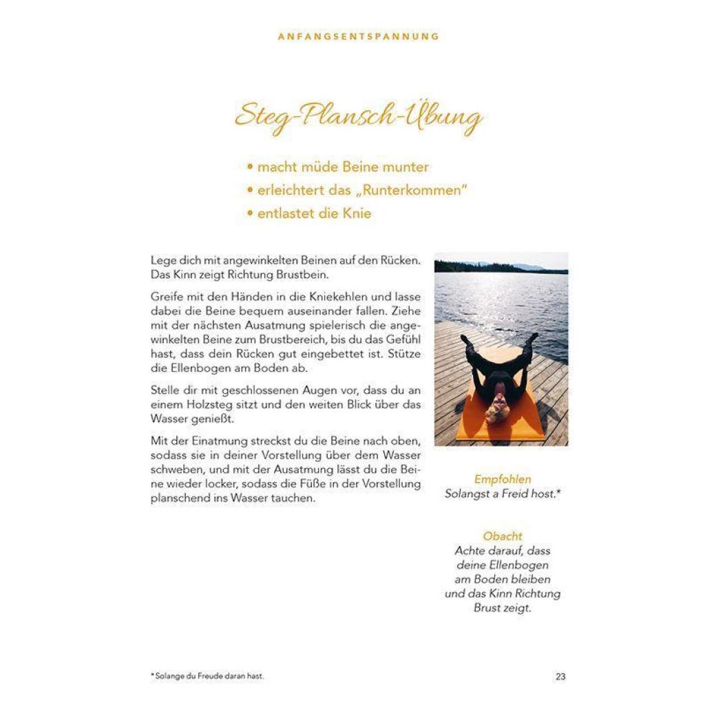 Yoga und Bayern ¿ wie passt das zusammen? Die Autorin Christine Rank findet, dass es höchste Zeit ist, die Verbindung zwischen den heimischen Wurzeln und der weither gebrachten Entspannungstechnik zu schlagen. Sie praktiziert dies bereits seit vielen Jahren in ihren Yogakursen, so intensiv, dass sie beispielsweise die bayerische Musikkabarettgruppe ¿Neurosenheimer¿ zu einem Yogajodler inspiriert hat. Ihren reichen Erfahrungs- und Ideenschatz möchte die Autorin in diesem Buch weitergeben. Die Hälfte der Übungen sind eigene bayerische Kreationen, wie Ziach-Atmung, Haflinger oder Zittergras. Alle Übungen sind in einfachen Anweisungen dargestellt. Augenzwinkernde Bemerkungen und die Abbildungen sollen Lust machen, Yoga ohne Berührungsängste auch in der Natur zu praktizieren. Yoga mit Freid! Bei den individuell zusammengestellten Übungsreihen findet sicher jeder das Passende. Die Impulstexte zwischen den Übungsanleitungen geben fundierte Hintergründe wieder und liefern Denkanstöße für den ganz persönlichen Zugang zum Bayrisch Yoga. Lebe so einfach wie möglich und du wirst überrascht sein, wie unkompliziert und glücklich dein Leben sein wird. Zitat: Paramahansa Yogananda