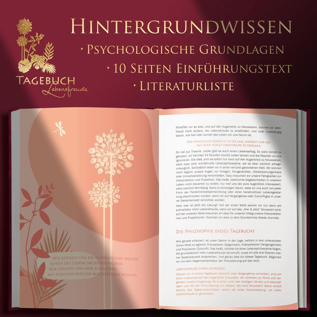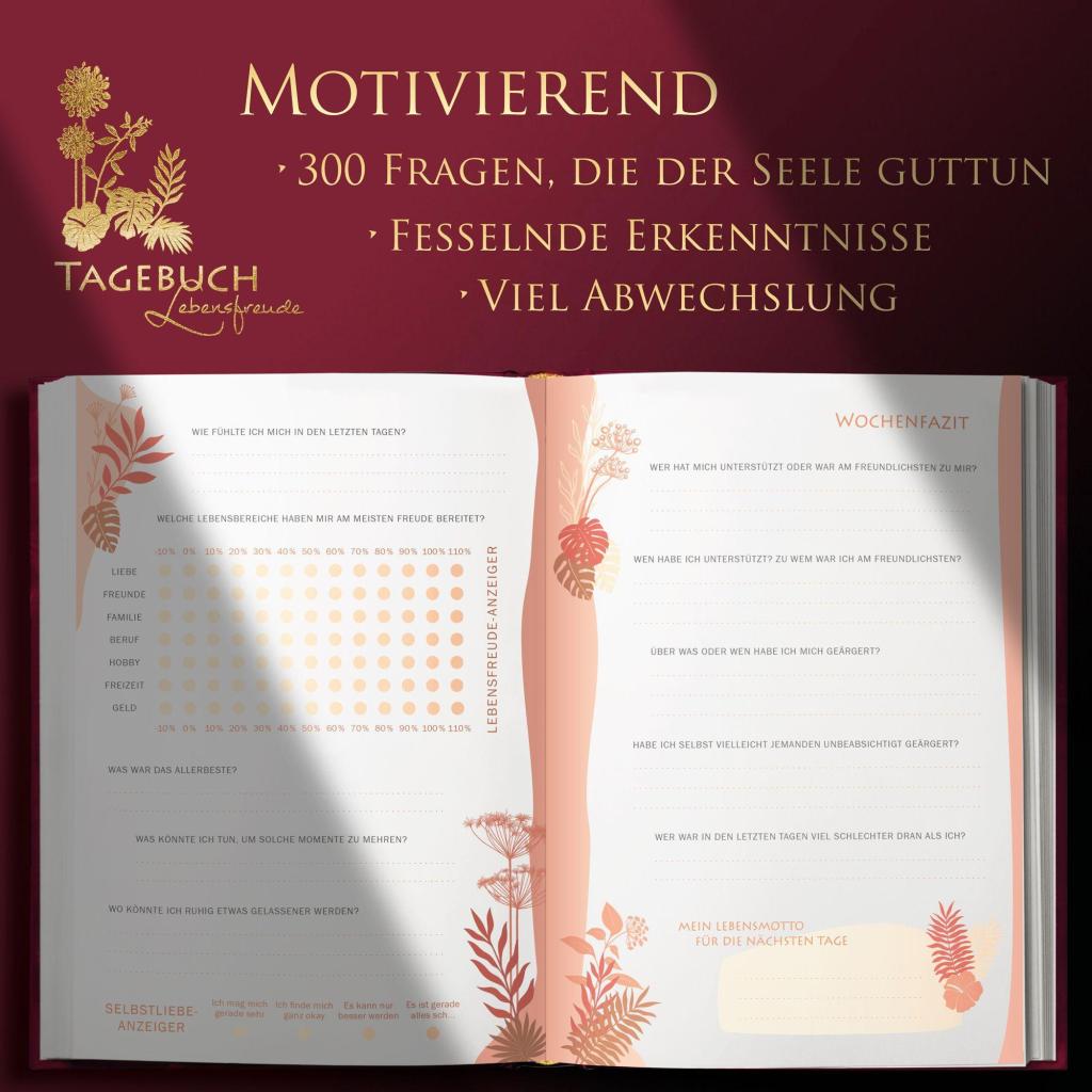 Mit diesem LUCA TAGEBUCH kannst du schnell deine Stimmung heben. Du wirst die große Freiheit kennenlernen, jederzeit selbst entscheiden zu können, in welcher emotionalen Verfassung du sein möchtest - egal, wie verrückt die Welt um dich herum geworden ist. Dieses Werk ist ein Dankbarkeitstagebuch und ein Glücksjournal zugleich. Es wird dir aufzeigen, wie du jederzeit aus dir selbst heraus mehr Lebensfreude erzeugen kannst. Dabei setzt es auf mehrere Strategien der positiven Psychologie: Zum einen wird dir dieses Glücksjournal täglich nur solche Fragen stellen, die in dir schnell schöne Erinnerungen hervorrufen, zum anderen wirst du über 100 verschiedene Affirmationen vorfinden, die negative Glaubenssätze in positive umwandeln können. Hinzu kommen wöchentlich und monatlich wiederkehrende Seiten, auf denen du dich selbst reflektieren und du etwas für deine Persönlichkeitsentwicklung tun kannst. Viel Abwechslung und liebevolle Illustrationen werden zusätzlich deine Stimmung heben und dein Gemüt positiv beeinflussen. All dies wird bewirken, dass negative Gedanken und Gefühle oder unnötige Grübeleien schnell verschwinden werden. Selbstverständlich bietet dir dieses Glücksjournal auch viel Platz für deine eigentlichen Tageseintragungen und sogar für eigene kleine Zeichnungen. Damit du lange Freude daran hast, ist es hochwertig und stabil gebunden. Zudem ist der Umschlag mit Leinengewebe bezogen und mit schönen Goldprägungen versehen.