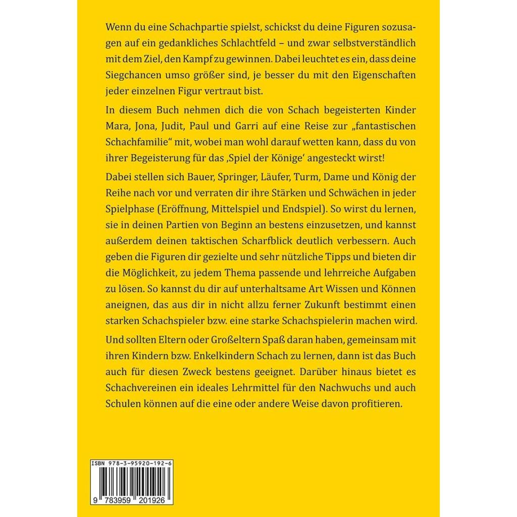 Wenn du eine Schachpartie spielst, schickst du deine Figuren sozusagen auf ein gedankliches Schlachtfeld - und zwar selbstverständlich mit dem Ziel, den Kampf zu gewinnen. Dabei leuchtet es ein, dass deine Siegchancen umso größer sind, je besser du mit den Eigenschaften jeder einzelnen Figur vertraut bist. In diesem Buch nehmen dich die von Schach begeisterten Kinder Mara, Jona, Judit, Paul und Garri auf eine Reise zur "fantastischen Schachfamilie" mit, wobei man wohl darauf wetten kann, dass du von ihrer Begeisterung für das 'Spiel der Könige' angesteckt wirst! Dabei stellen sich Bauer, Springer, Läufer, Turm, Dame und König der Reihe nach vor und verraten dir ihre Stärken und Schwächen in jeder Spielphase (Eröffnung, Mittelspiel und Endspiel). So wirst du lernen, sie in deinen Partien von Beginn an bestens einzusetzen, und kannst außerdem deinen taktischen Scharfblick deutlich verbessern. Auch geben die Figuren dir gezielte und sehr nützliche Tipps und bieten dir die Möglichkeit, zu jedem Thema passende und lehrreiche Aufgaben zu lösen. So kannst du dir auf unterhaltsame Art Wissen und Können aneignen, das aus dir in nicht allzu ferner Zukunft bestimmt einen starken Schachspieler bzw. eine starke Schachspielerin machen wird. Und sollten Eltern oder Großeltern Spaß daran haben, gemeinsam mit ihren Kindern bzw. Enkelkindern Schach zu lernen, dann ist das Buch auch für diesen Zweck bestens geeignet. Darüber hinaus bietet es Schachvereinen ein ideales Lehrmittel für den Nachwuchs und auch Schulen können auf die eine oder andere Weise davon profitieren.