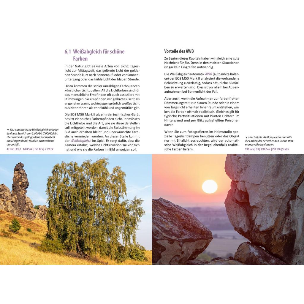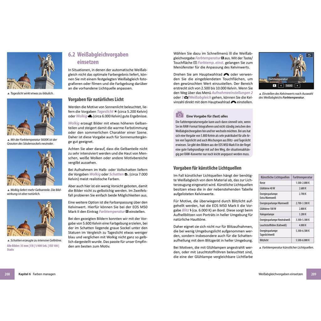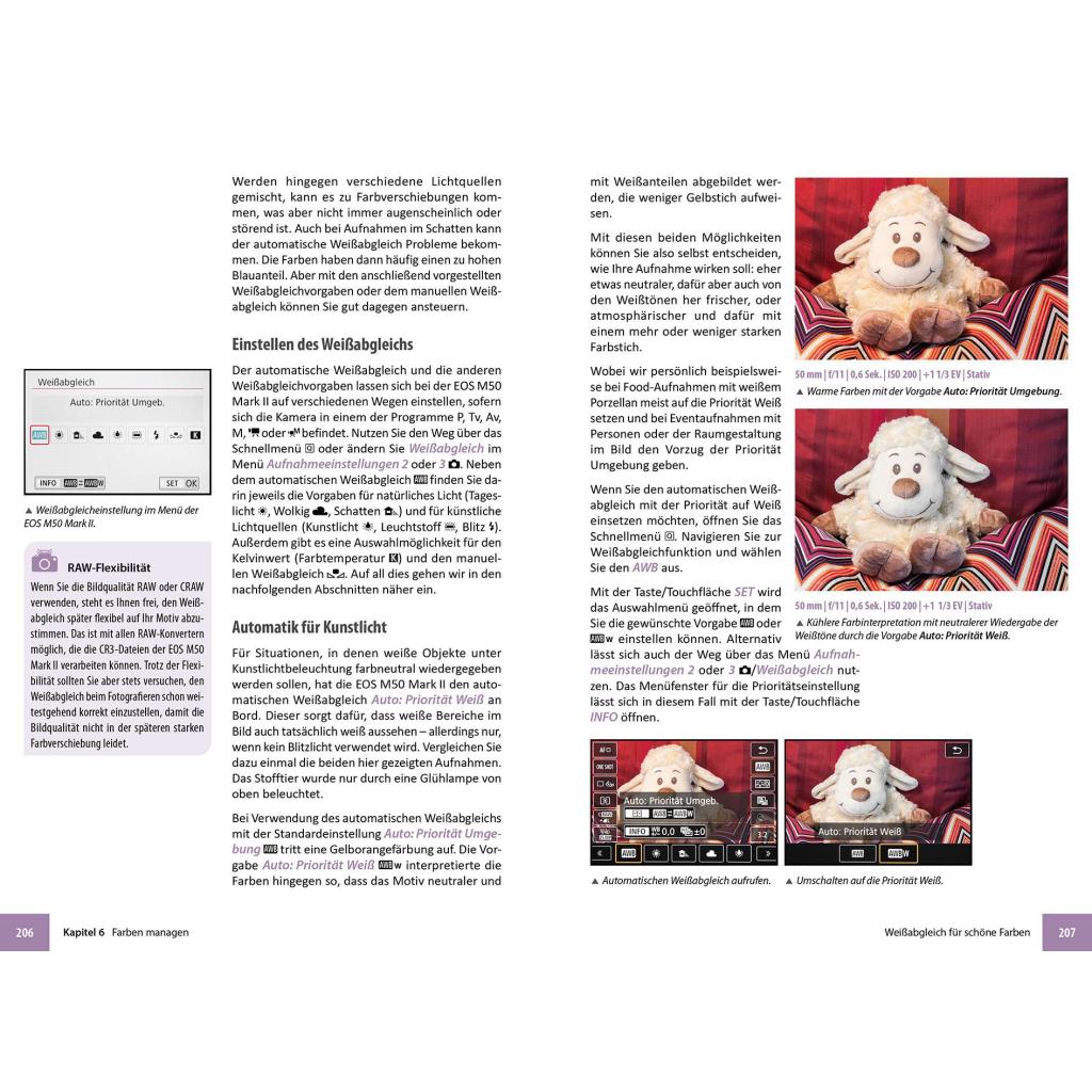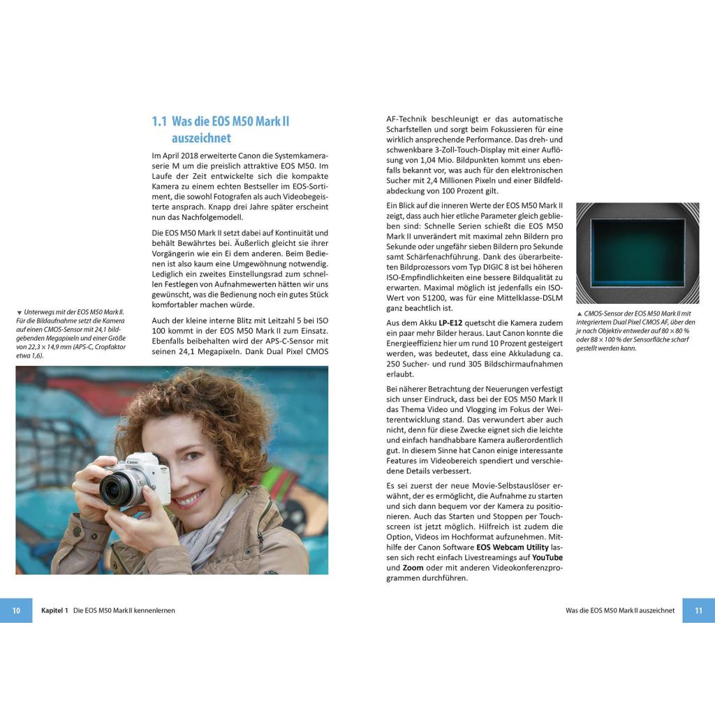 Die Canon EOS M50 Mark II überzeugt als leichte, kompakte Systemkamera in allen wichtigen Punkten. Im Vergleich zum Vorgängermodell wurden einige Features gründlich überarbeitet, wie z. B. die schnelle Augenerkennung und die Möglichkeit, Videos direkt auf YouTube zu streamen. Anhand anschaulicher Anleitungen und vieler leicht nachvollziehbarer Beispiele vermitteln Ihnen die Autoren sowohl das technische Wissen zur Kamera als auch film- und fotografische Fertigkeiten in der Praxis. Dabei kommt der spielerische Einsatz der EOS M50 Mark II nicht zu kurz. Freuen Sie sich auf Profitipps und kreative Anregungen ! Ob Porträt, Landschaft, Architektur oder Makro: Holen Sie in jeder Situation das Maximum aus Ihrer Kamera heraus. Erfahrenen Fotografen über die Schulter geschaut Autofokus, Belichtung und spezielle Funktionen im Detail Menu- und Einstellungstipps für den sofortigen Einsatz Aus dem Inhalt: Was die EOS M50 Mark II auszeichnet Automatische Motiverkennung Filmtagebücher aufzeichnen Kreative Filtereffekte Die Programmautomatiken nutzen Professionell manuell belichten Filmen mit der EOS M50 Mark II Zeitraffer- und Zeitlupenvideos Vier Wege zur guten Belichtung Automatisch richtig scharf stellen Schnelle Bewegungen fokussieren Weißabgleich und Bildstile Systemblitzgeräte gekonnt einsetzen Bildbearbeitung, WLAN und Teilen GPS-Daten in Bilder einfügen Livestreaming direkt auf YouTube Videochat privat oder beruflich Alles zu geeigneten Objektiven Zubehör und Firmware-Update
