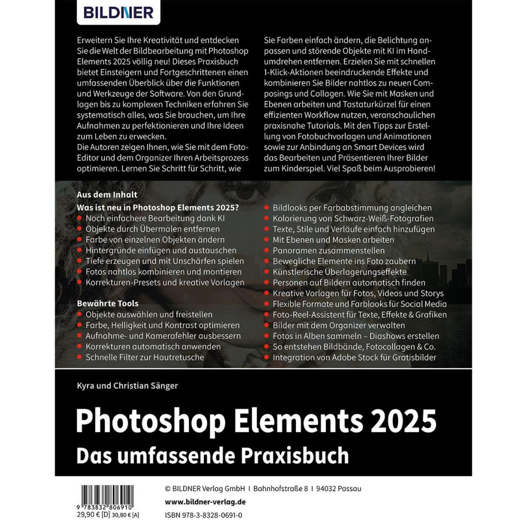 Das umfassende Praxisbuch mit praktischen Tipps & Tricks zur aktuellen Version Die perfekte Bildbearbeitung Schritt für Schritt erklärt Kreative Foto-Reels, Composings, Bildbände, Collagen u. v. m. erstellen Mit kostenlosem Download von Beispielbildern, damit Sie gleich loslegen können Erweitern Sie Ihre Kreativität und entdecken Sie mit Photoshop Elements 2025 die Welt der Bildbearbeitung völlig neu! Dieses Praxisbuch bietet Einsteigern genauso wie erfahrenen Anwendern einen umfassenden Einblick in die Funktionen und Werkzeuge der Software. Von den Grundlagen bis hin zu fortgeschrittenen Techniken lernen Sie systematisch alles, um Ihre Aufnahmen zu perfektionieren und Ihre Visionen zum Leben zu erwecken. Die Autoren zeigen Ihnen, wie Sie mithilfe von Organizer und Fotoeditor Ihren Workflow optimieren. Schritt für Schritt erfahren Sie, wie Sie Farben ganz einfach ändern, die Belichtung anpassen, Objekte entfernen, automatische Korrekturen vornehmen, Bilder retuschieren sowie kombinieren und mit nur einem Klick beeindruckende Effekte erzielen. Anschauliche Anleitungen zeigen, wie Sie mit Masken und Ebenen arbeiten sowie die KI gezielt einsetzen. Erstellen Sie Composings und Collagen und präsentieren Sie Ihre Ergebnisse eindrucksvoll. Mit praktischen Tipps rund um Tastaturkürzel, Anordnung der Bedienfelder und vorgefertigte Aktionen wird die Bearbeitung Ihrer Fotos zum Kinderspiel. Viel Spaß beim Ausprobieren! Aus dem Inhalt: Was ist neu in Photoshop Elements 2025? Noch einfachere Bearbeitung mit KI Objekte durch Übermalen entfernen Farbe von einzelnen Objekten ändern Hintergründe einfügen und austauschen Tiefe erzeugen und mit Unschärfen spielen Fotos nahtlos kombinieren und montieren Korrekturen-Presets und kreative Vorlagen Bewährte Tools Objekte auswählen und freistellen Farbe, Helligkeit und Kontrast optimieren Aufnahme- und Kamerafehler ausbessern Korrekturen automatisch anwenden Schnelle Filter zur Hautretusche Bildlooks per Farbabstimmung angleichen Kolorierung von Schwarz-Weiß-Fotografien Texte, Stile und Verläufe einfach hinzufügen Mit Ebenen und Masken arbeiten Panoramen zusammenstellen Bewegliche Elemente ins Foto zaubern Künstlerische Überlagerungseffekte Personen auf Bildern automatisch finden Kreative Vorlagen für Fotos, Videos und Storys Flexible Formate und Farblooks für Social Media Foto-Reel-Assistent für Texte, Effekte & Grafiken Bilder mit dem Organizer verwalten Fotos in Alben sammeln - Diashows erstellen So entstehen Bildbände, Fotocollagen & Co. Integration von Adobe Stock für Gratisbilder