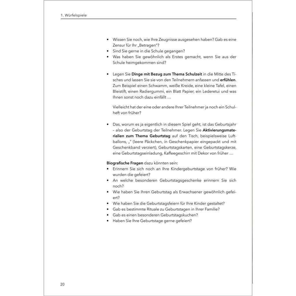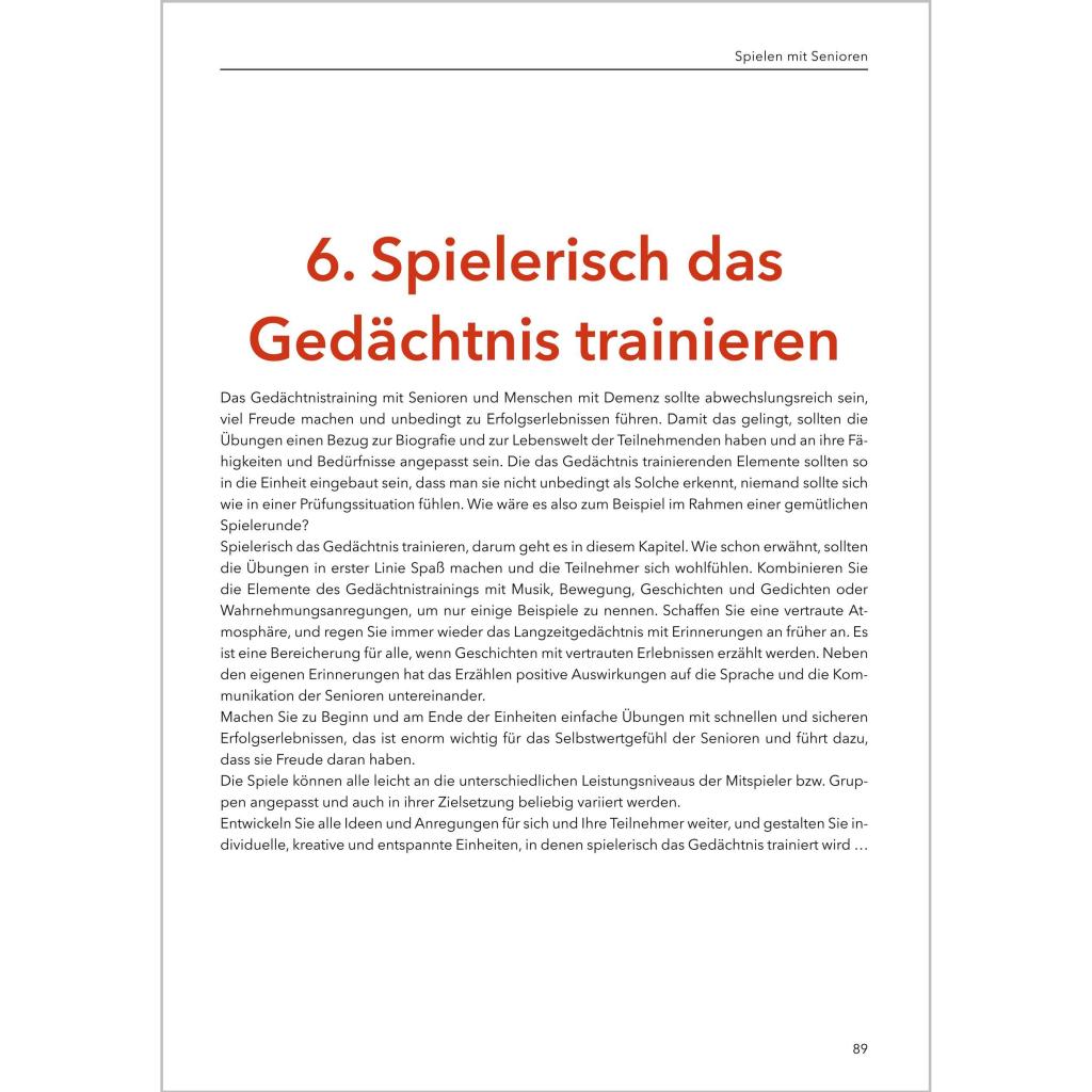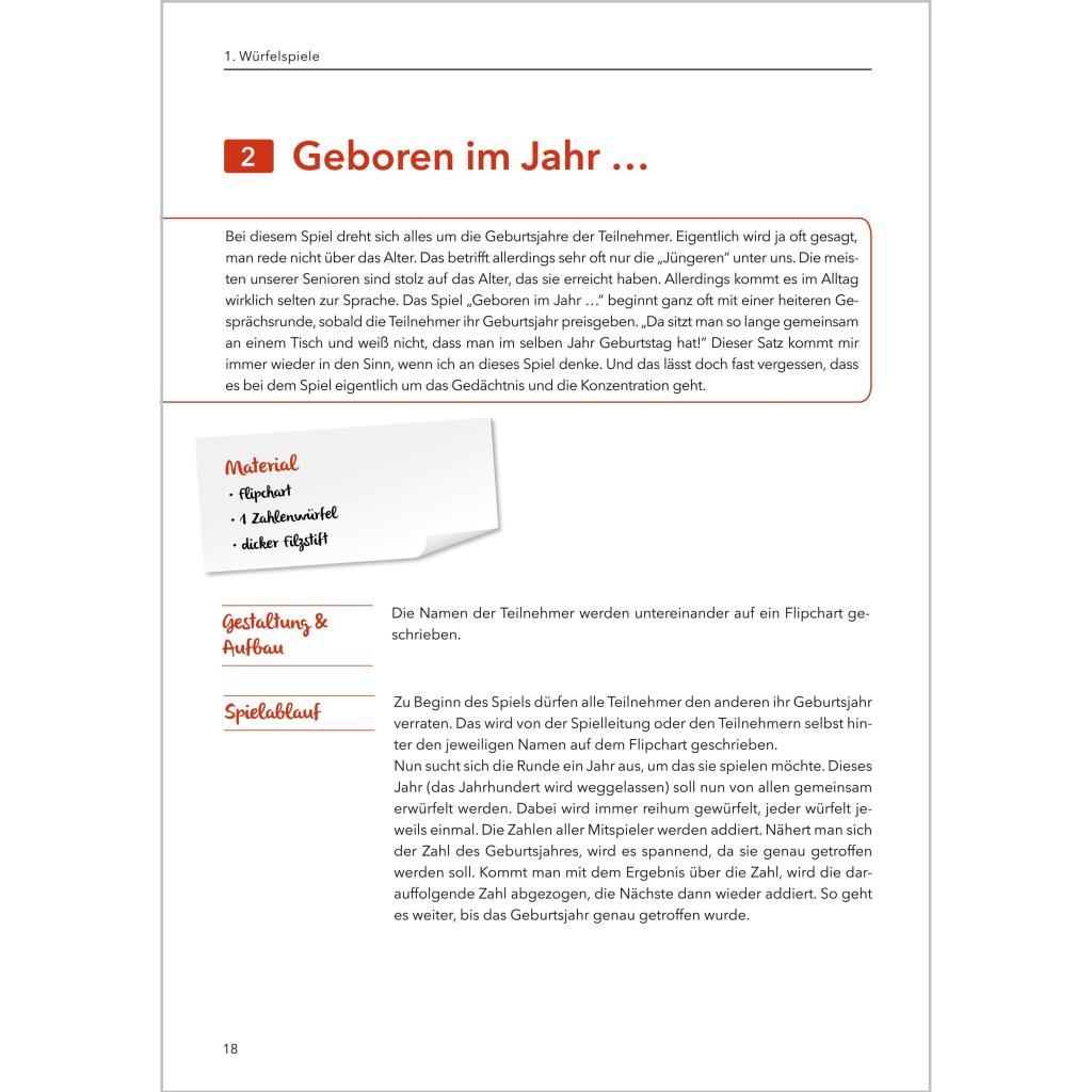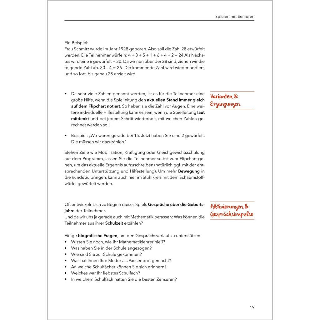 Spielen mit Senioren - Das Praxisbuch (Band 2) Dieses Praxisbuch ist eine wahre Fundgrube für die Beschäftigung von Menschen mit Demenz. Vorgestellt werden Zuordnungs-, Bewegungs-, Sinnesspiele und viele andere - alle in der Praxis erprobt. Jedes Spiel kann von Betreuungs- und Pflegekräften sowie von Angehörigen individuell gestaltet und an eigene Bedürfnisse angepasst werden. Im Mittelpunkt stehen immer die ganz unterschiedlichen Fähigkeiten und Bedürfnisse der Senioren. Abwechslungsreiche Spiele und Beschäftigungsideen: ¿ Würfelspiele ¿ Spiele-Klassiker ¿ Zuordnungsspiele ¿ Bewegungsspiele ¿ Bewegungsgeschichten ¿ Puzzles ¿ Spiele für alle Sinne ¿ Spielerisch das Gedächtnis trainieren + Mit Kopiervorlagen + Spielideen mit und ohne Materialien + Plus Varianten, Ergänzungen und Gesprächsimpulse Dieses Standardwerk enthält die schönsten Spiel- und Beschäftigungsideen , die alle in der Praxis entstanden und vielfach erprobt sind.