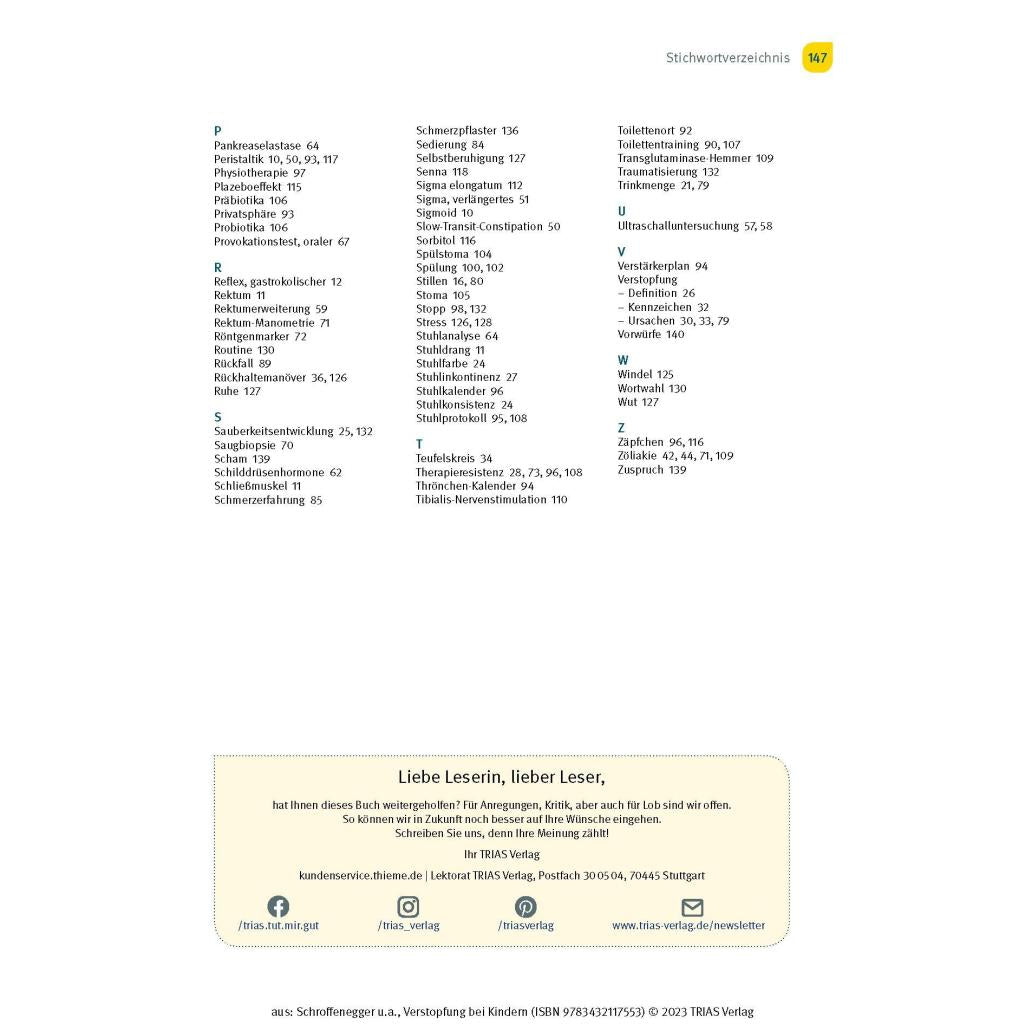 | Keyword: | Abführmittel; Beckenboden; Darm; Enkopresis; Flohsamen; Lactulose; Laxantien; Morbus Hirschsprung; Obstipation; Prokinetika; Stuhlgang; Stuhlinkontinenz; Verstopfung; Verstopfung Baby; Verstopfung Kleinkind; Verstopfung bei Kindern; Zöliakie |